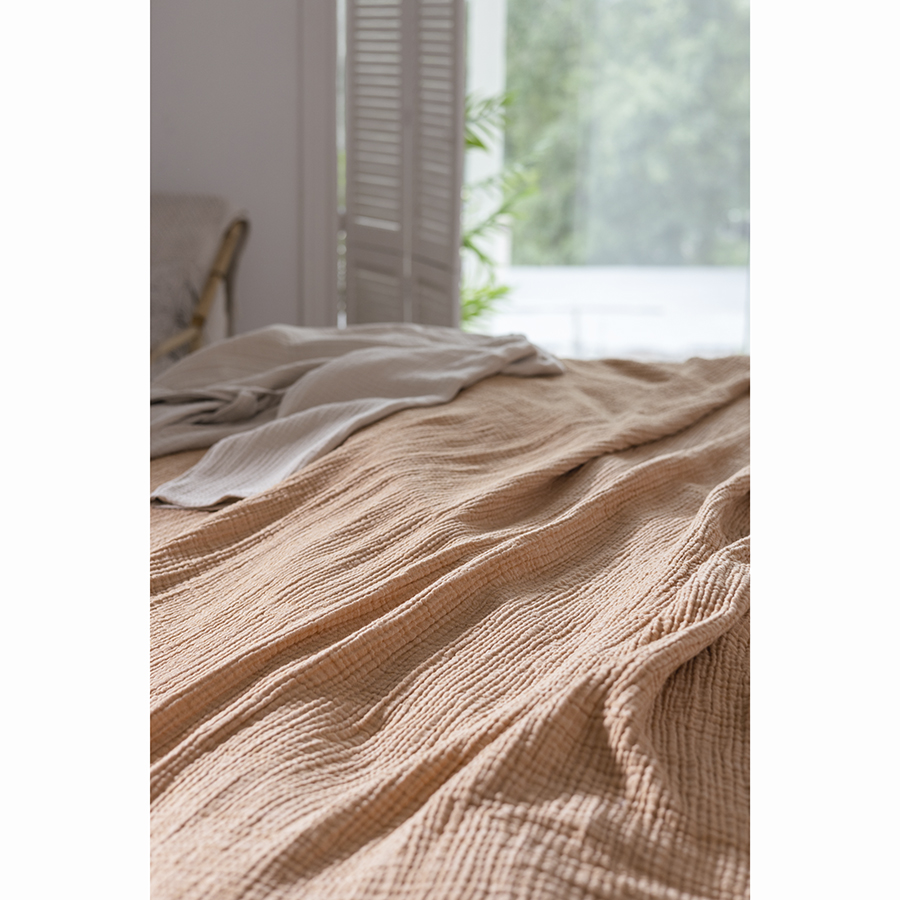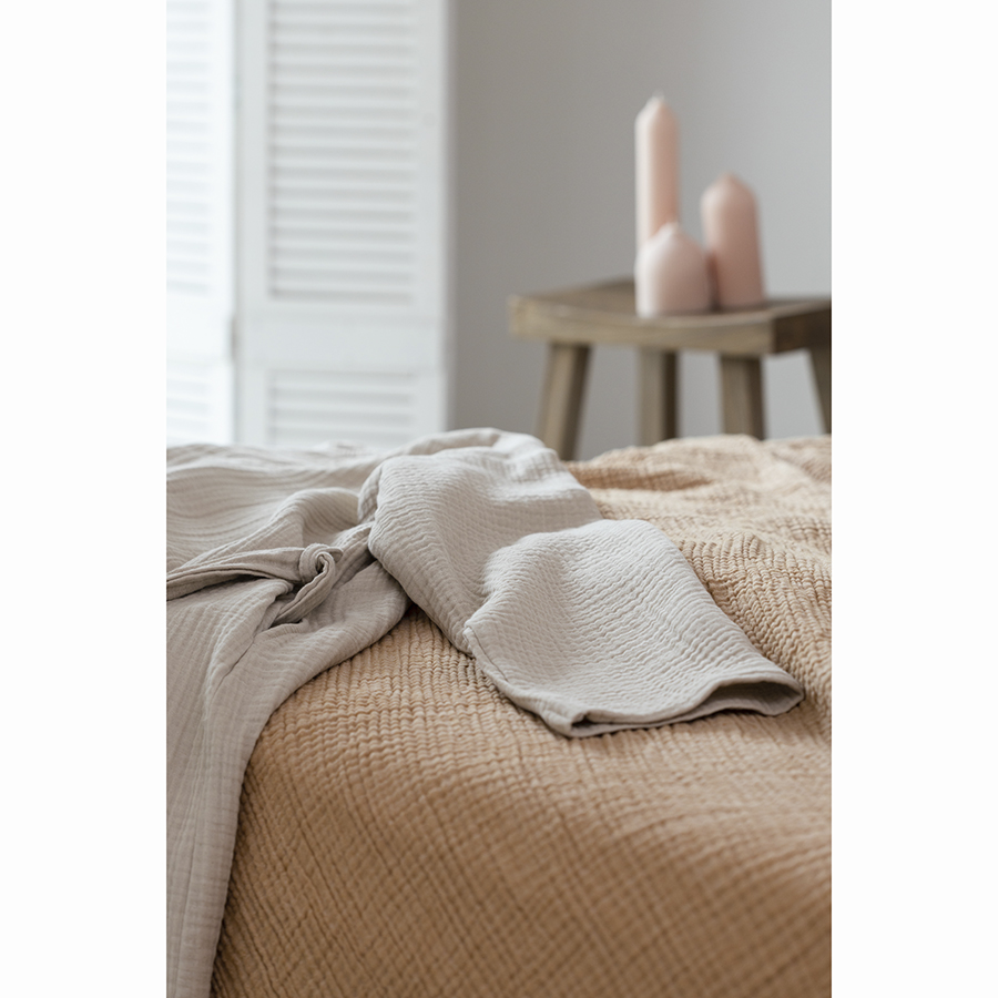 "Покрывало двухсторонее из многослойного муслина цвета охры из коллекции Essential сделает интерьер спальни уютным и подарит чувство комфорта при использовании. Легкий, дышащий материал на основе экологичного хлопкового волокна приятный на ощупь, хорошо впитывает влагу, не электризуется и не вызывает аллергию. За счет специального переплетения нитей в каждом из четырех слоев ткань имеет интересную фактуру, обладает высокой плотностью, устойчивостью к износу, не скатывается и хорошо держит форму. Элегантная простота муслинового покрывала позволяет вписать его в различные стилевые решения интерьера: сканди, кантри, прованс, эклектика, бохо, эко, минимализм и другие.