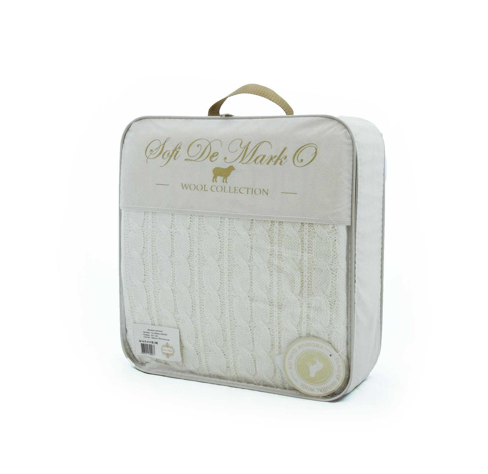 Плед вязанныйРазмер: 220х240Состав: Шерсть 70% Хлопок 30%Уход: Стирка 30'Упаковка: Текстильная сумка