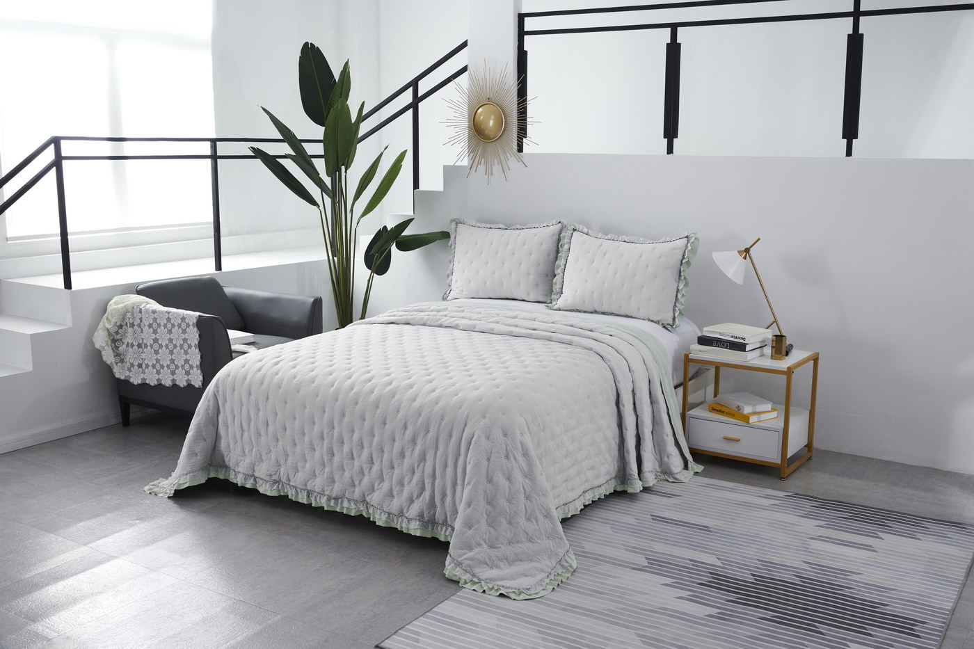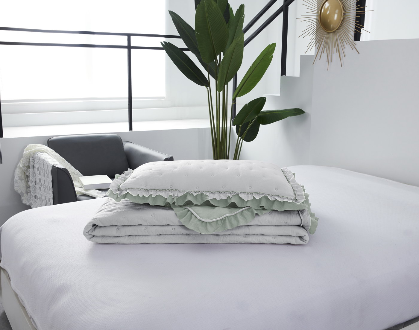 Покрывало ультрастеп двустороннееКомплектация:Покрывало: 230х250см (1шт)Наволочка: 50х70см (2шт)Состав ткани: 70% хлопок, 30% вискозаНаполнитель: микроволокноПлотность наполнителя: 100гр/м2Особенность: рюша на наволочках и покрывале; двустороннее использованиеУход: стирка 30'Упаковка: сумка ПВХ