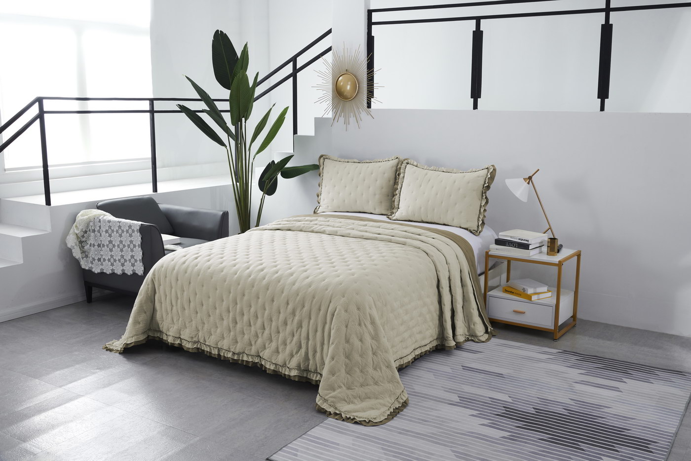 Покрывало ультрастеп двустороннееКомплектация:Покрывало: 160х220см (1шт)Наволочка: 50х70см (1шт)Состав ткани: 70% хлопок, 30% вискозаНаполнитель: микроволокноПлотность наполнителя: 100гр/м2Особенность: рюша на наволочках и покрывале; двустороннее использованиеУход: стирка 30'Упаковка: сумка ПВХ