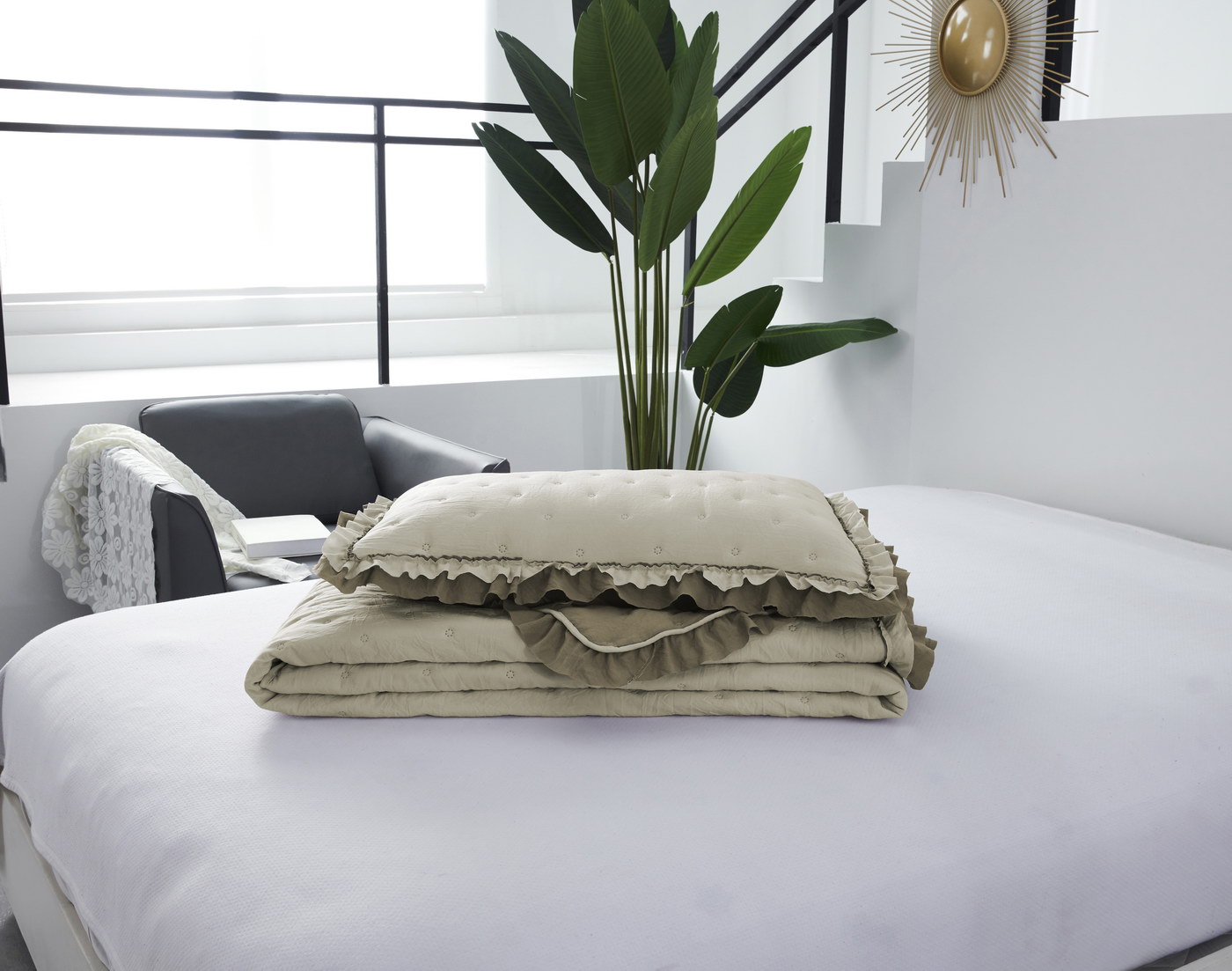 Покрывало ультрастеп двустороннееКомплектация:Покрывало: 230х250см (1шт)Наволочка: 50х70см (2шт)Состав ткани: 70% хлопок, 30% вискозаНаполнитель: микроволокноПлотность наполнителя: 100гр/м2Особенность: рюша на наволочках и покрывале; двустороннее использованиеУход: стирка 30'Упаковка: сумка ПВХ