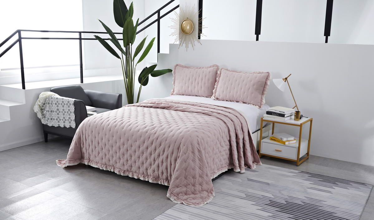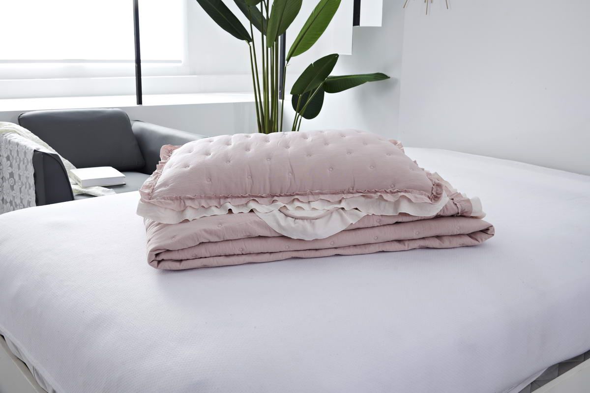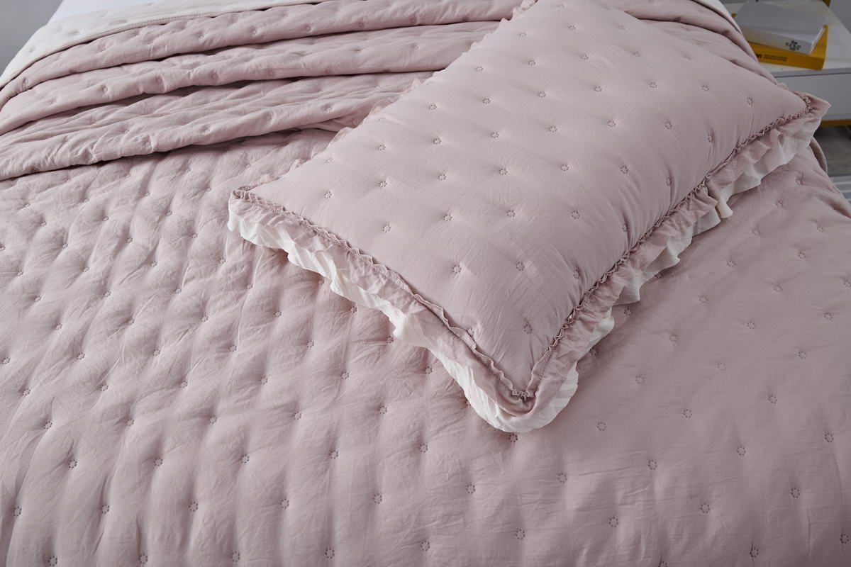 Покрывало ультрастеп двустороннееКомплектация:Покрывало: 160х220см (1шт)Наволочка: 50х70см (1шт)Состав ткани: 70% хлопок, 30% вискозаНаполнитель: микроволокноПлотность наполнителя: 100гр/м2Особенность: рюша на наволочках и покрывале; двустороннее использованиеУход: стирка 30'Упаковка: сумка ПВХ