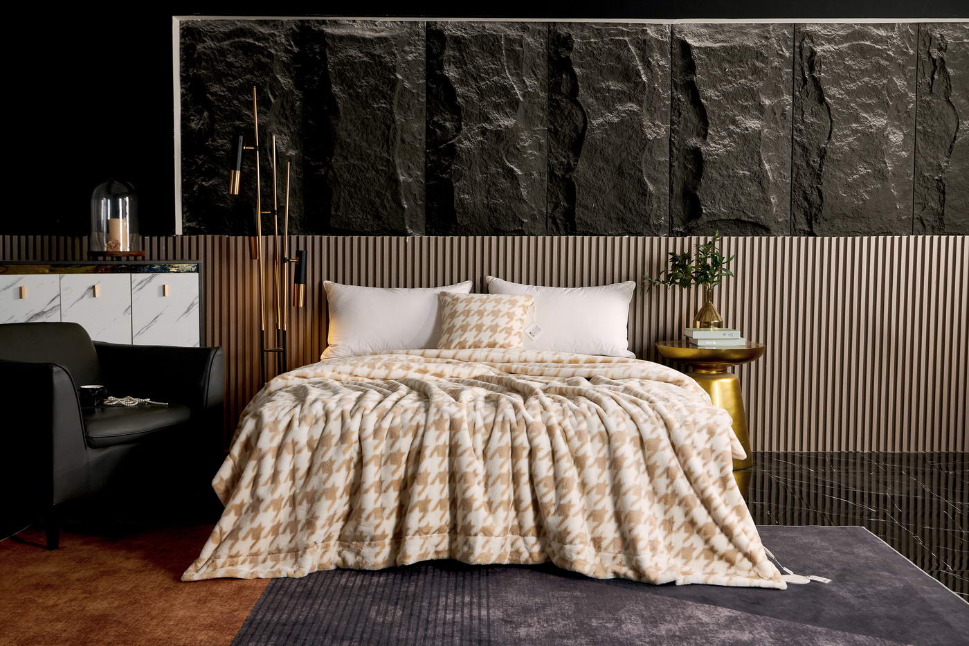 Покрывало декоративноеРазмер: 160х220 (1шт);Ткань: искусственный мех с принтомПлотность: 620 гр/м2Состав: 100% полиэстер;Упаковка: текстильная сумка;Уход: Стирка 30°C