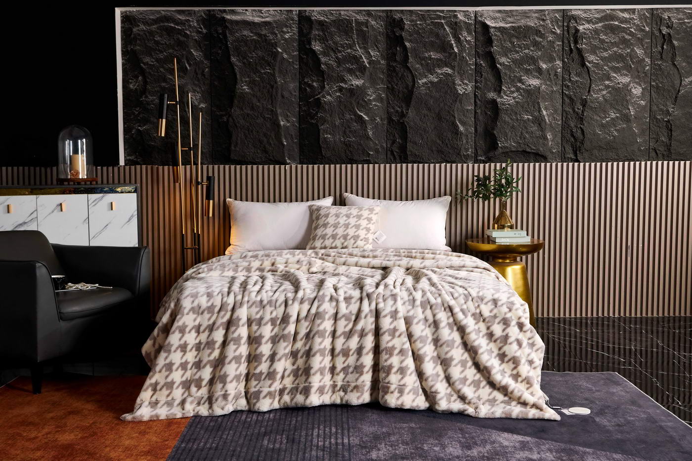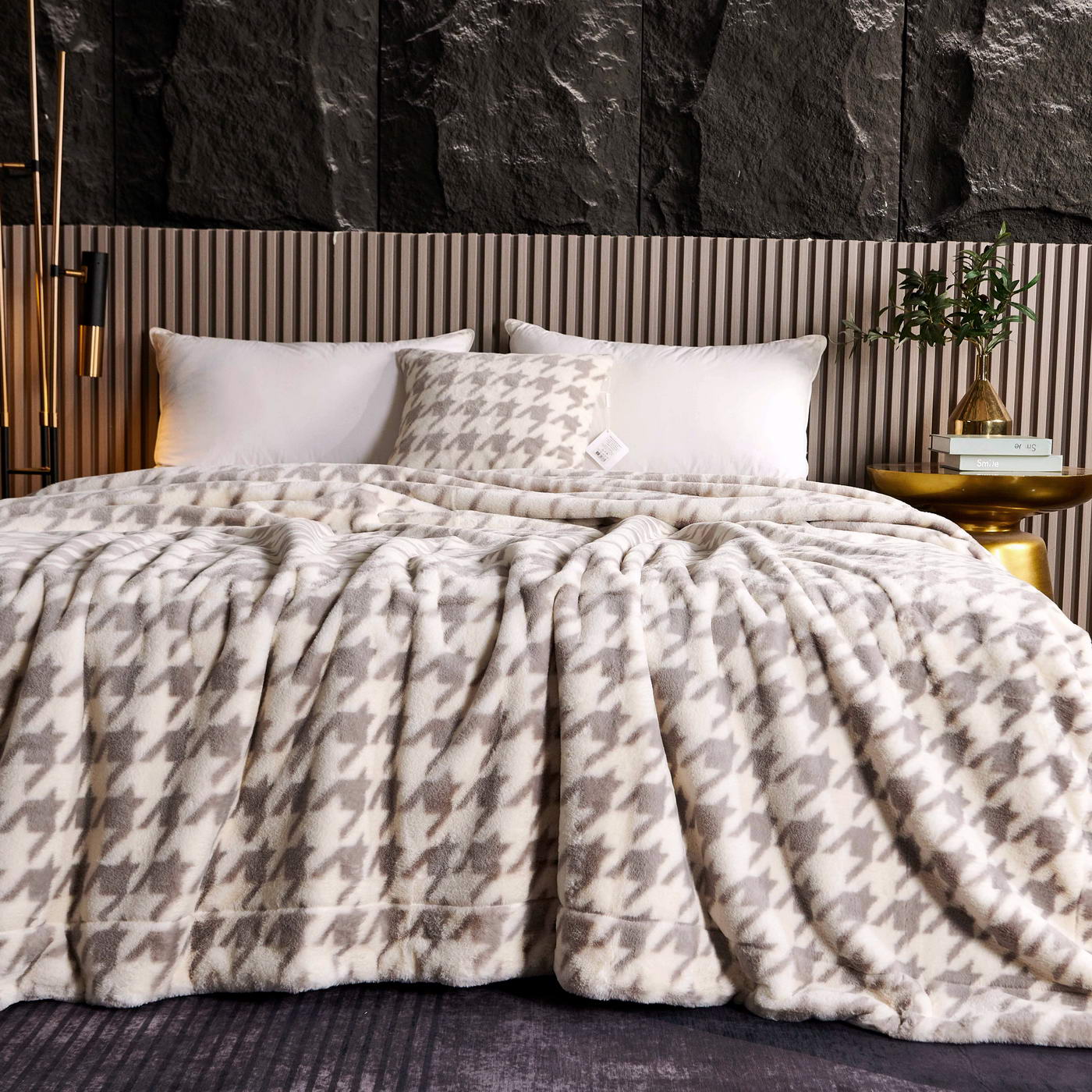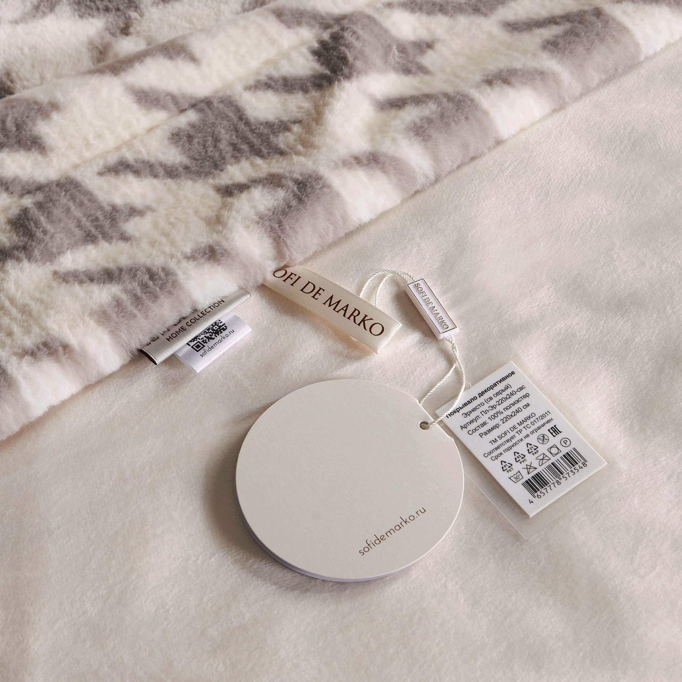 Покрывало декоративноеРазмер: 220х240 (1шт);Ткань: искусственный мех с принтомПлотность: 620 гр/м2Состав: 100% полиэстер;Упаковка: текстильная сумка;Уход: Стирка 30°C