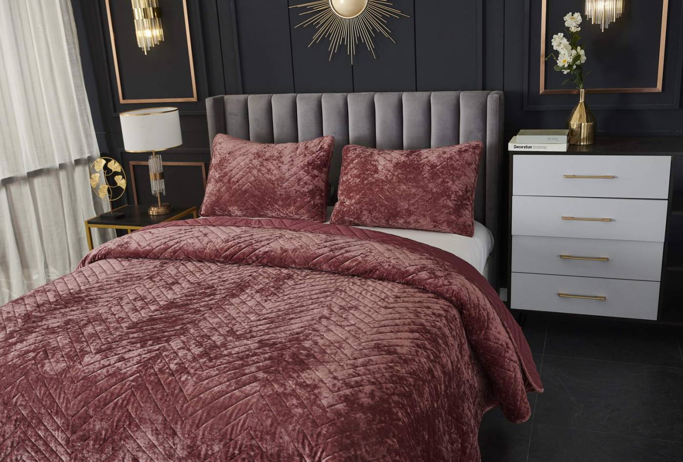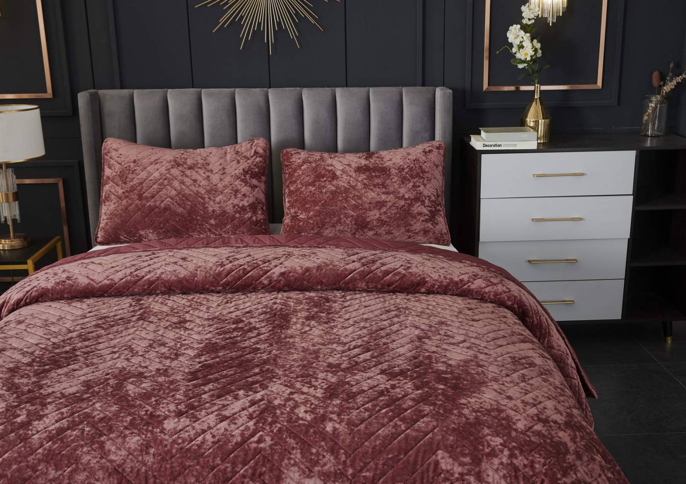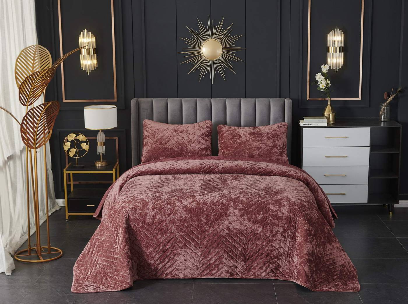 ПокрывалоКомплектация:Покрывало: 240х260Наволочки: 50х70 (2шт)Ткань: бархатОсобенность: термостежка Состав: 100% ВискозаУпаковка: текстильная сумкаУход. Стирка 30'