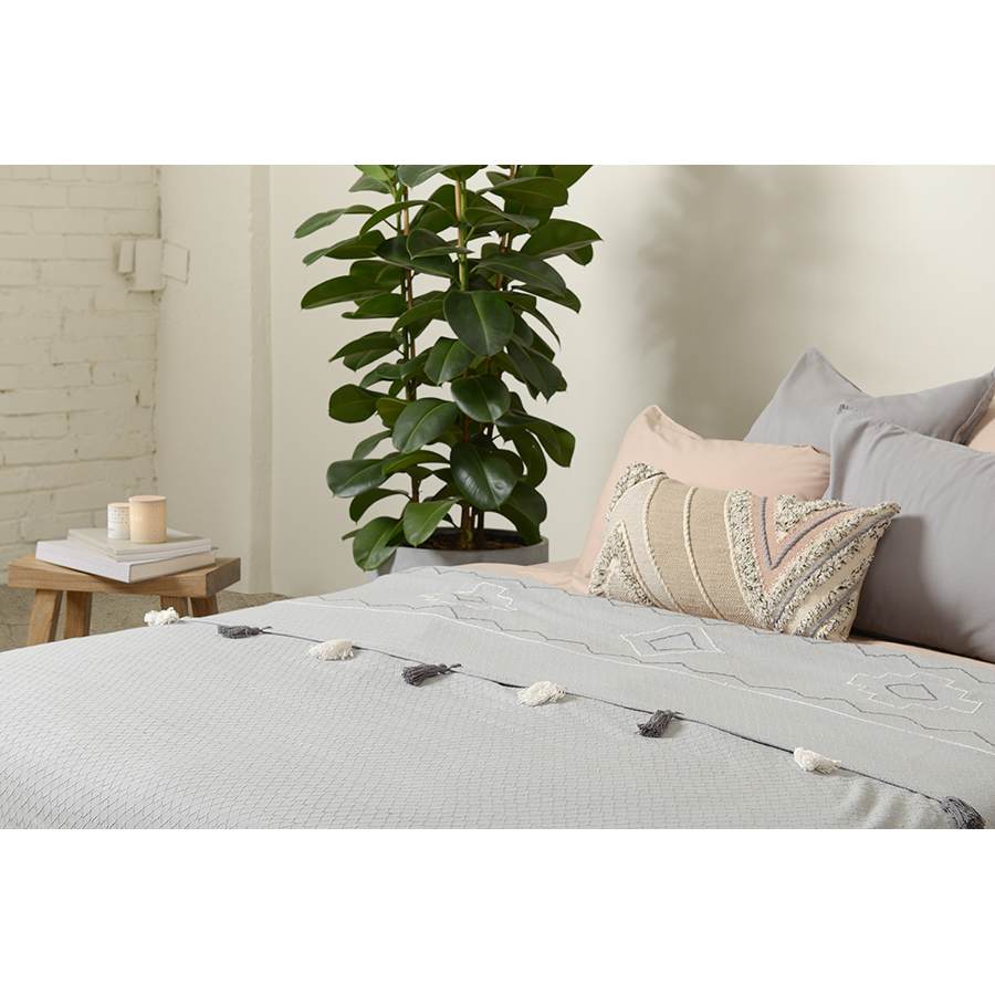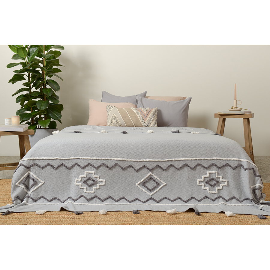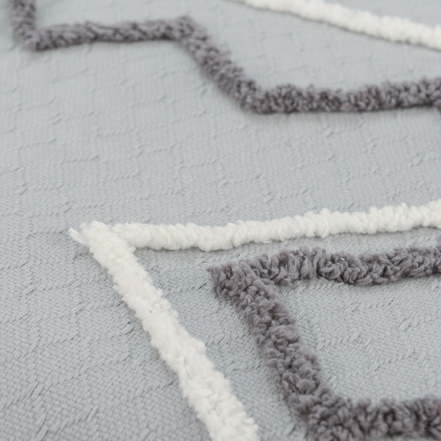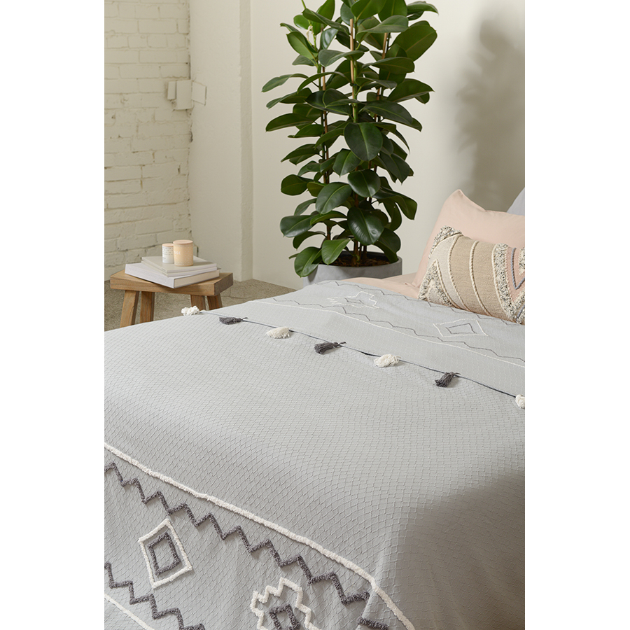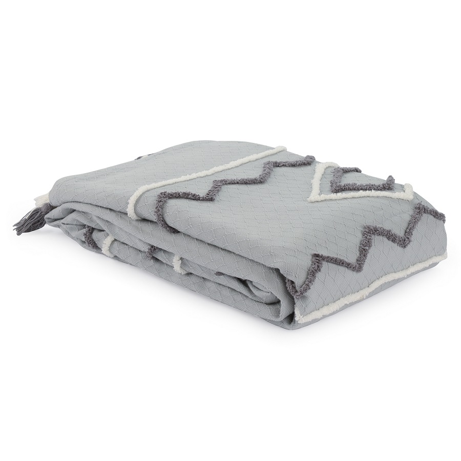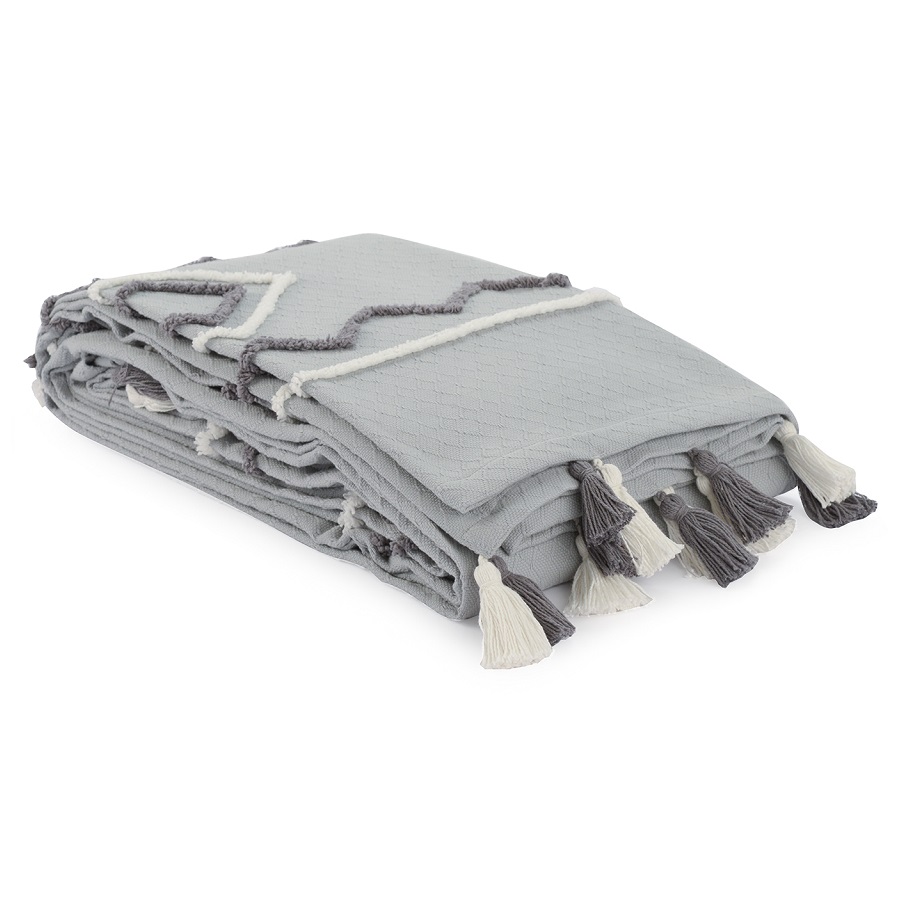 "Покрывало из хлопка серо-голубого цвета с контрастным этническим орнаментом из коллекции Ethnic украшено бахромой и объемными кисточками. Это изделие станет ярким акцентом в скандинавском интерьере или дополнит колоритный этно-стиль вашей квартиры или дома. Изделие из прочного гипоаллергенного хлопка не электризуется и приятно на ощупь. Покрывало упаковано в брендированную крафтовую коробку.