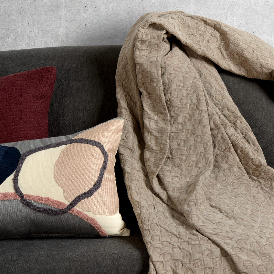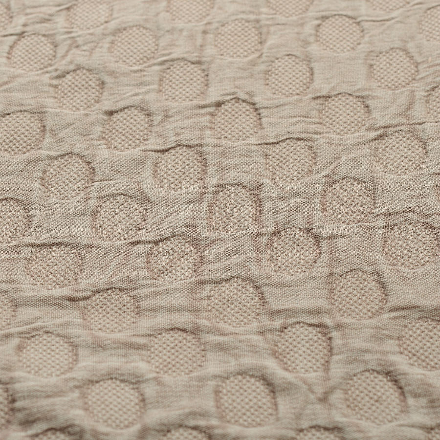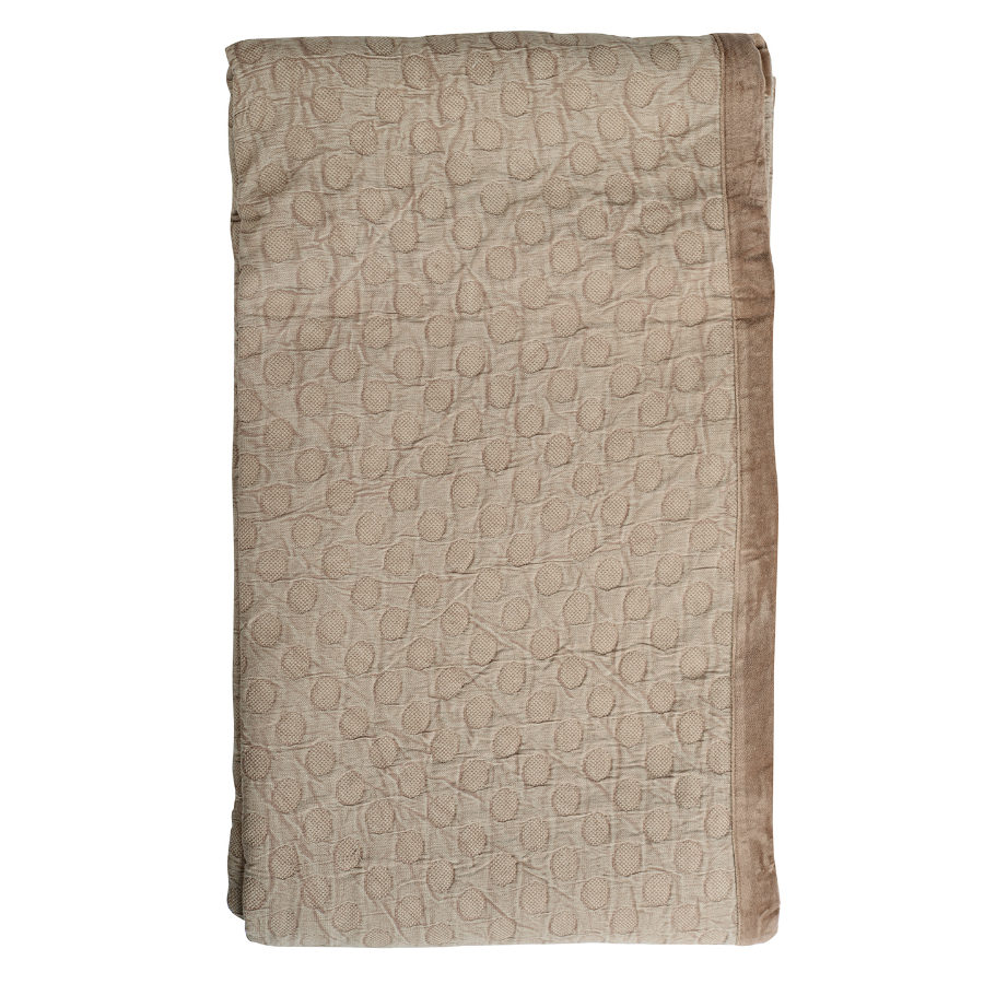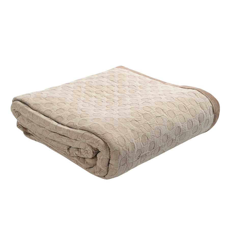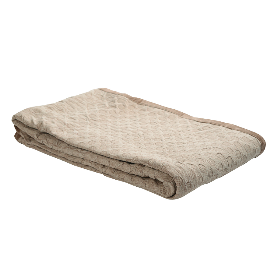 "Покрывало базового бежевого оттенка выполнено из прочного стираного хлопка. Материал, обработанный по специальной технологии, более мягкий и нежный. Гипоаллергенное полотно хорошо пропускает воздух, не электризуется, и на нем не образуются катышки.