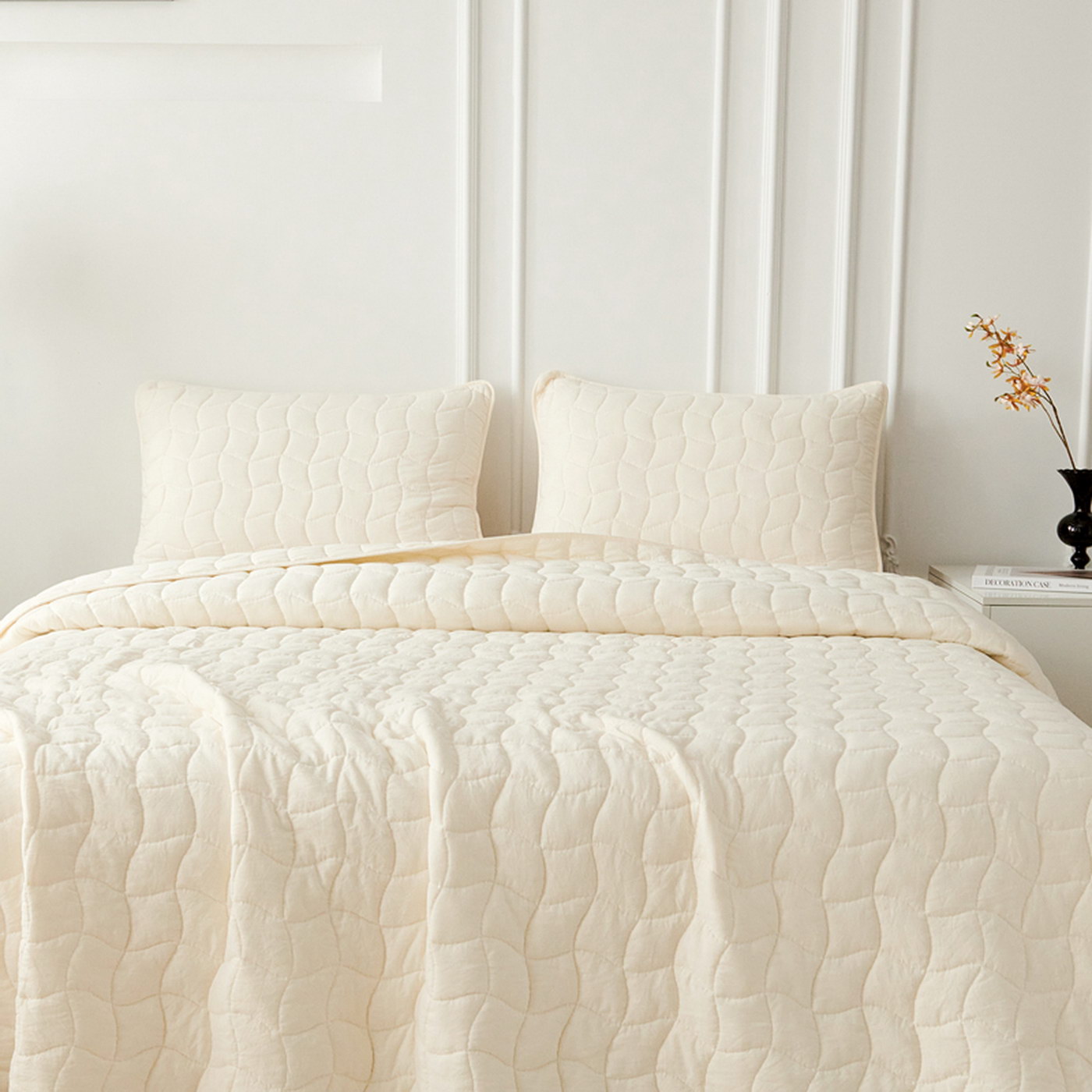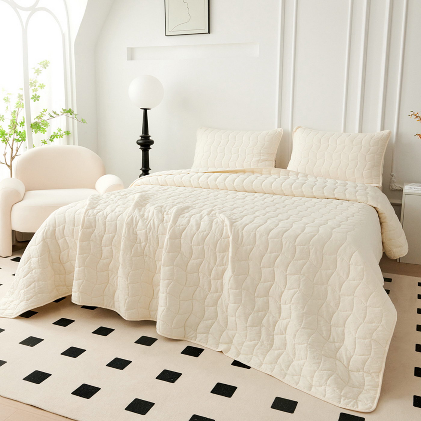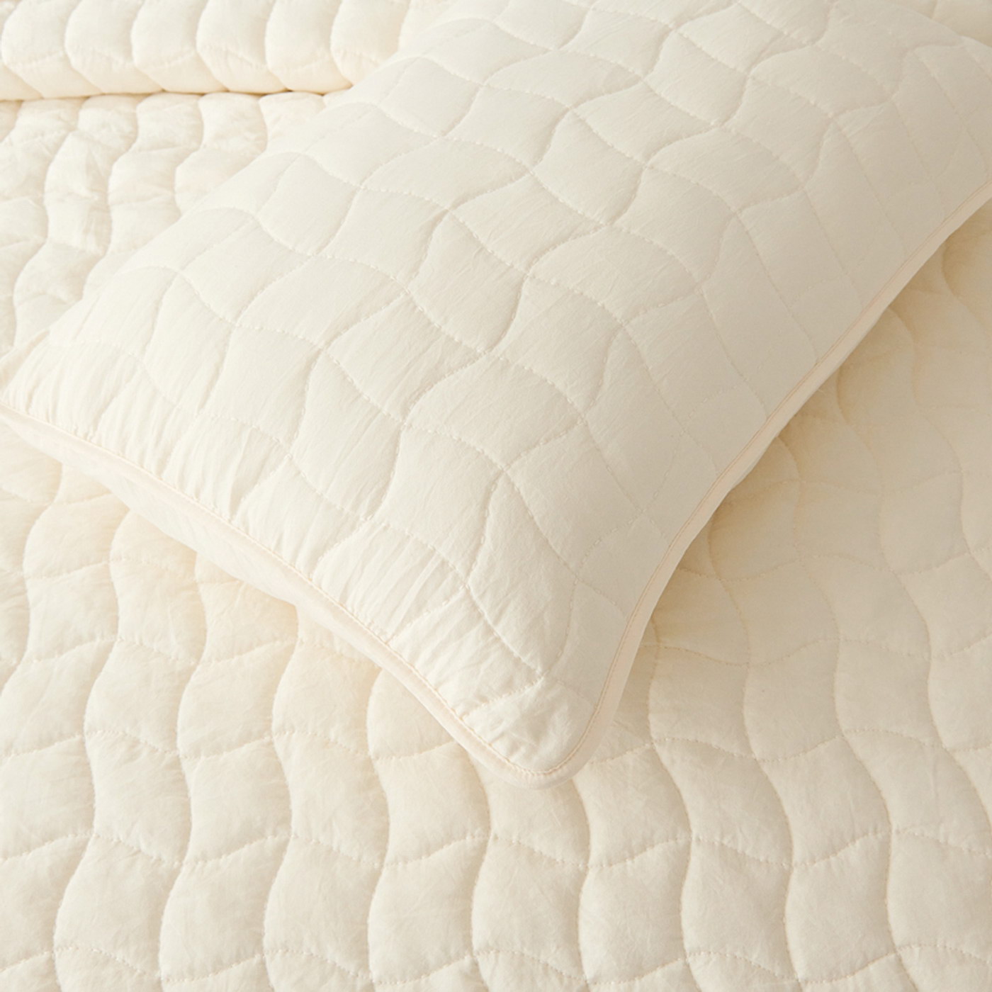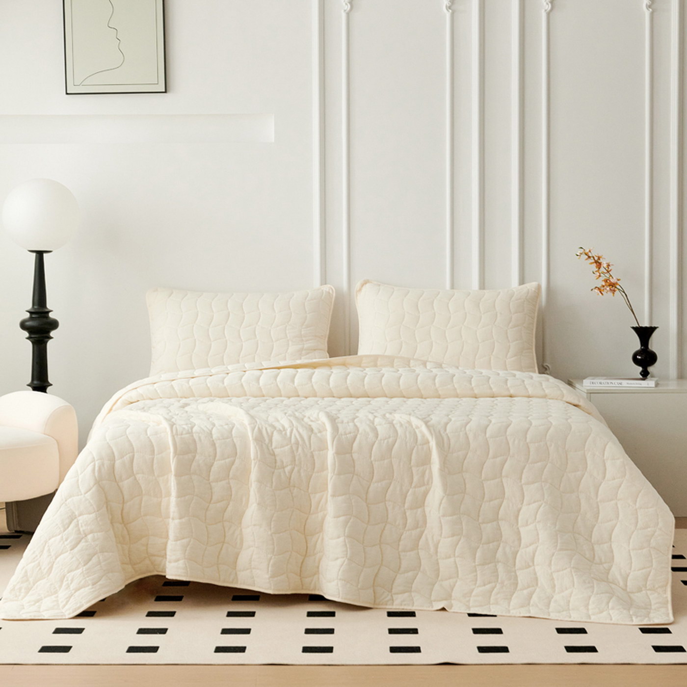 Покрывало с эффектом жаткиКомплектация:Покрывало: 230х250см (1шт)Наволочка: 50х70см (2шт)Состав ткани: 70% хлопок, 30% вискоза;Наполнитель: микроволокно;Плотность наполнителя: 100гр/м;Уход: стирка 30';Упаковка: сумка ПВХ.
