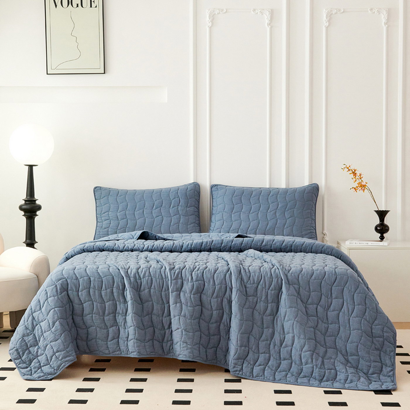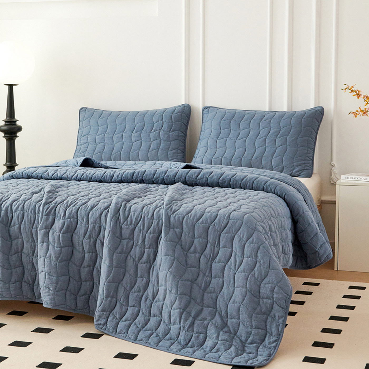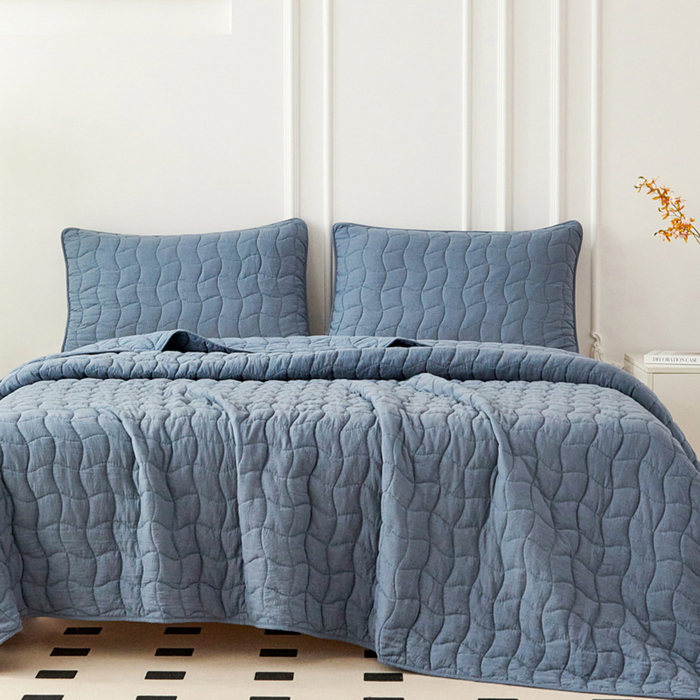 Покрывало с эффектом жаткиКомплектация:Покрывало: 230х250см (1шт)Наволочка: 50х70см (2шт)Состав ткани: 70% хлопок, 30% вискоза;Наполнитель: микроволокно;Плотность наполнителя: 100гр/м;Уход: стирка 30';Упаковка: сумка ПВХ.