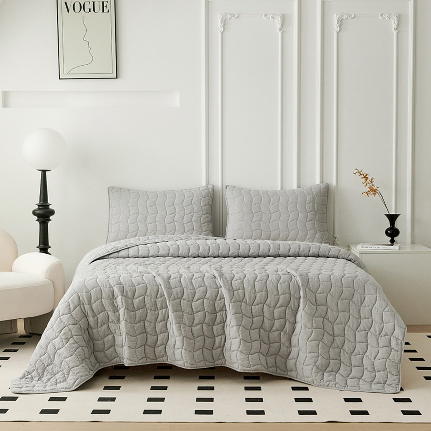 Покрывало с эффектом жаткиКомплектация:Покрывало: 230х250см (1шт)Наволочка: 50х70см (2шт)Состав ткани: 70% хлопок, 30% вискоза;Наполнитель: микроволокно;Плотность наполнителя: 100гр/м;Уход: стирка 30';Упаковка: сумка ПВХ.