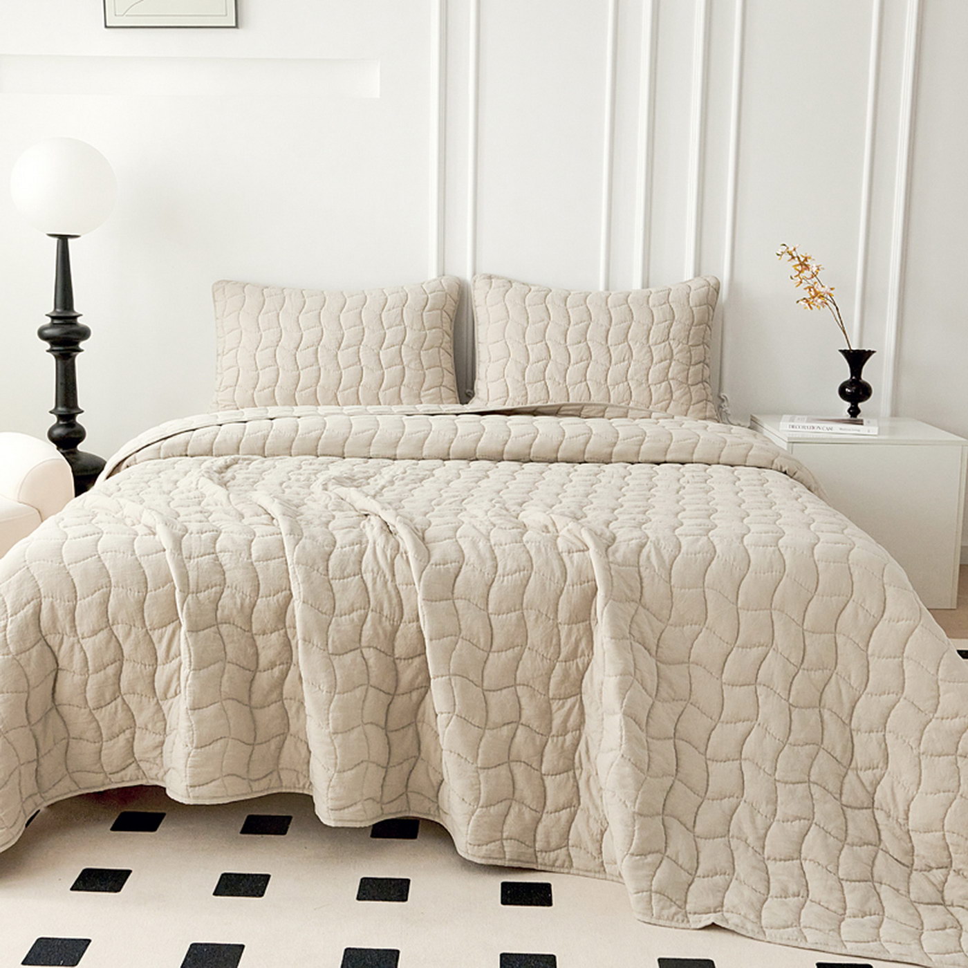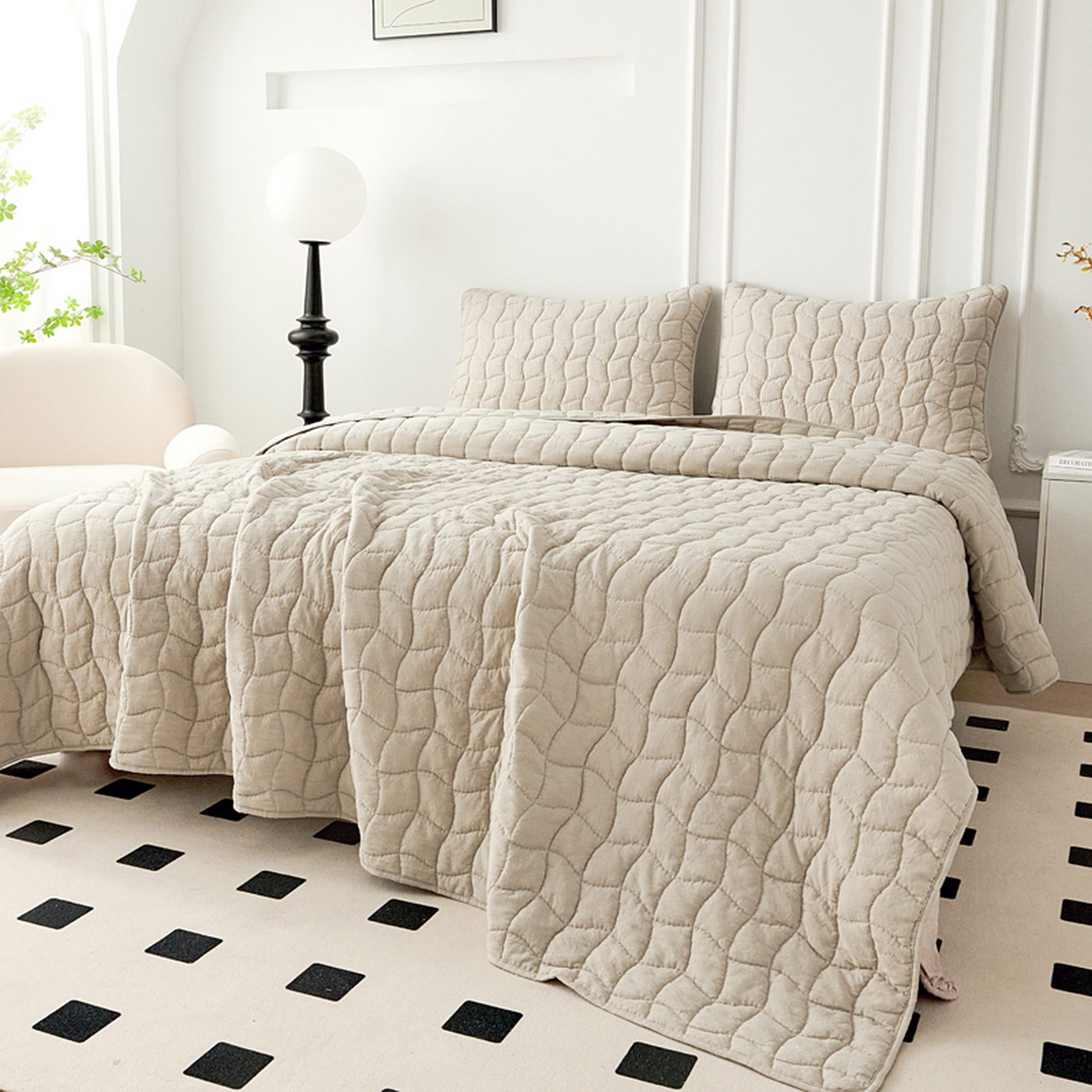 Покрывало с эффектом жаткиКомплектация:Покрывало: 230х250см (1шт)Наволочка: 50х70см (2шт)Состав ткани: 70% хлопок, 30% вискоза;Наполнитель: микроволокно;Плотность наполнителя: 100гр/м;Уход: стирка 30';Упаковка: сумка ПВХ.