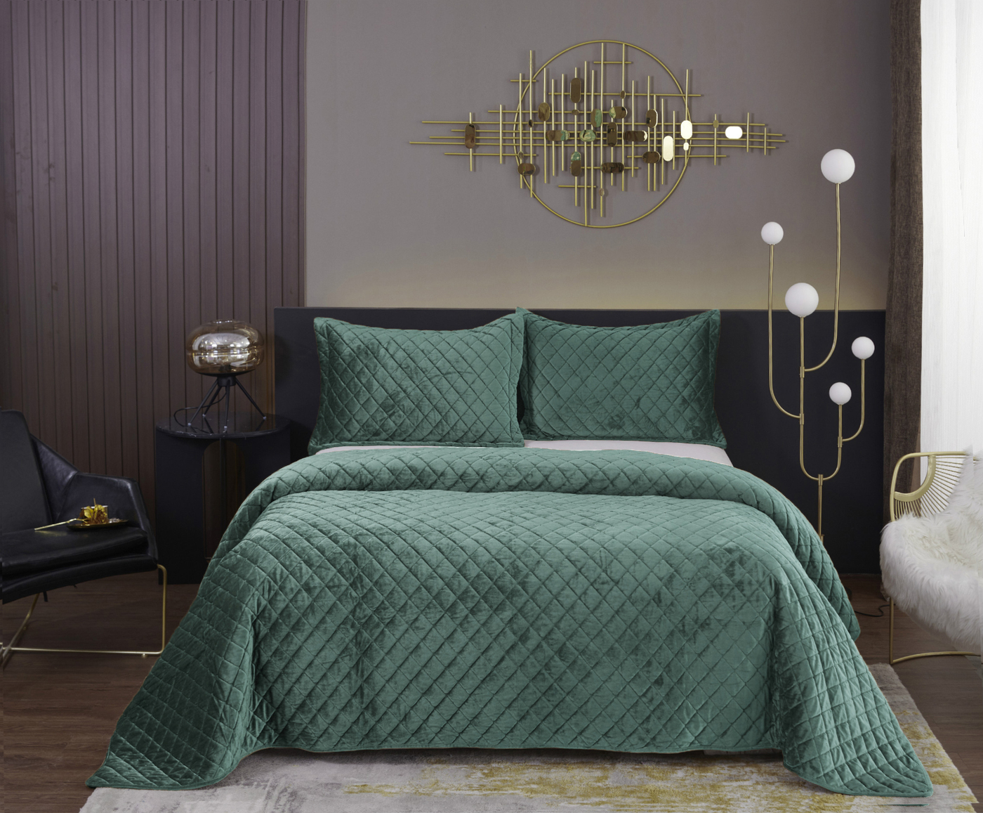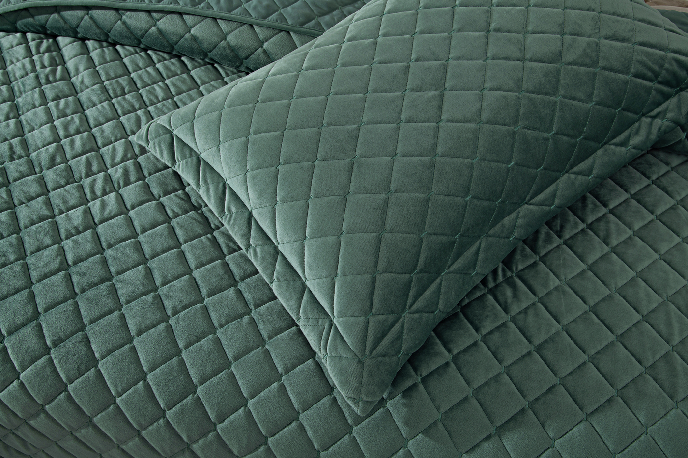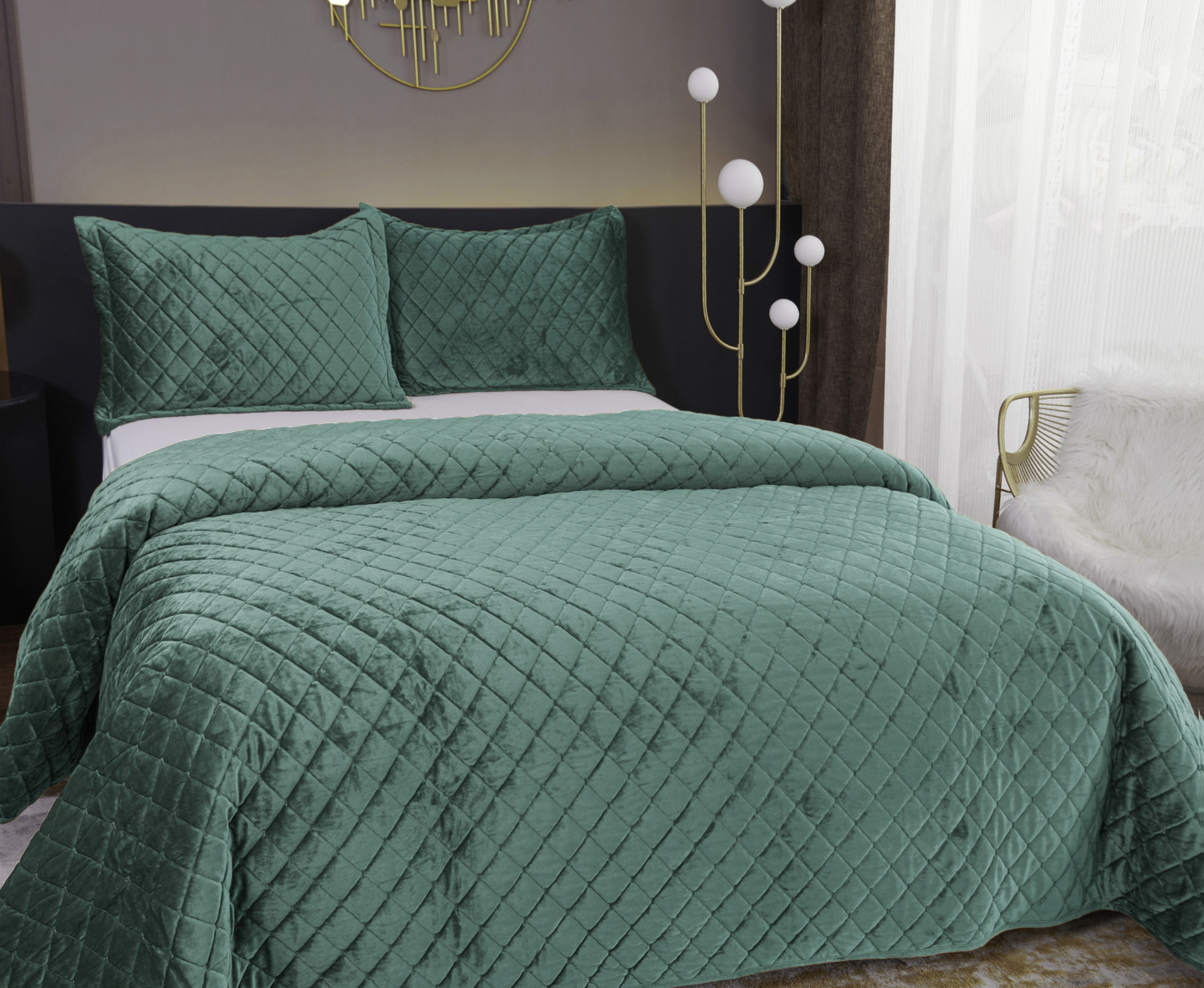 Покрывало стеганное, стежка - ромбТкань: велюр; Состав: 100% вискоза; Комплектация:Покрывало: 240х260см (1);Наволочки: 50х70см (2); Плотность: 200/160/70Уход : Стирка 30-40с°;Упаковка: Текстильная сумка.