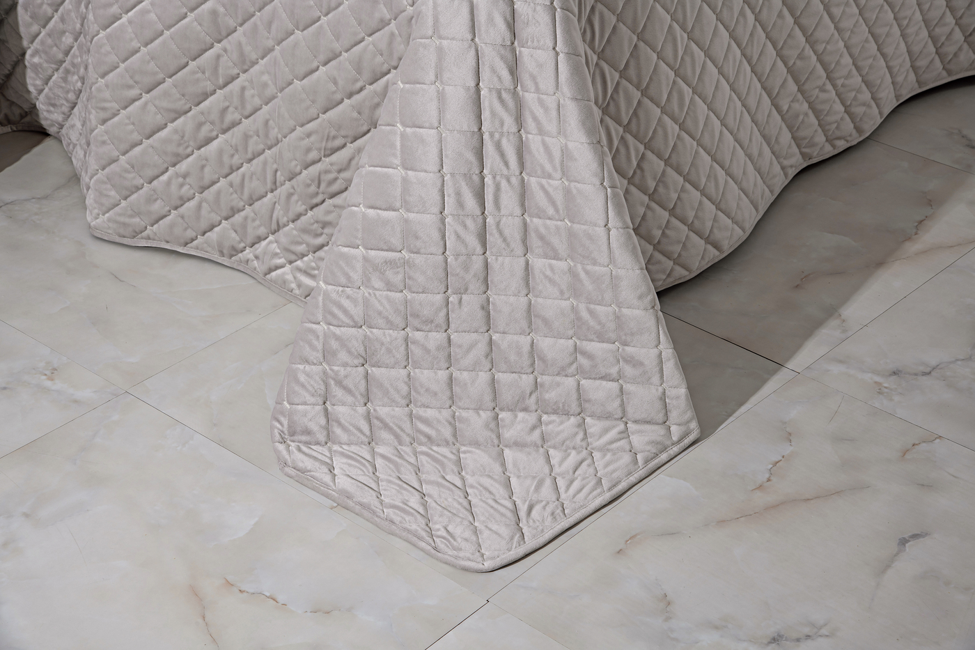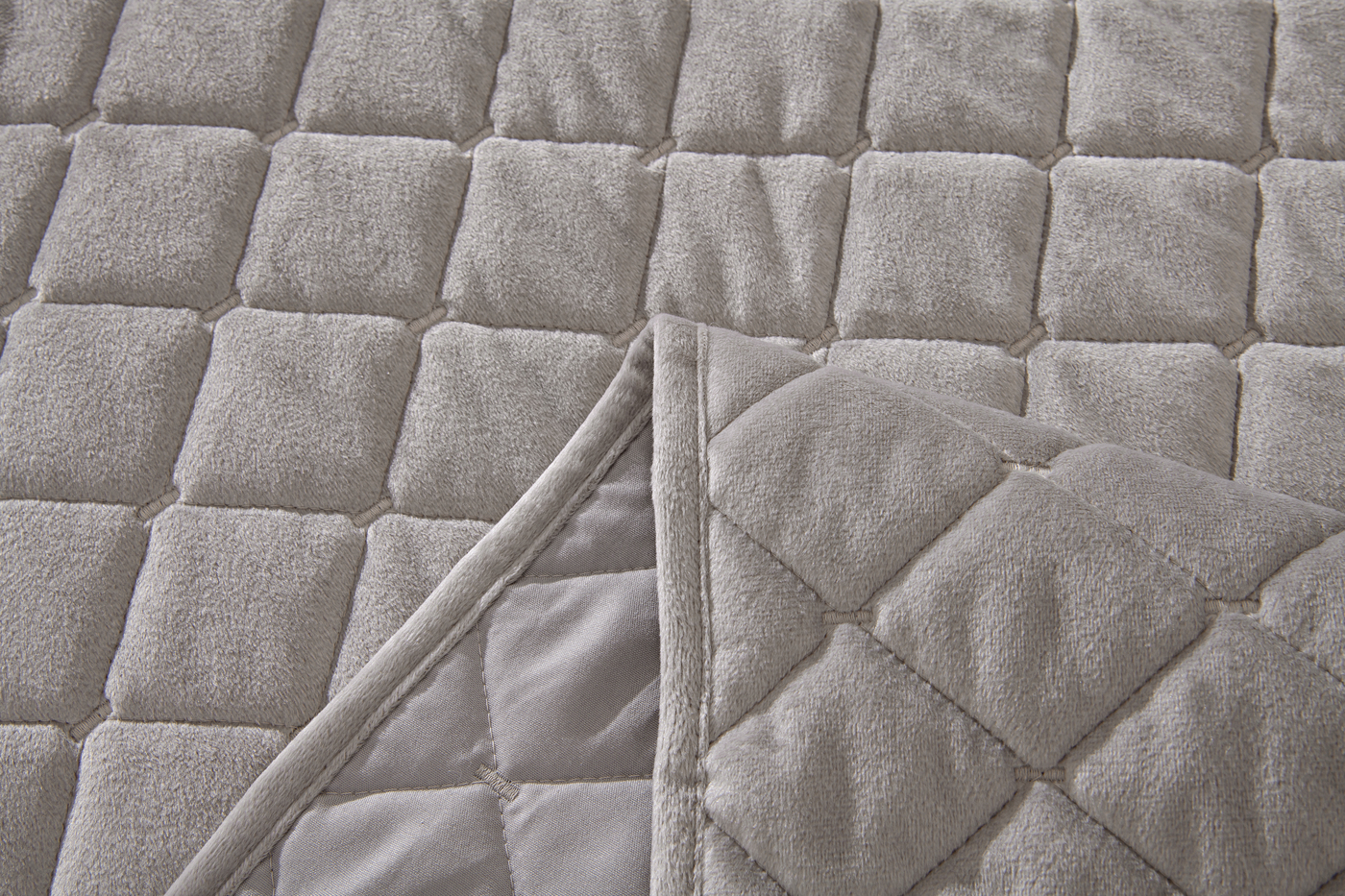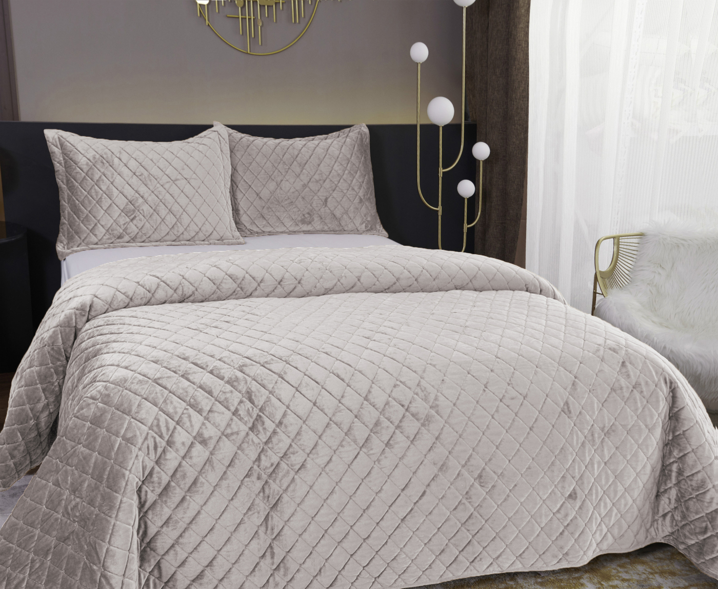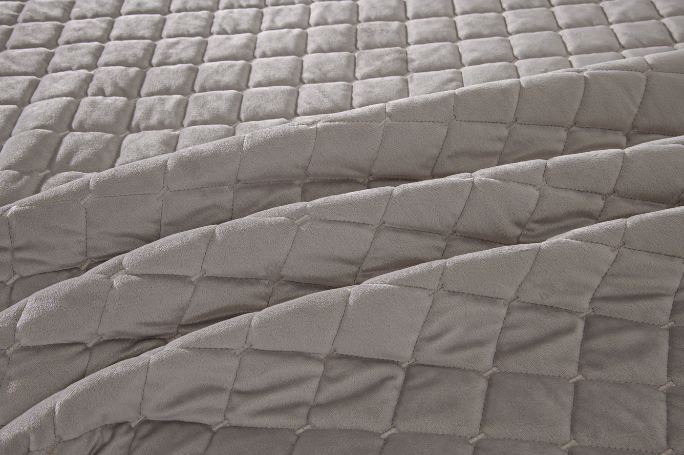 Покрывало стеганное, стежка - ромбТкань: велюр; Состав: 100% вискоза; Комплектация:Покрывало: 240х260см (1);Наволочки: 50х70см (2); Плотность: 200/160/70Уход : Стирка 30-40с°;Упаковка: Текстильная сумка.