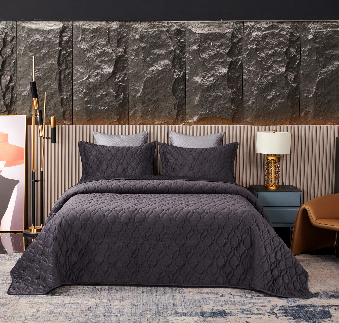 Покрывало стеганое с 3Д эффектомКомплектация:Покрывало: 240х260см (1шт);Наволочка: 50х70+5см (2шт);Плотность: 430 гр/м2;Состав ткани: 100% вискоза;Наполнитель: микроволокно;Пошив покрывала с кантом, наволочки с ушками 5см. Наволочки на запахе;Упаковка: текстильная сумка;Уход: Стирка 30°C.