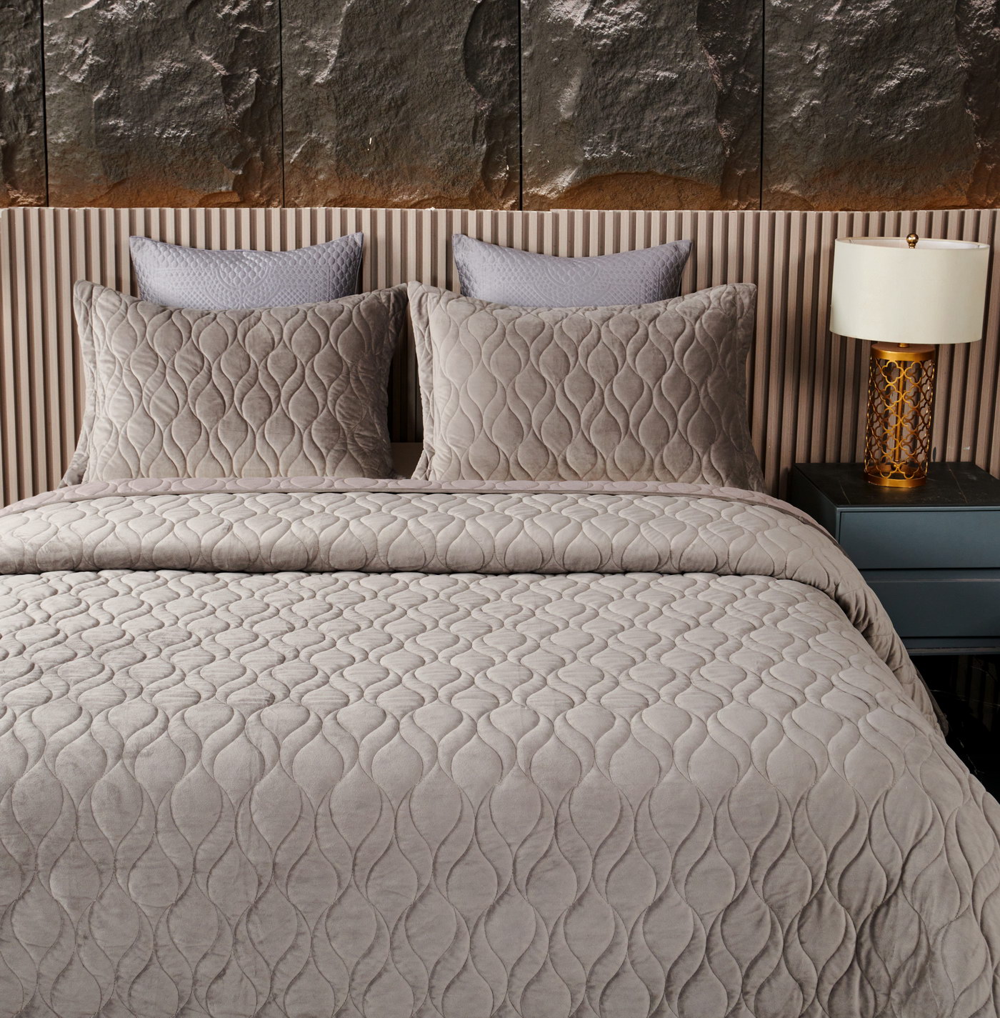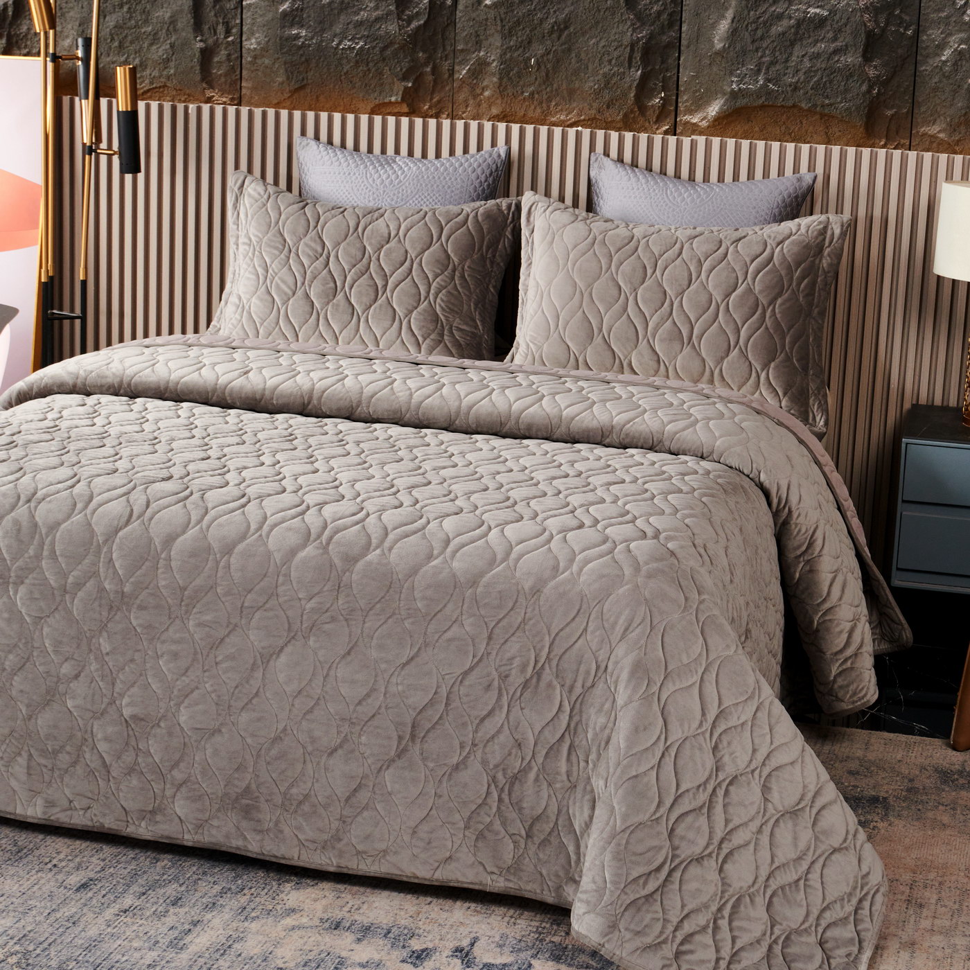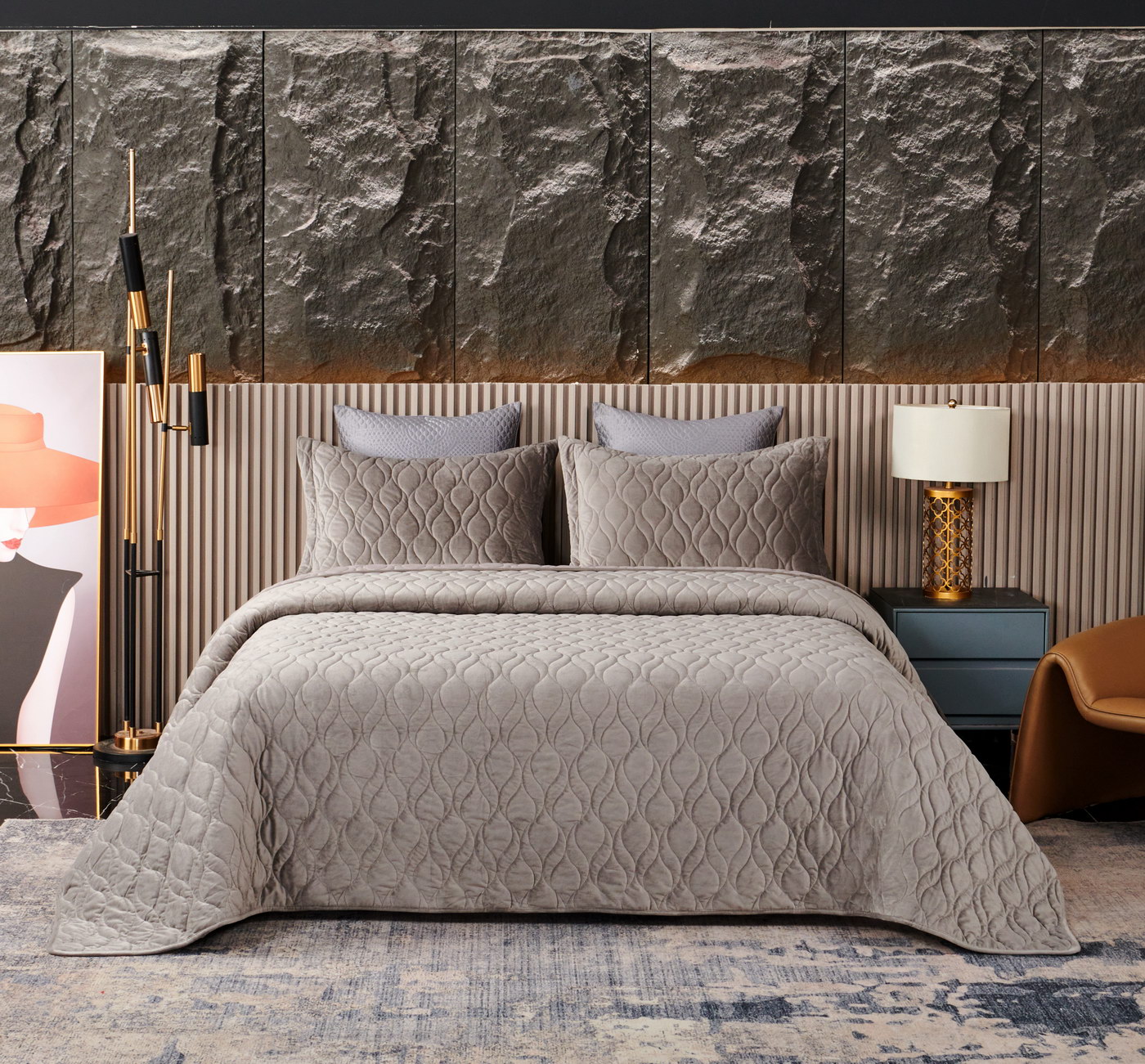 Покрывало стеганое с 3Д эффектомКомплектация:Покрывало: 240х280см (1шт);Наволочка: 50х70+5см (2шт);Плотность: 430 гр/м2;Состав ткани: 100% вискоза;Наполнитель: микроволокно;Пошив покрывала с кантом, наволочки с ушками 5см. Наволочки на запахе;Упаковка: текстильная сумка;Уход: Стирка 30°C.