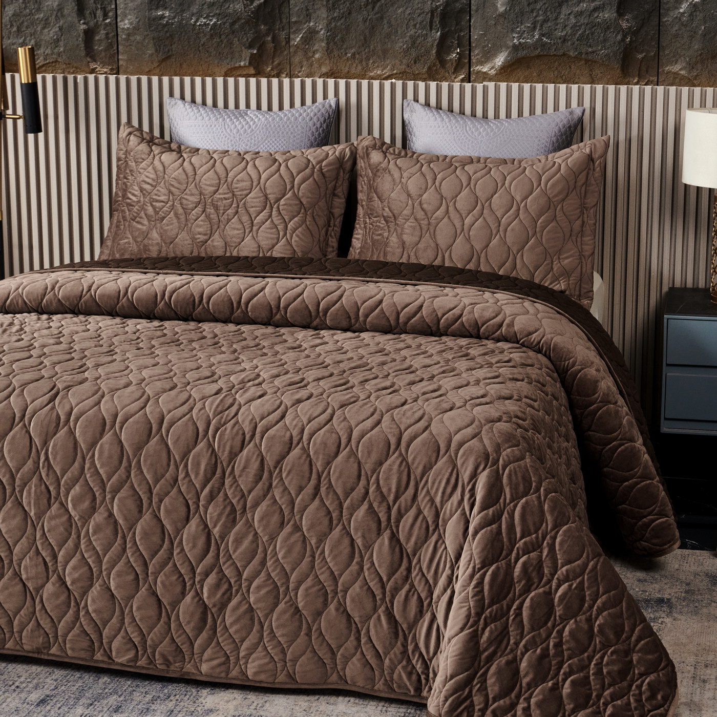 Покрывало стеганое с 3Д эффектомКомплектация:Покрывало: 240х280см (1шт);Наволочка: 50х70+5см (2шт);Плотность: 430 гр/м2;Состав ткани: 100% вискоза;Наполнитель: микроволокно;Пошив покрывала с кантом, наволочки с ушками 5см. Наволочки на запахе;Упаковка: текстильная сумка;Уход: Стирка 30°C.