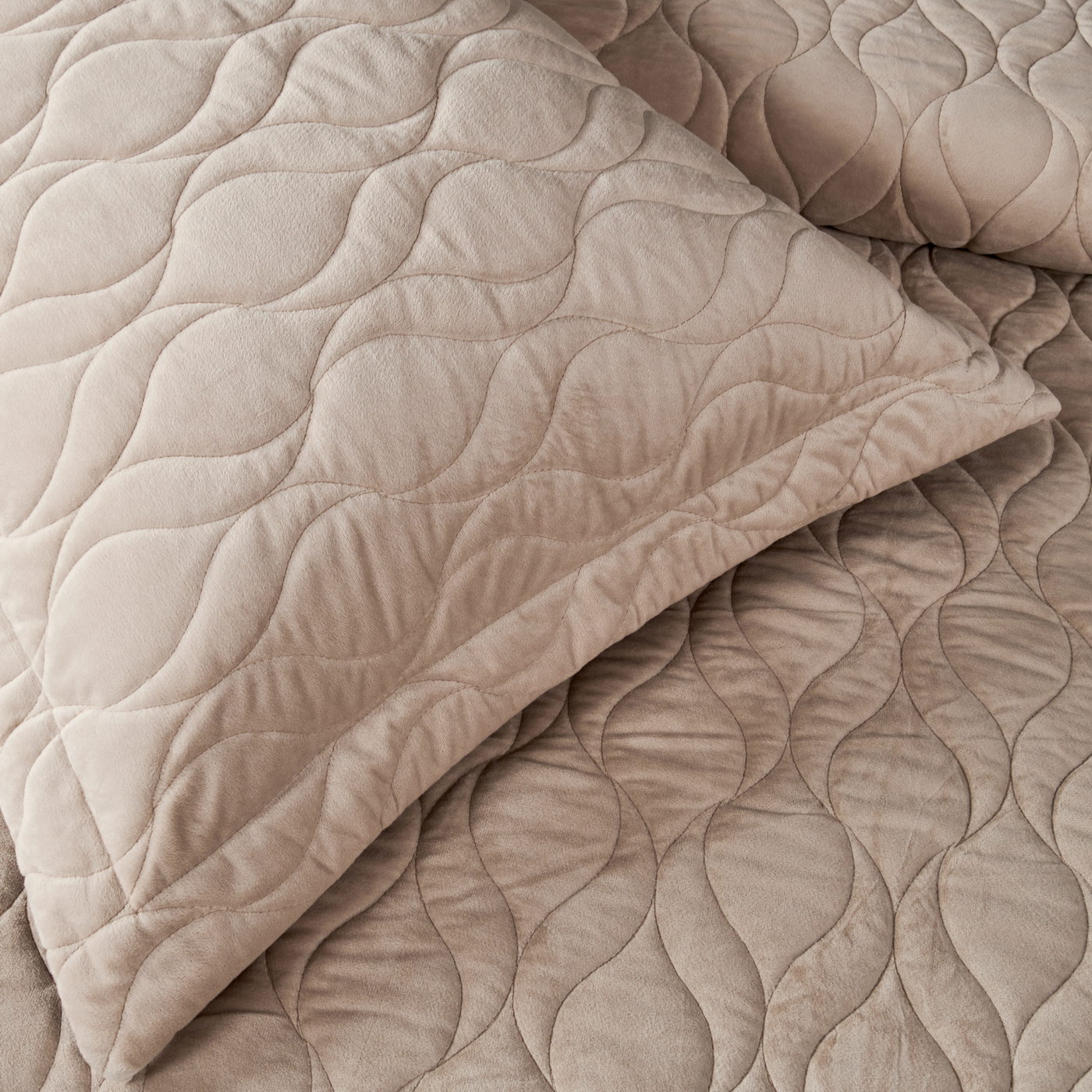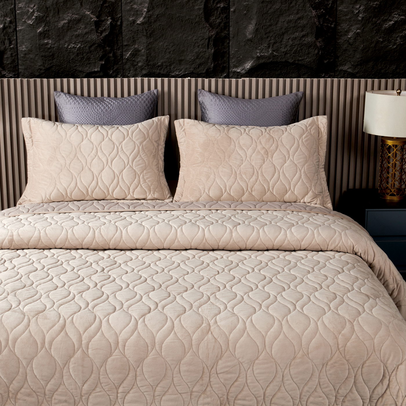 Покрывало стеганое с 3Д эффектомКомплектация:Покрывало: 240х260см (1шт);Наволочка: 50х70+5см (2шт);Плотность: 430 гр/м2;Состав ткани: 100% вискоза;Наполнитель: микроволокно;Пошив покрывала с кантом, наволочки с ушками 5см. Наволочки на запахе;Упаковка: текстильная сумка;Уход: Стирка 30°C.