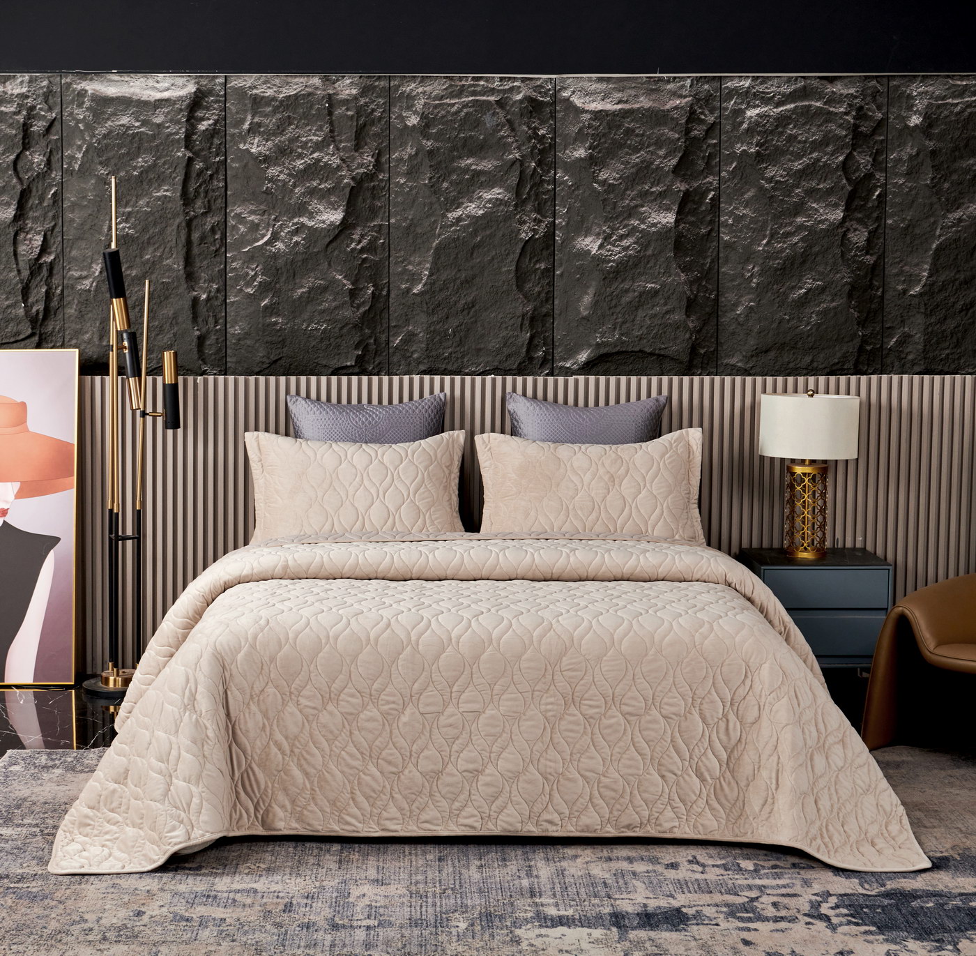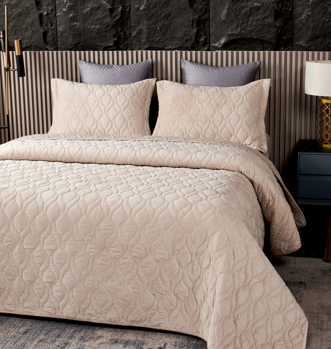 Покрывало стеганое с 3Д эффектомКомплектация:Покрывало: 240х280см (1шт);Наволочка: 50х70+5см (2шт);Плотность: 430 гр/м2;Состав ткани: 100% вискоза;Наполнитель: микроволокно;Пошив покрывала с кантом, наволочки с ушками 5см. Наволочки на запахе;Упаковка: текстильная сумка;Уход: Стирка 30°C.