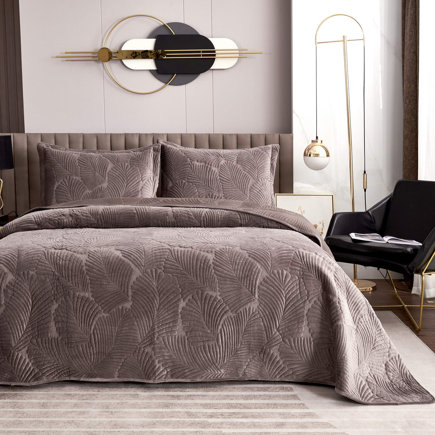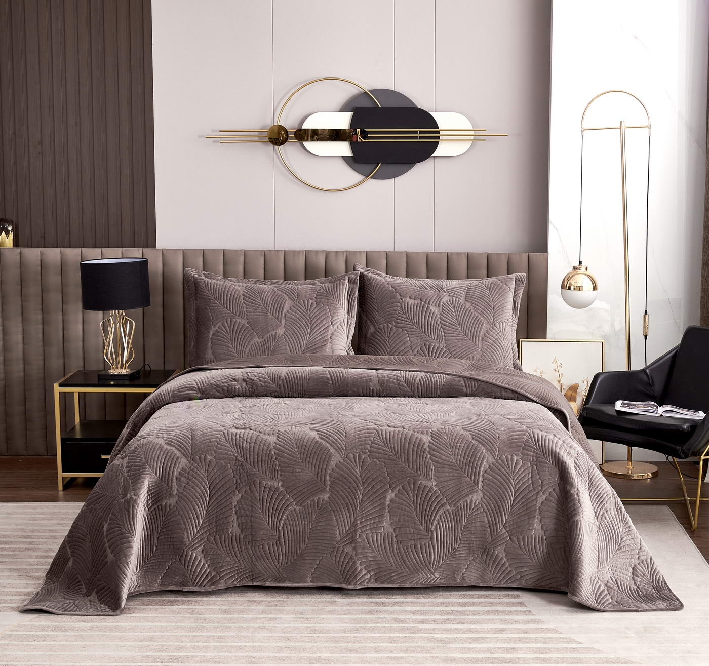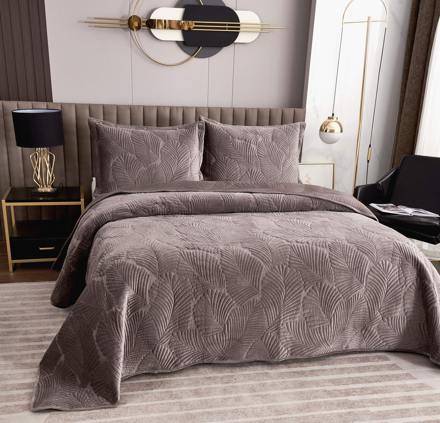 Покрывало стеганноеТкань: велюр; Состав: 100% вискоза;Комплектация:Покрывало: 240х260 (1);Наволочки: 50х70 (2); Плотность: 200/160/70Уход : Стирка 30-40с°;Упаковка: Текстильная сумка