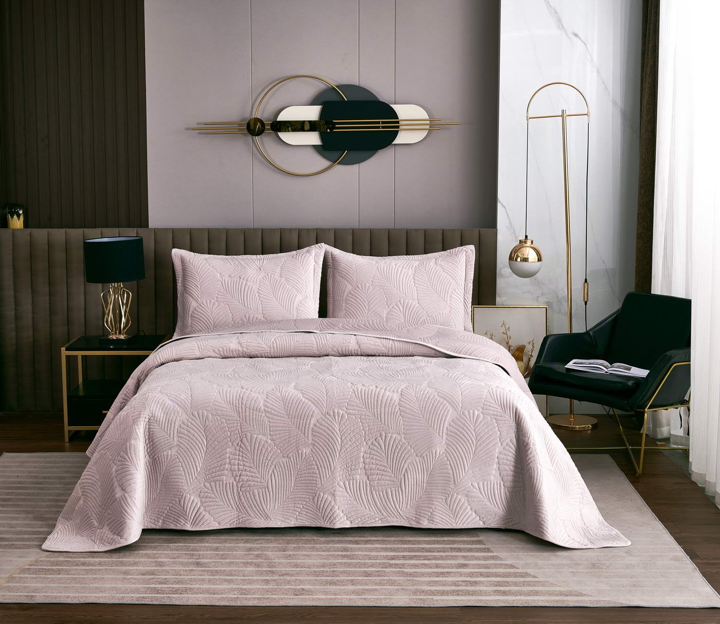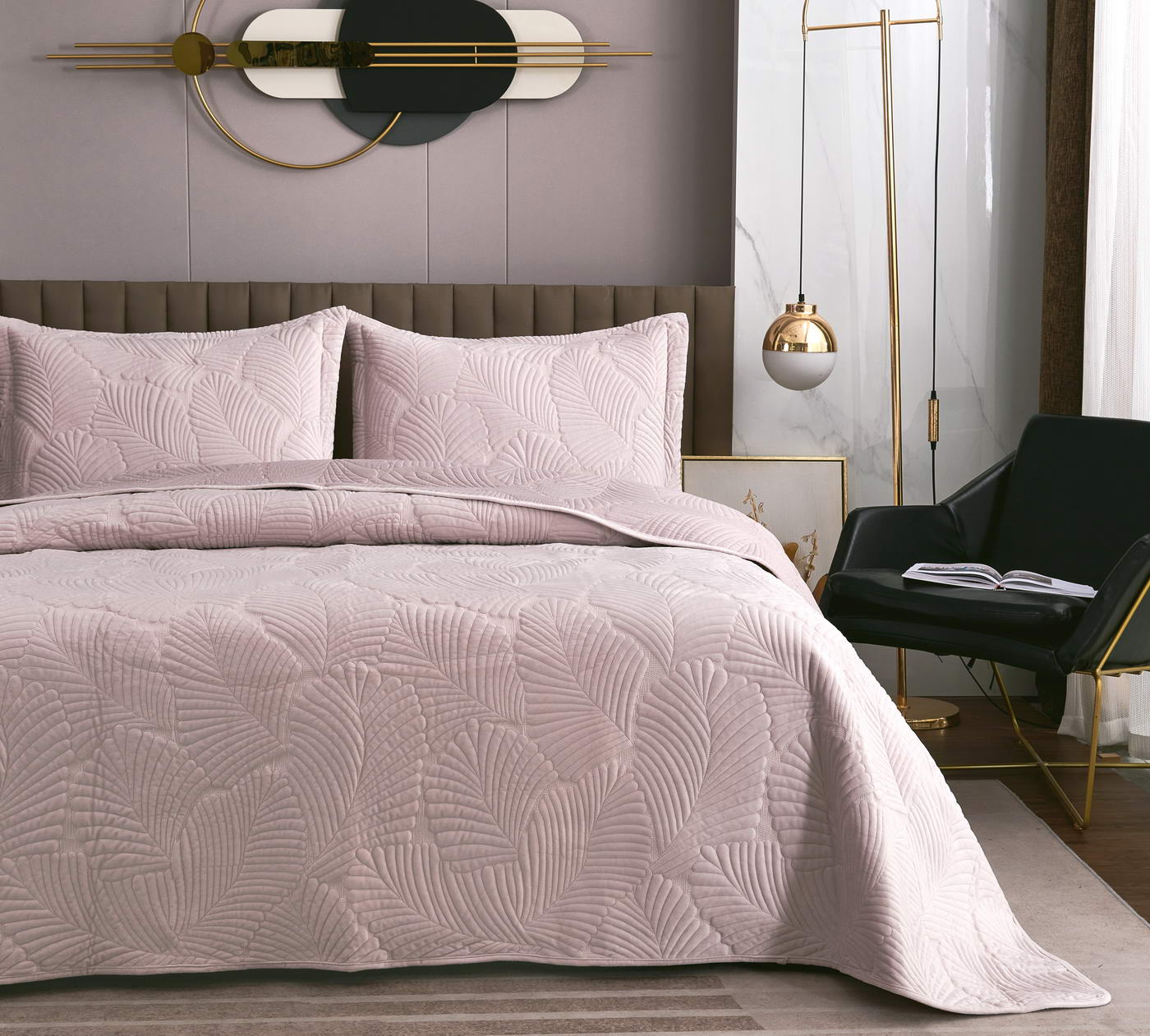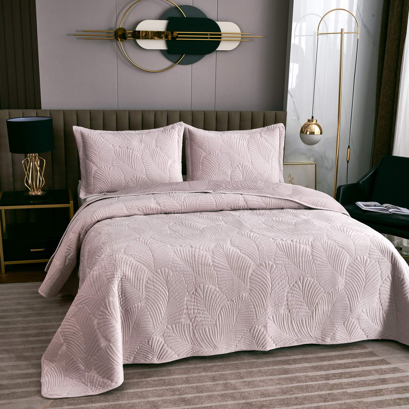 Покрывало стеганноеТкань: велюр; Состав: 100% вискоза;Комплектация:Покрывало: 240х260 (1);Наволочки: 50х70 (2); Плотность: 200/160/70Уход : Стирка 30-40с°;Упаковка: Текстильная сумка