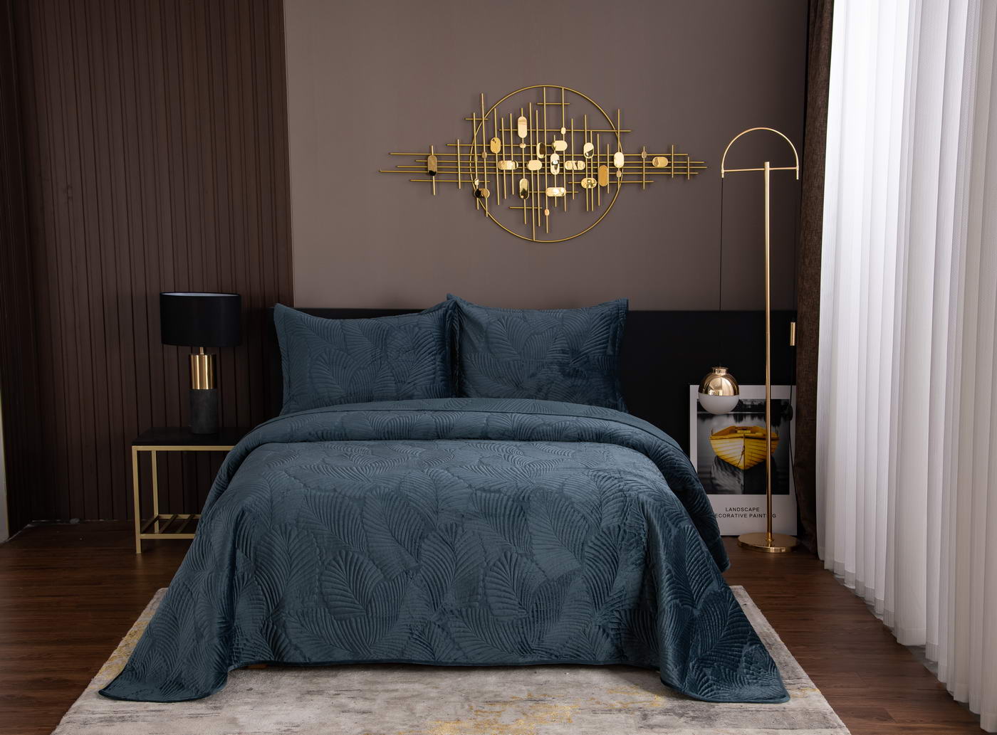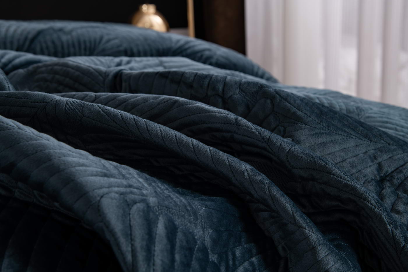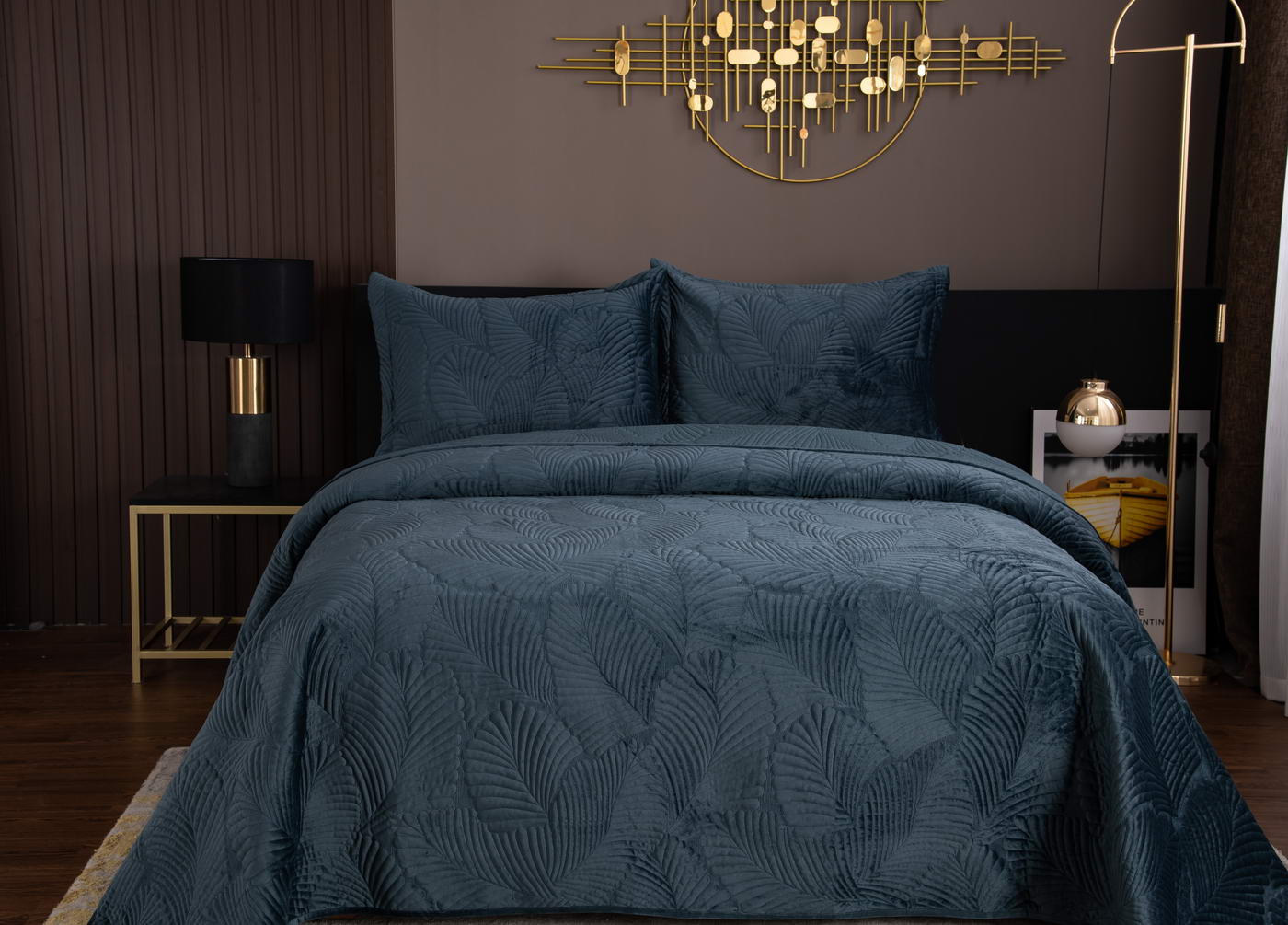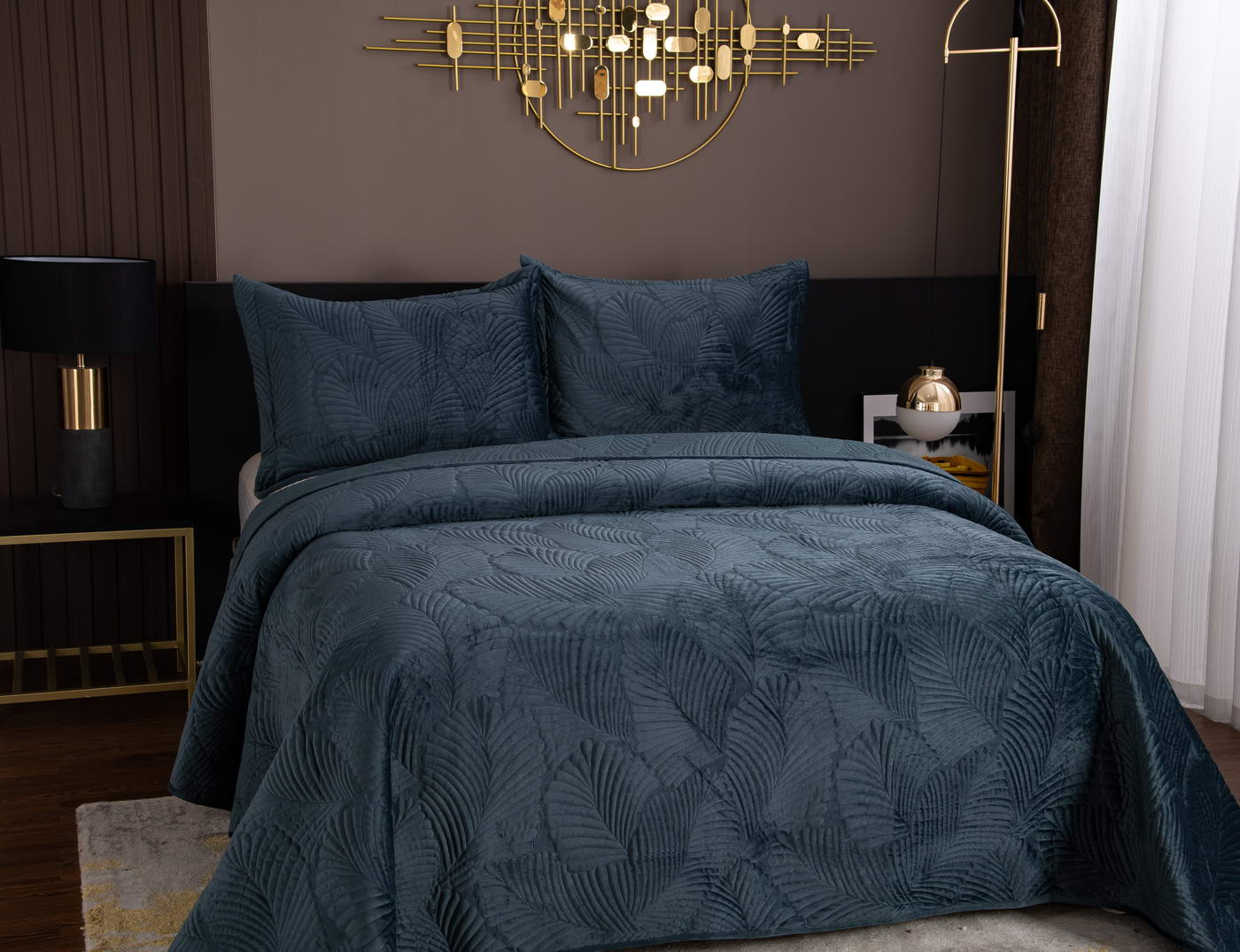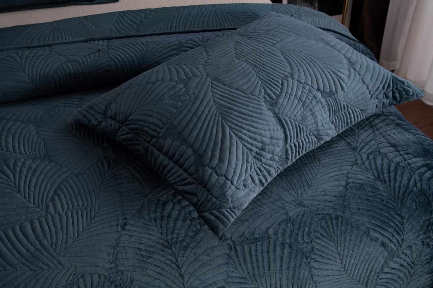 Покрывало стеганноеТкань: велюр; Состав: 100% вискоза; Комплектация:Покрывало: 240х260 (1);Наволочки: 50х70 (2); Плотность: 200/160/70Уход : Стирка 30-40с°;Упаковка: Текстильная сумка.