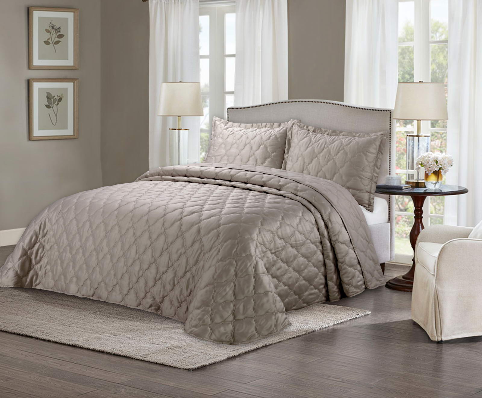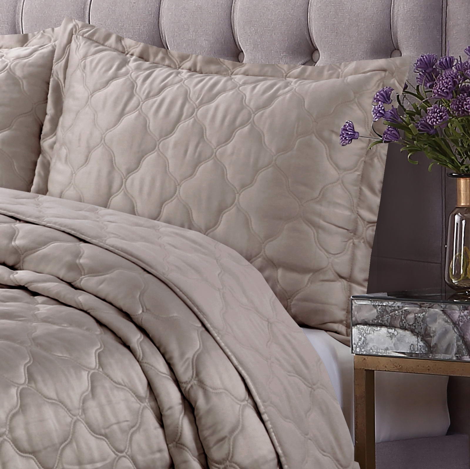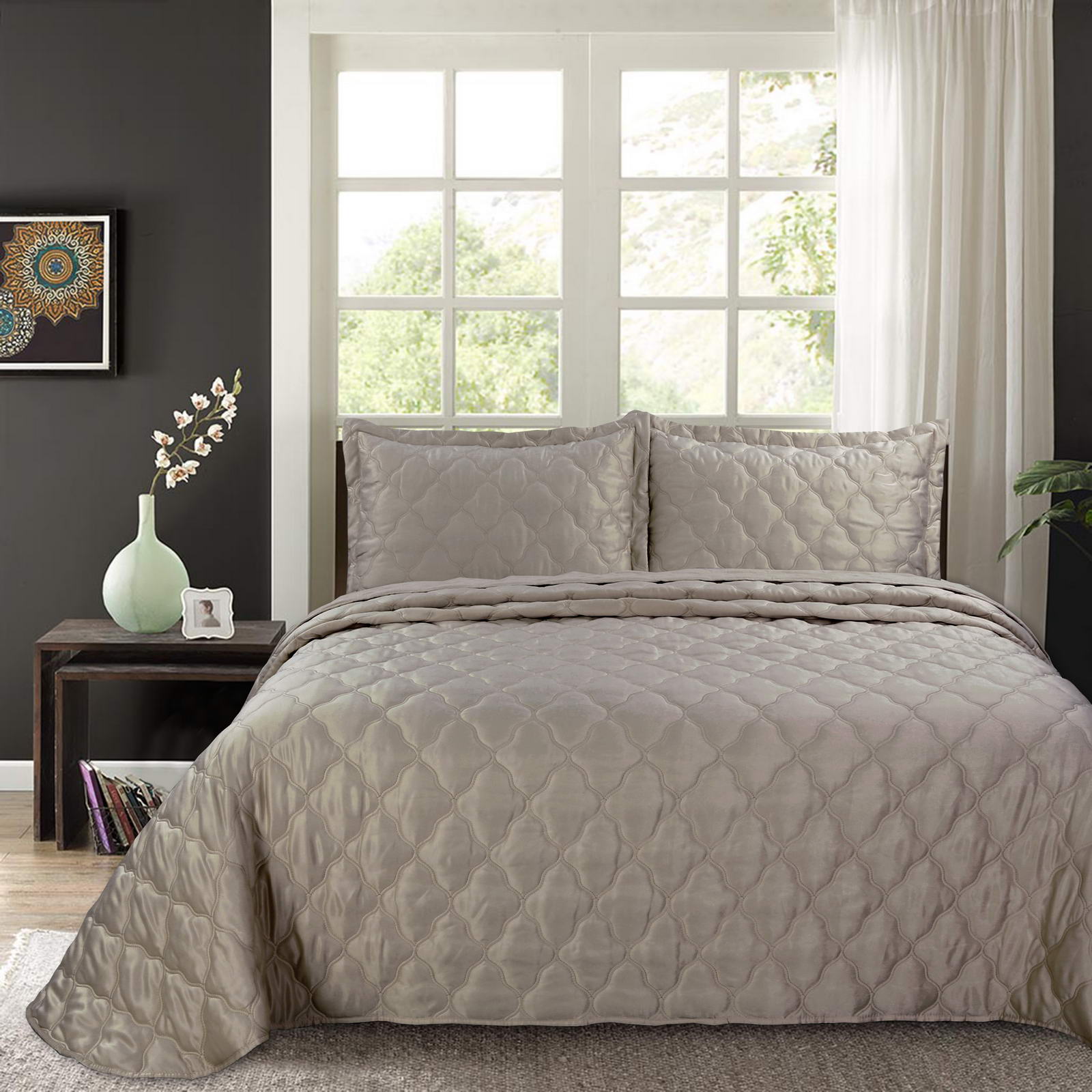 Покрывала СтеганноеКомплектация:Покрывало: 240х260Наволочки: 50х70 (2шт)Ткань: АтласСостав: 70% Вискоза; 30% Хлопка.Упаковка: текстильная сумкаУход. Стирка 30'