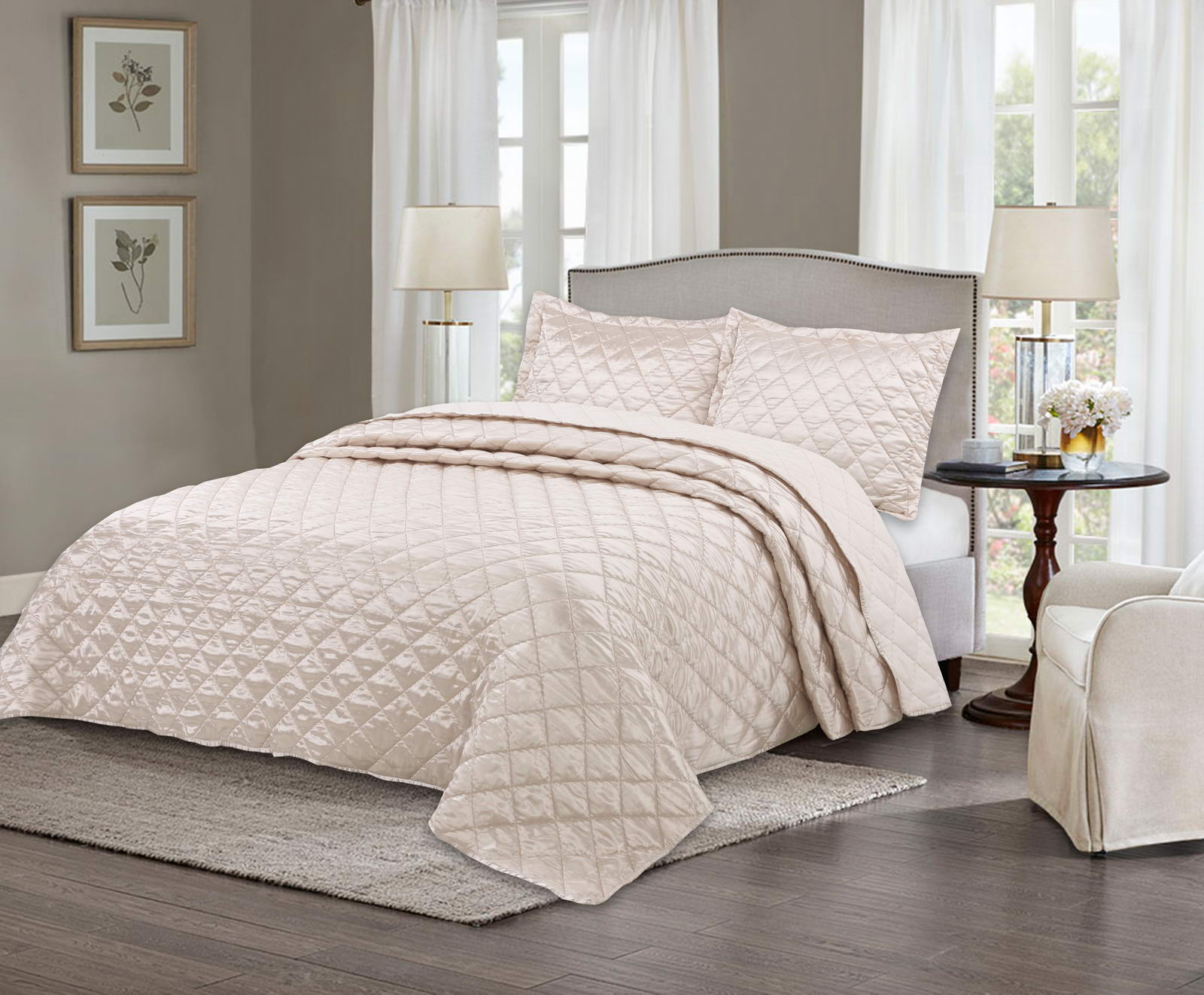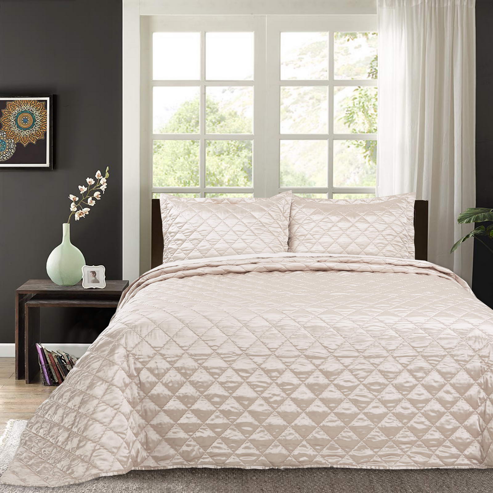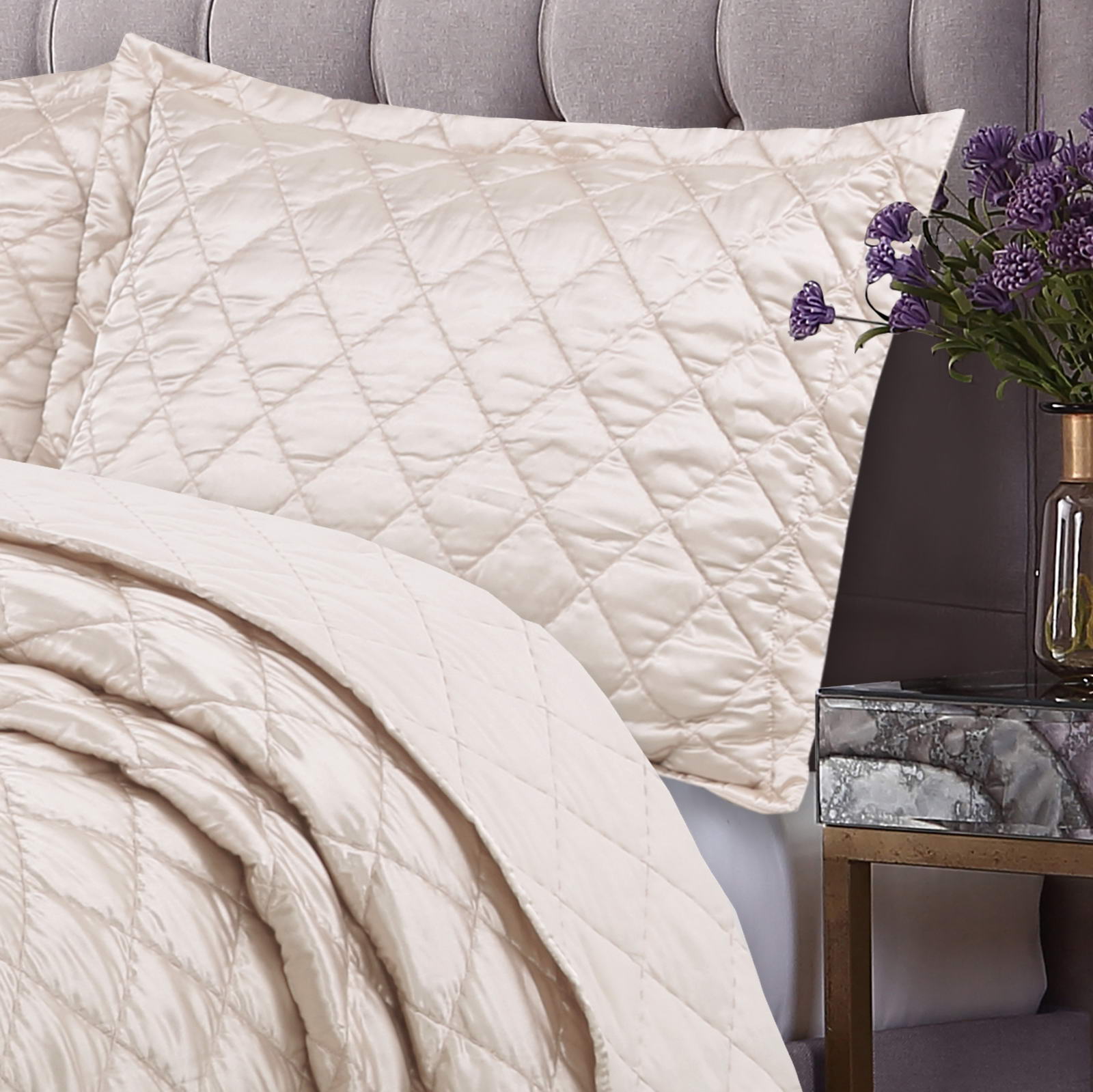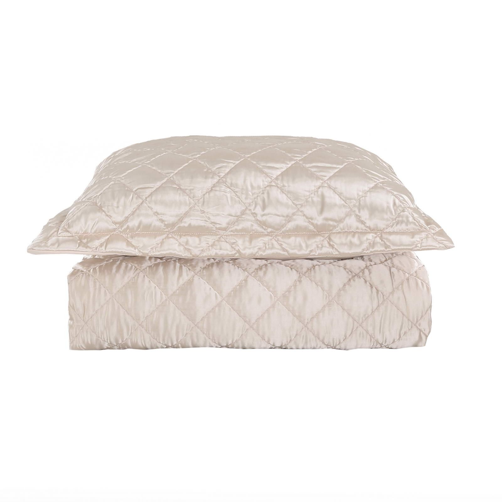 Покрывала СтеганноеКомплектация:Покрывало: 240х260Наволочки: 50х70 (2шт)Ткань: атлас Состав: 70% Вискоза 30% ХлопкаУпаковка: текстильная сумкаУход. Стирка 30'