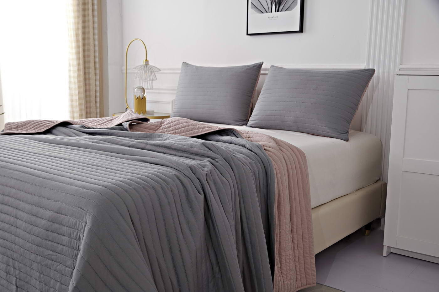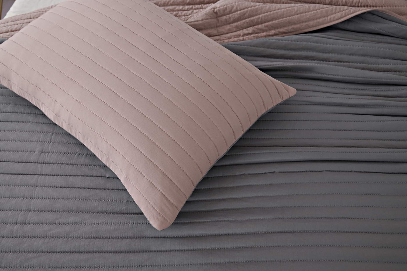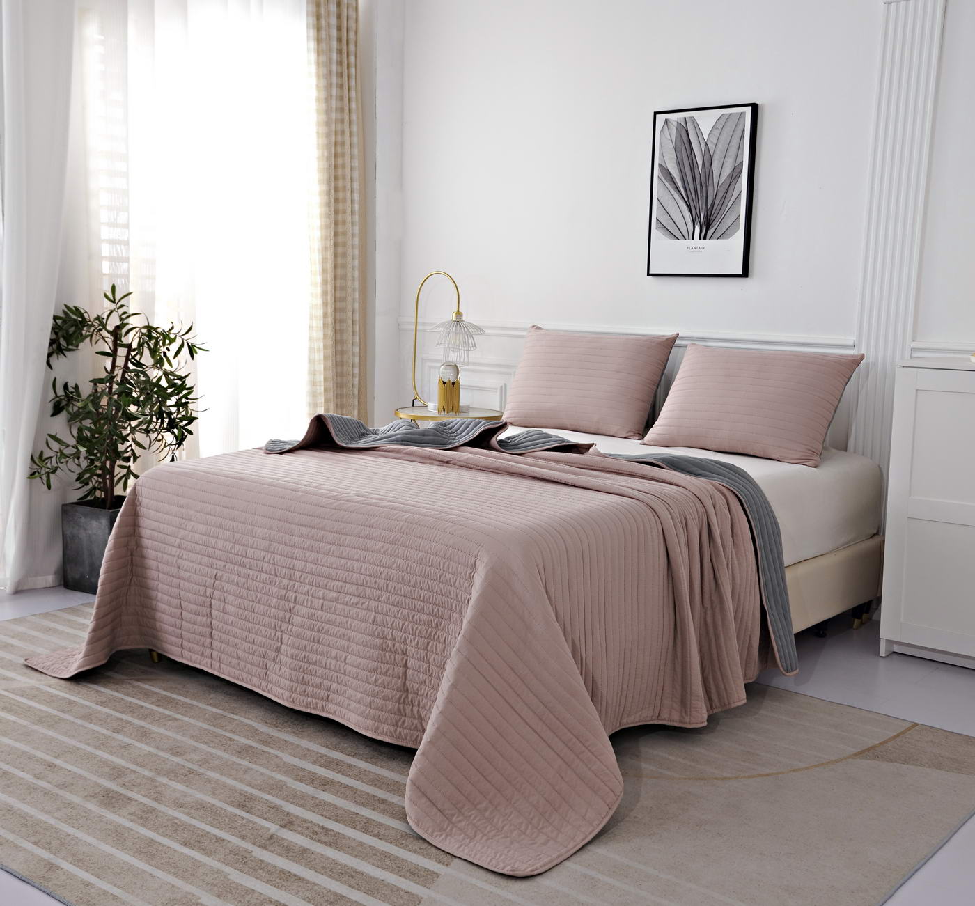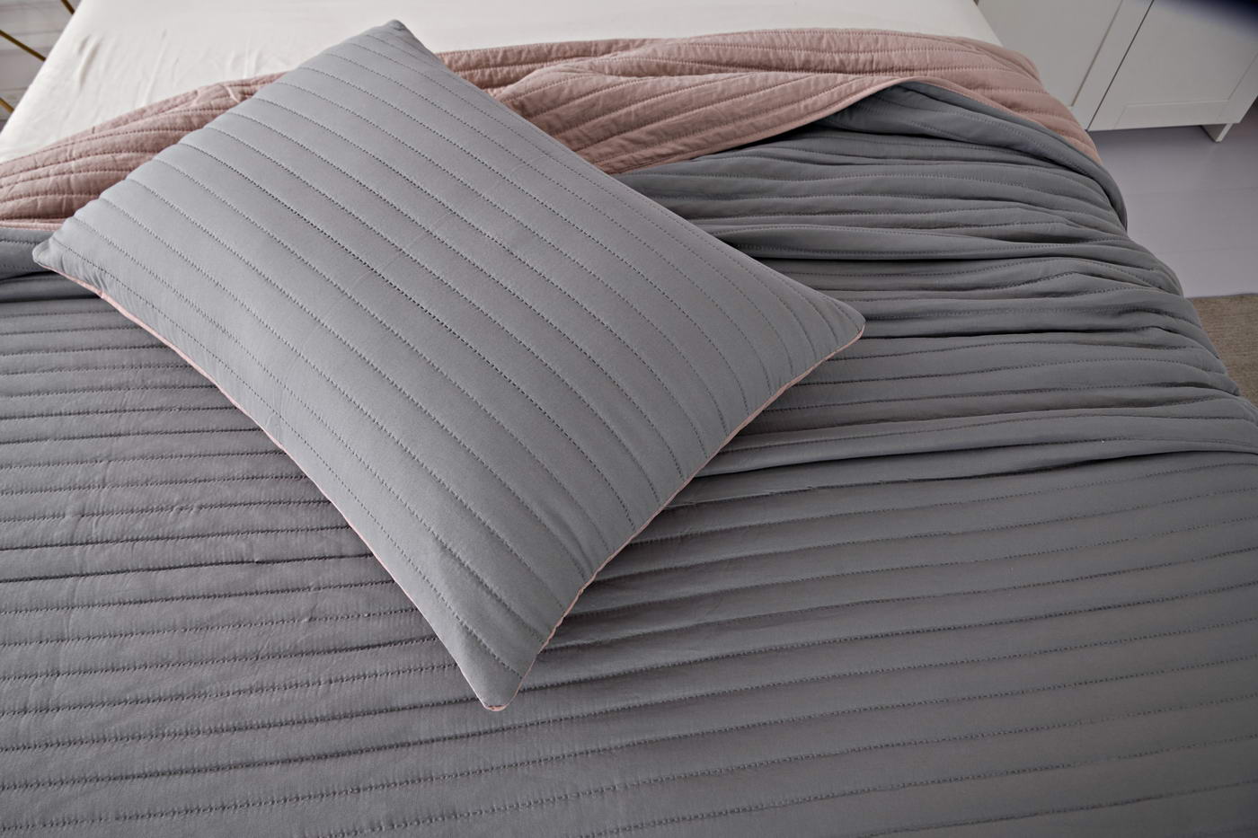 Покрывало с термостежкойКомплектация:Покрывало: 230х250смНаволочка: 50х70см (2)Особенность: ДвустороннееЦвет: пепел роза\серыйПлотность: 85/150/85Состав: 70% Вискоза 30% ХлопокУпаковка: сумка ПВХУход. Стирка 30'