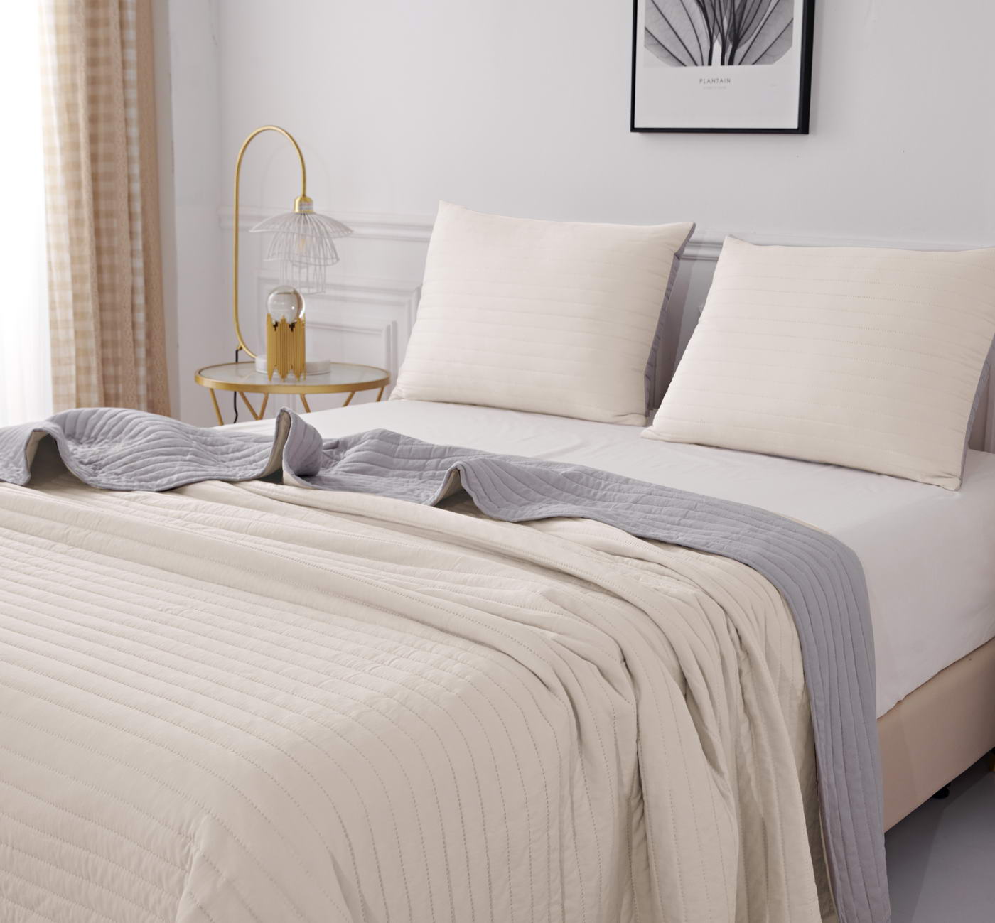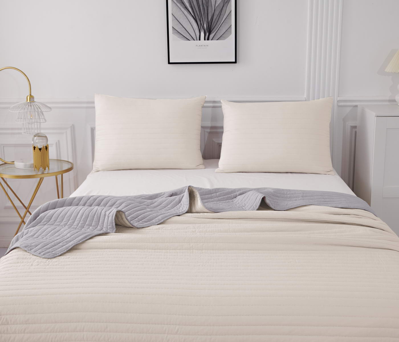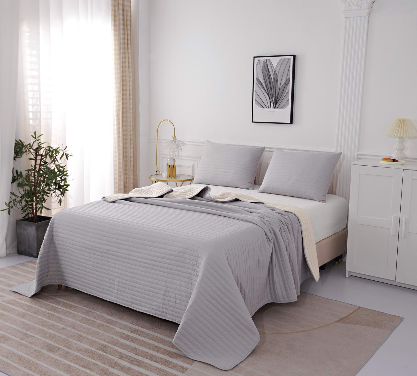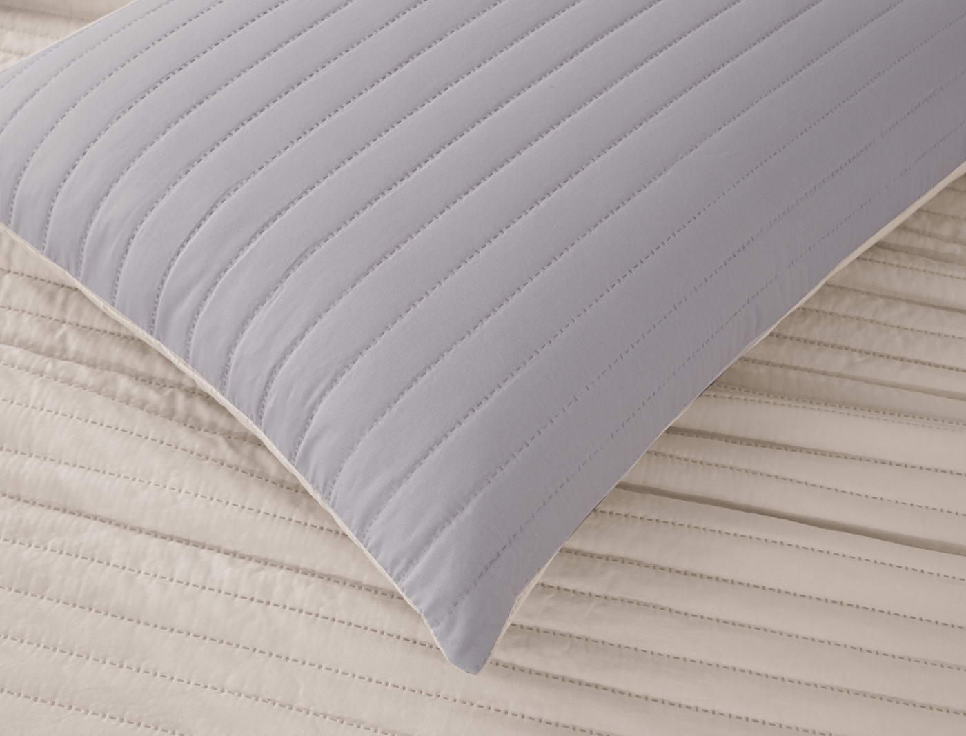 Покрывало с термостежкойКомплектация:Покрывало: 230х250смНаволочка: 50х70см (2)Особенность: ДвустороннееЦвет: лиловый\бежПлотность: 85/150/85Состав: 70% Вискоза 30% ХлопокУпаковка: сумка ПВХУход. Стирка 30'