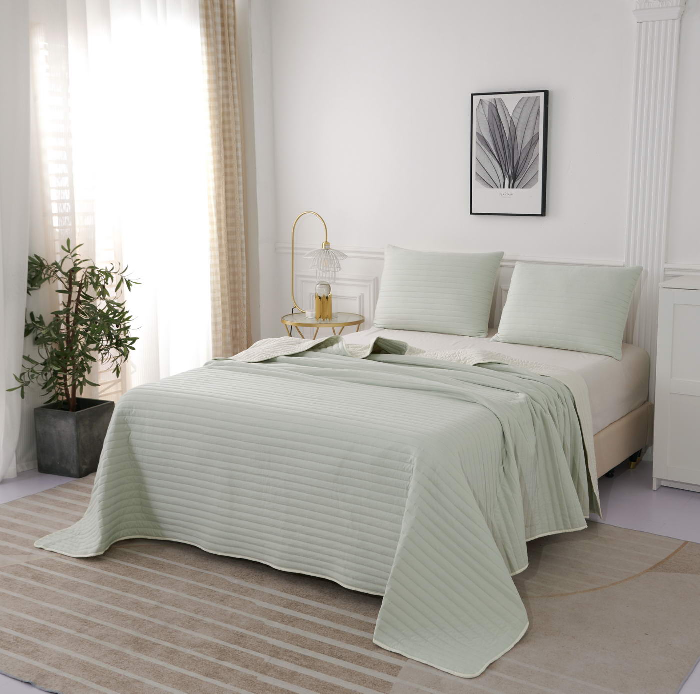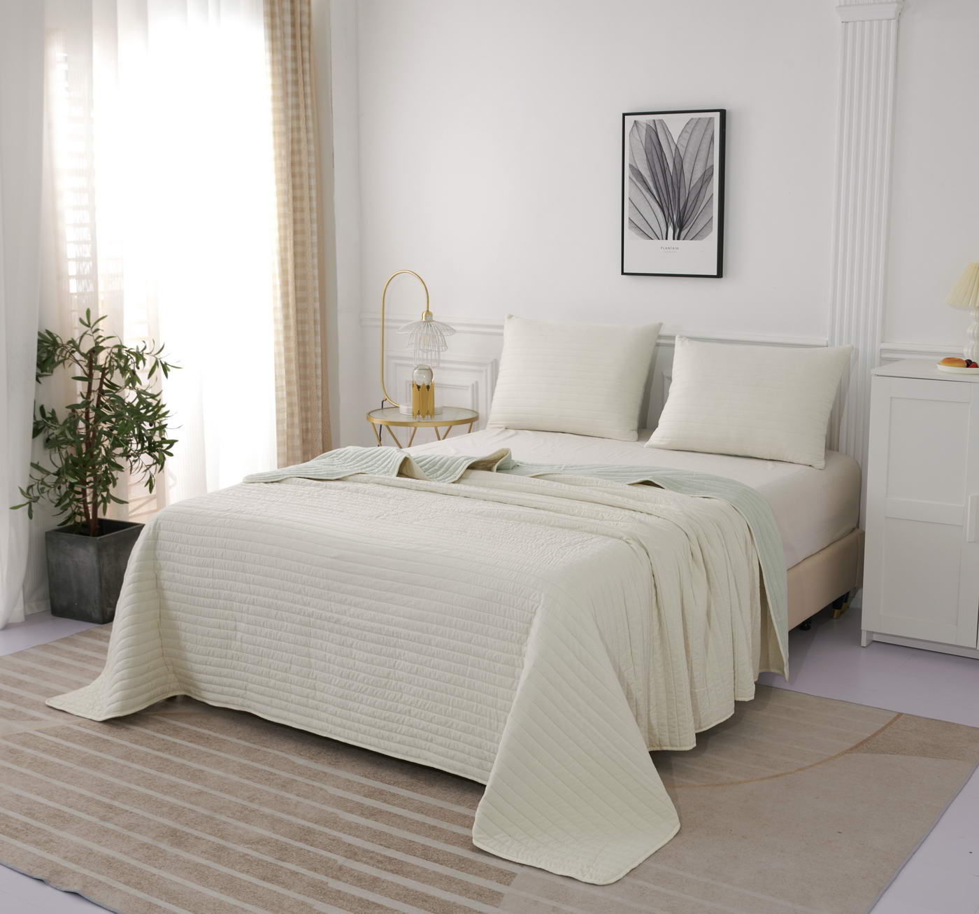 Покрывало с термостежкойКомплектация:Покрывало: 160х220смНаволочка: 50х70см (1)Особенность: ДвустороннееЦвет: молоко\ментолПлотность: 85/150/85Состав: 70% Вискоза 30% ХлопокУпаковка: сумка ПВХУход. Стирка 30'
