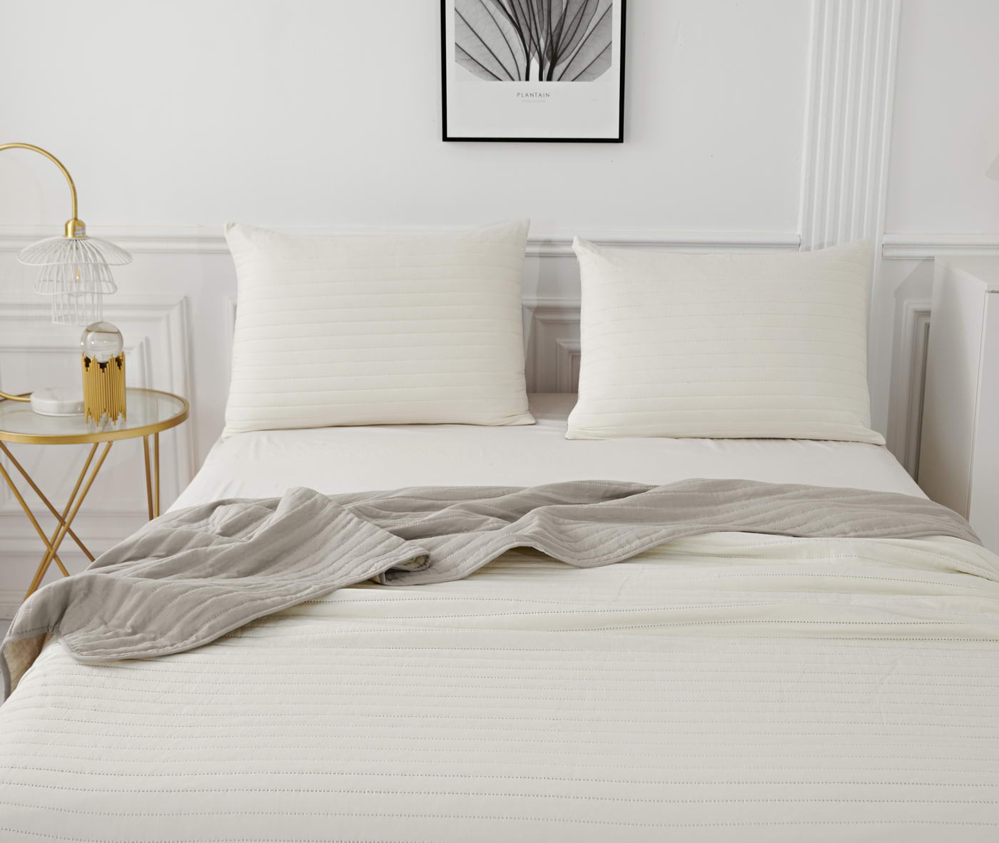 Покрывало с термостежкойКомплектация:Покрывало: 230х250смНаволочка: 50х70см (2)Особенность: ДвустороннееЦвет: капучино\молокоПлотность: 85/150/85Состав: 70% Вискоза 30% ХлопокУпаковка: сумка ПВХУход. Стирка 30'