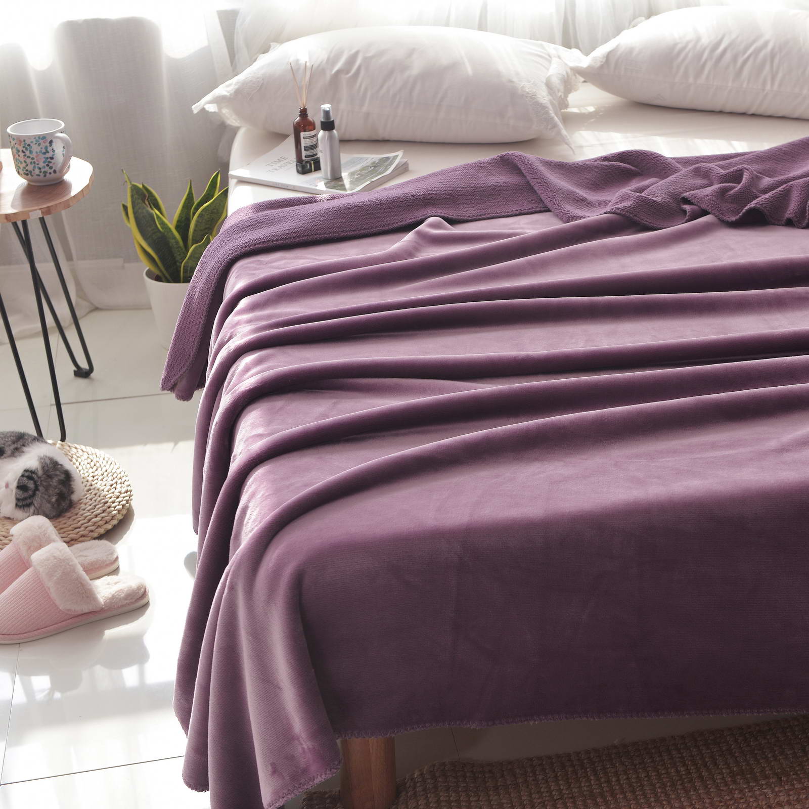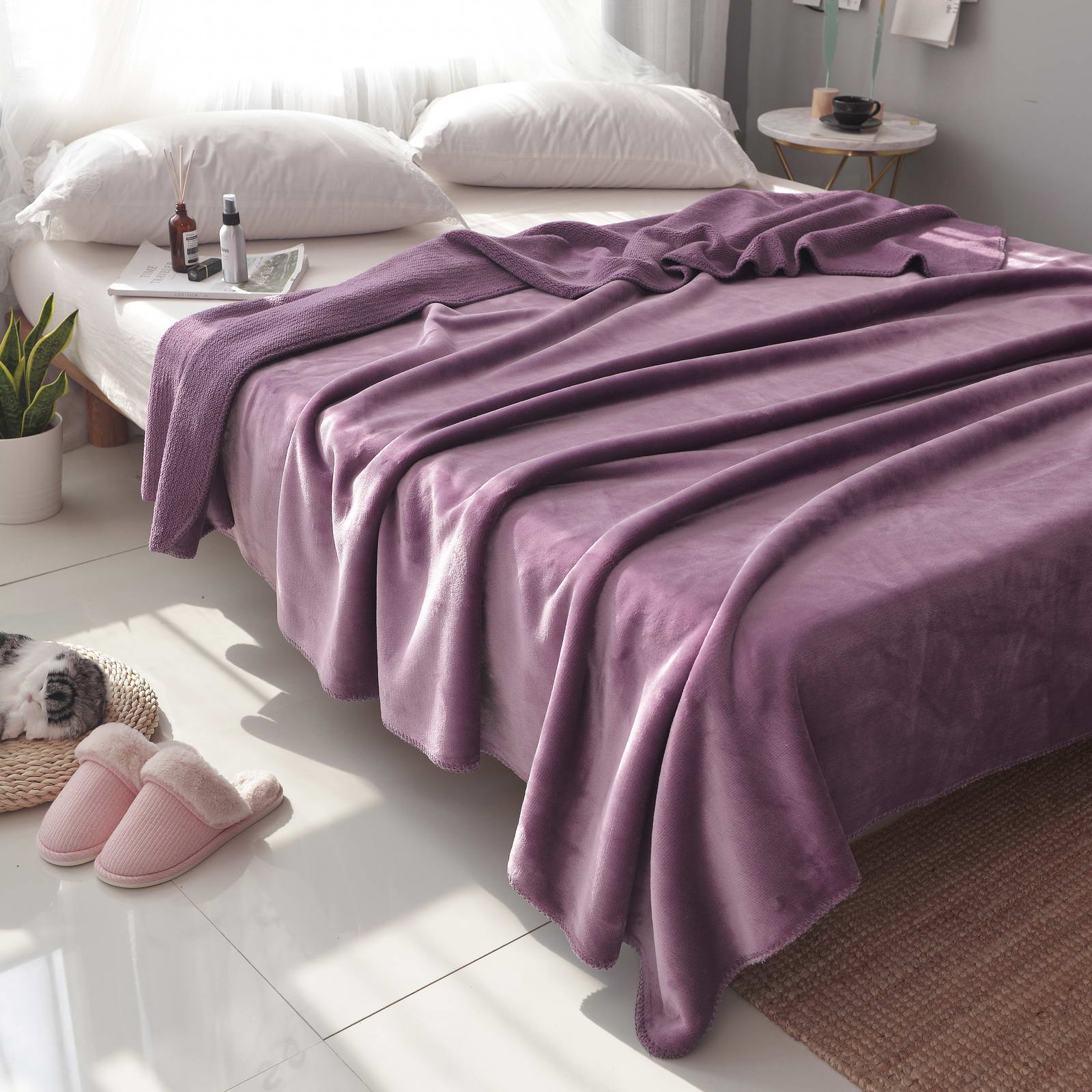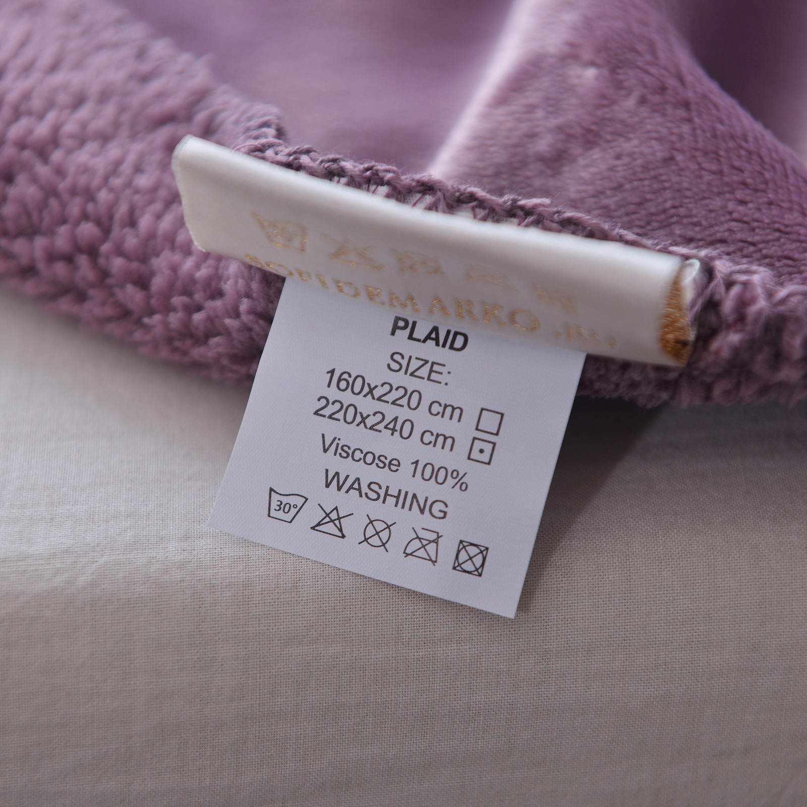 Плед двустороннийРазмер: 160х220см;Ткань: велсофт 500гр/м2Состав: 100% вискоза; Упаковка: сумка ПВХ с брендированной лентой