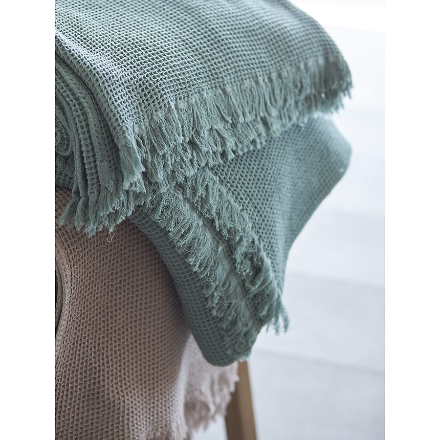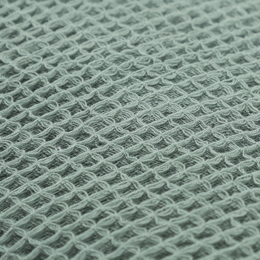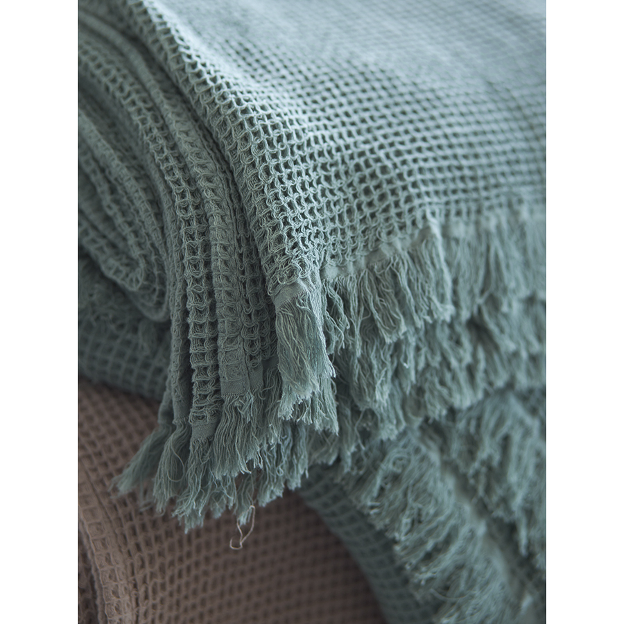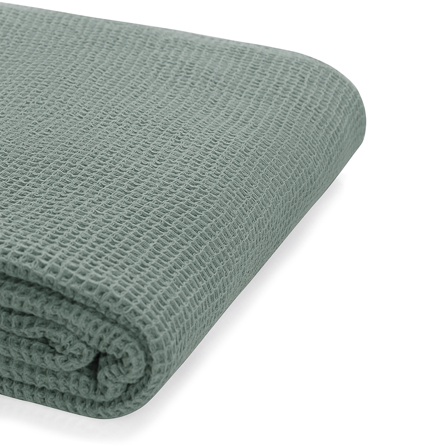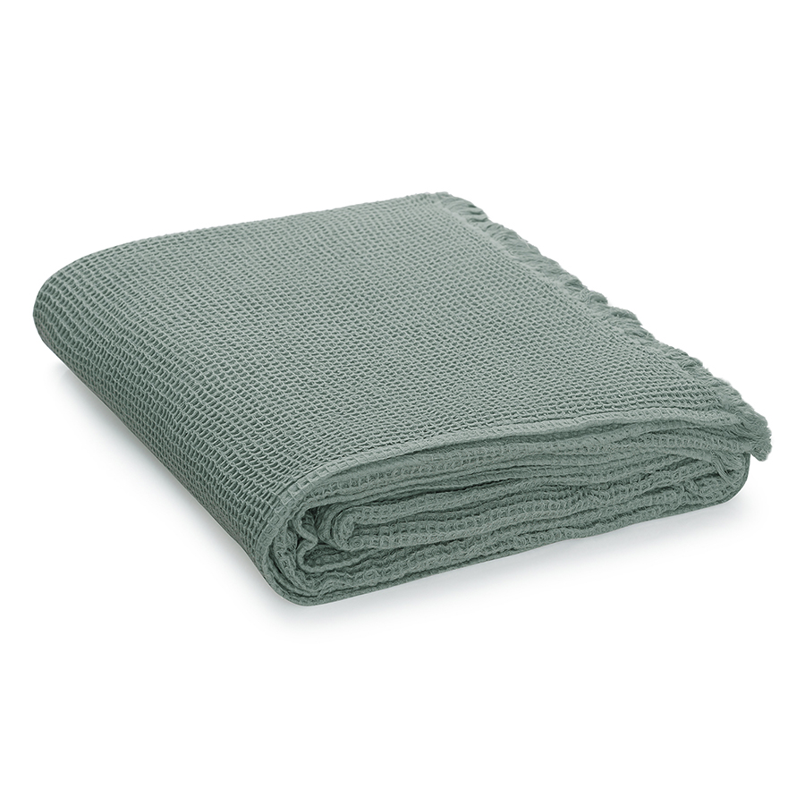 "Покрывало вафельное из хлопка цвета шалфея из коллекции Essential станет необычным акцентом в интерьере благодаря своей интересной фактуре. Мягкое и приятное на ощупь – оно создано, чтобы дарить тепло и делать любое пространство уютным и комфортным. Им можно красиво застелить диван или кровать, а также использовать его в качестве пледа.
