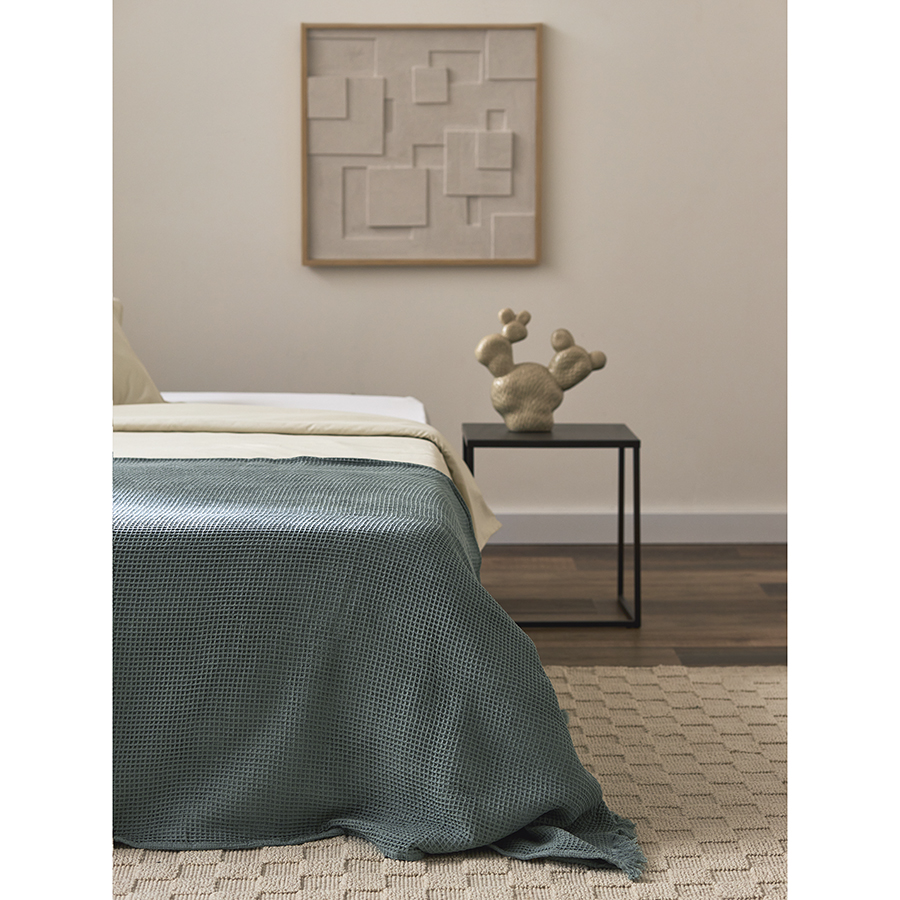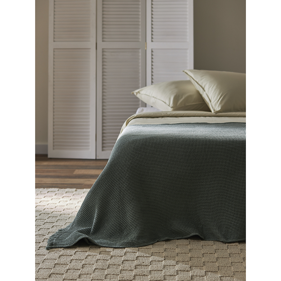 - Благодаря необычной “вафельной” фактуре покрывало выглядит стильно, при этом простое в уходе и практически не мнется.