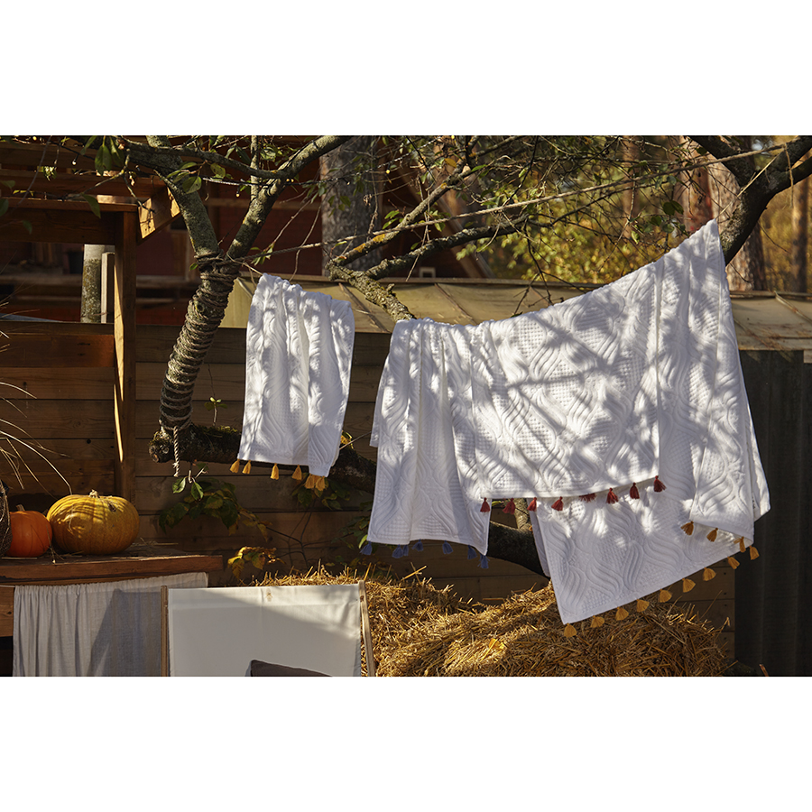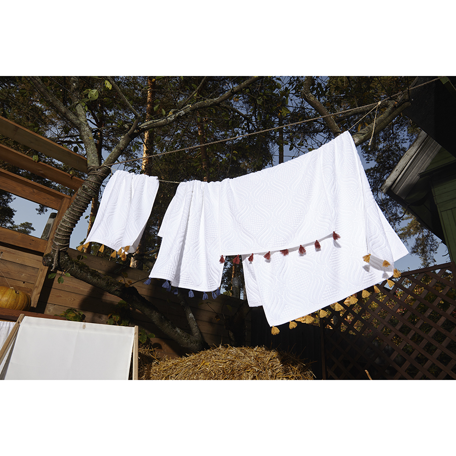 "Банное полотенце из коллекции Essential – качественный текстиль из экологичного хлопка, который идеально подойдет для ежедневного использования и украсит вашу ванную комнату. Мягкая, приятная на ощупь ткань превосходно впитывает влагу и дарит комфорт при контакте с кожей. Материал абсолютно гипоаллергенен, так как не содержит синтетических волокон, при этом обладает высокими показателями прочности и износостойкости. Дизайн полотенца вдохновлен этническими мотивами, что подчеркивают декоративные элементы в виде кисточек контрастного оттенка.
