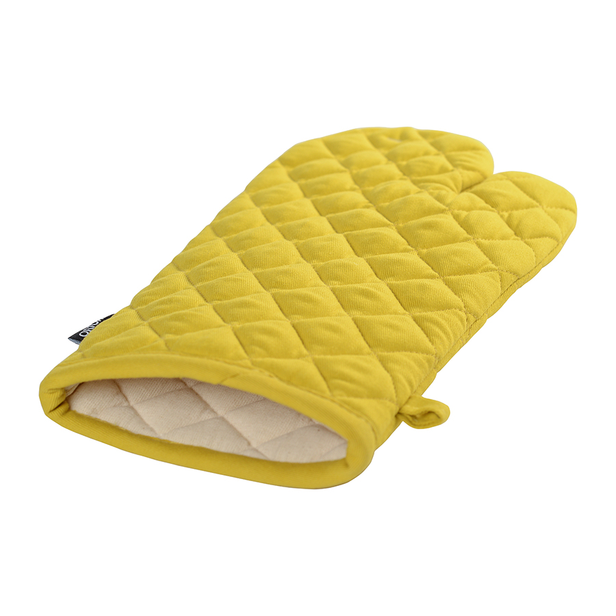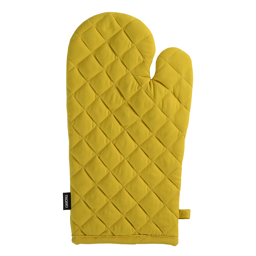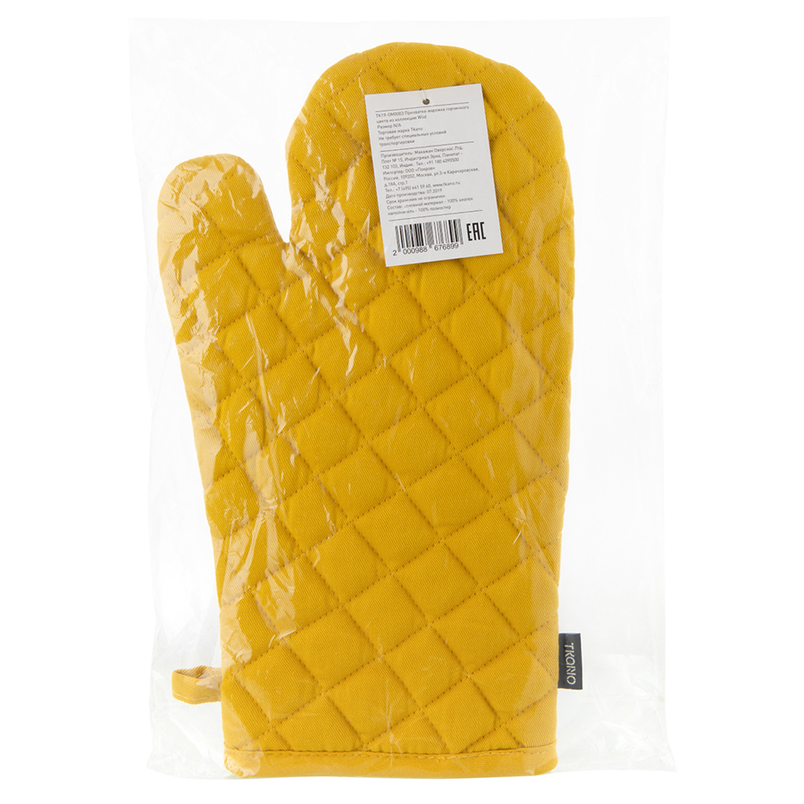 "Горчичная прихватка-варежка выполнена из прочного мягкого хлопка, который не вызывает аллергию. Тонкий и мягкий наполнитель обеспечивает комфорт во время готовки, снижая риск обжечься об горячую поверхность.