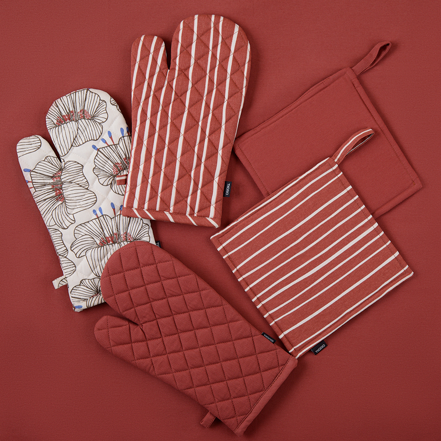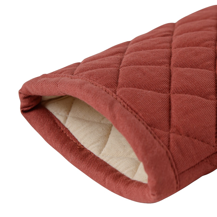 "Прихватка-варежка из хлопка терракотового цвета из коллекции Prairie – универсальный кухонный аксессуар. Изделие органично впишется в любой современный интерьер. Не нагревается даже при длительном контакте с горячими поверхностями. Внешняя и внутренняя части выполнены из 100%, гипоаллергенного хлопка. Наполнитель: полиэстер. Есть удобная петелька для подвешивания. Плотность ткани - 215GSM.