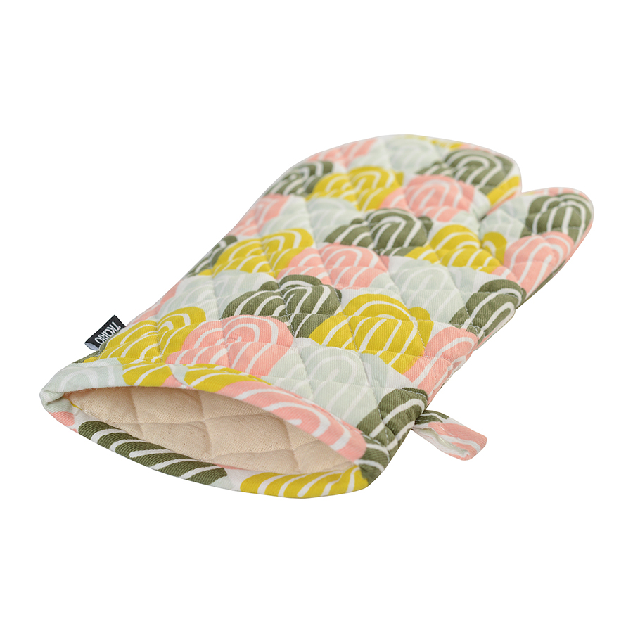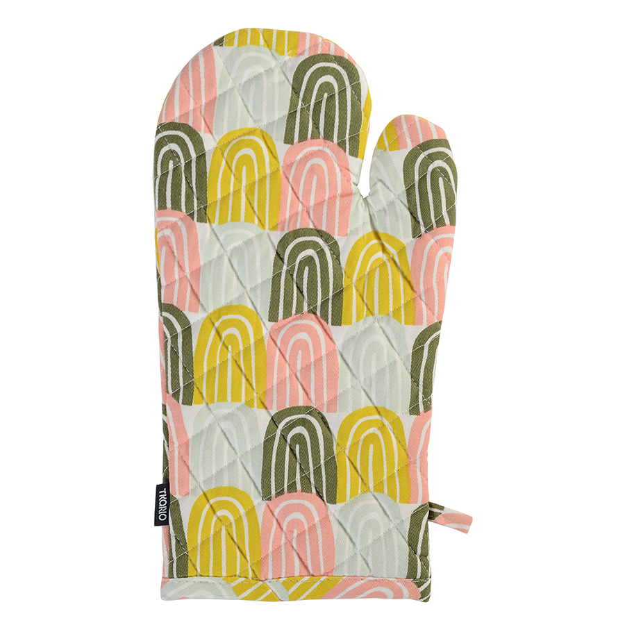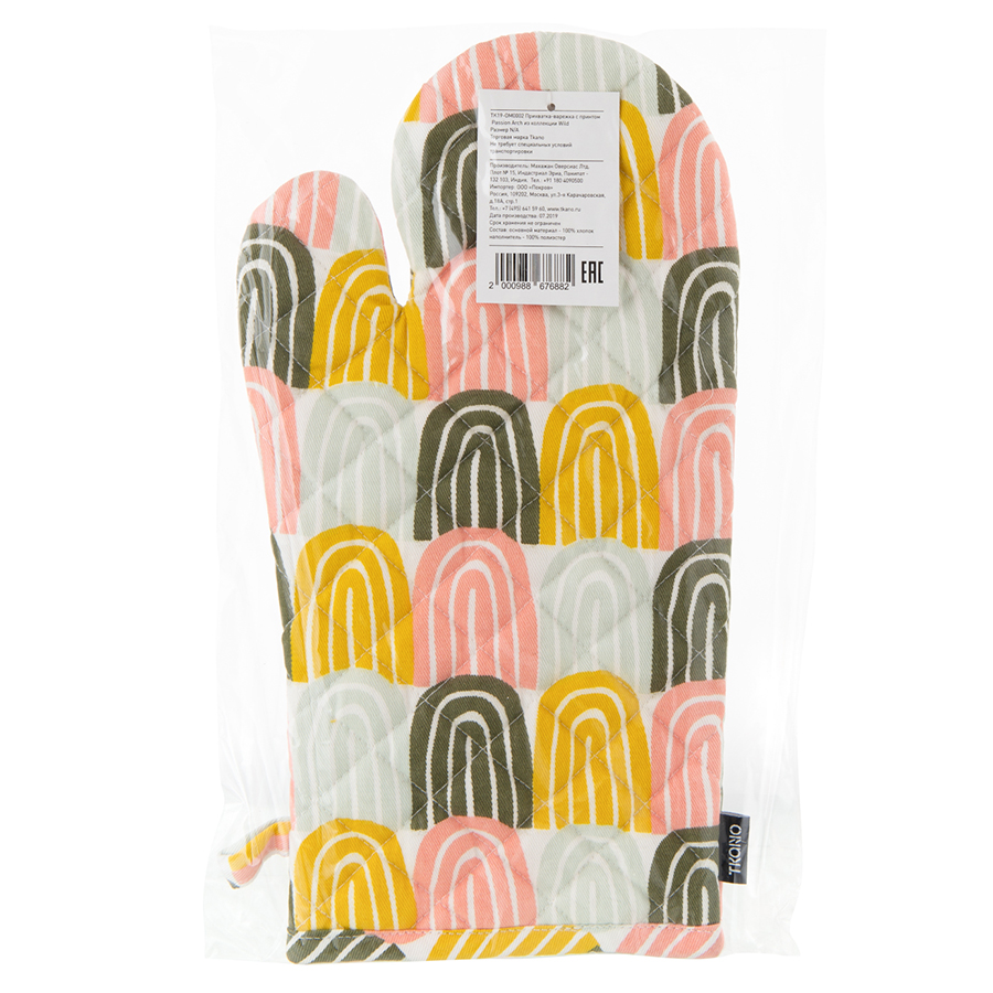 "Дизайнеры украсили кухонную прихватку-варежку колоритным рисунком Passion Arch. Модель выполнена из прочного мягкого хлопка, который не вызывает аллергию. Тонкий и мягкий наполнитель обеспечивает комфорт во время готовки, снижая риск обжечься об горячую поверхность.