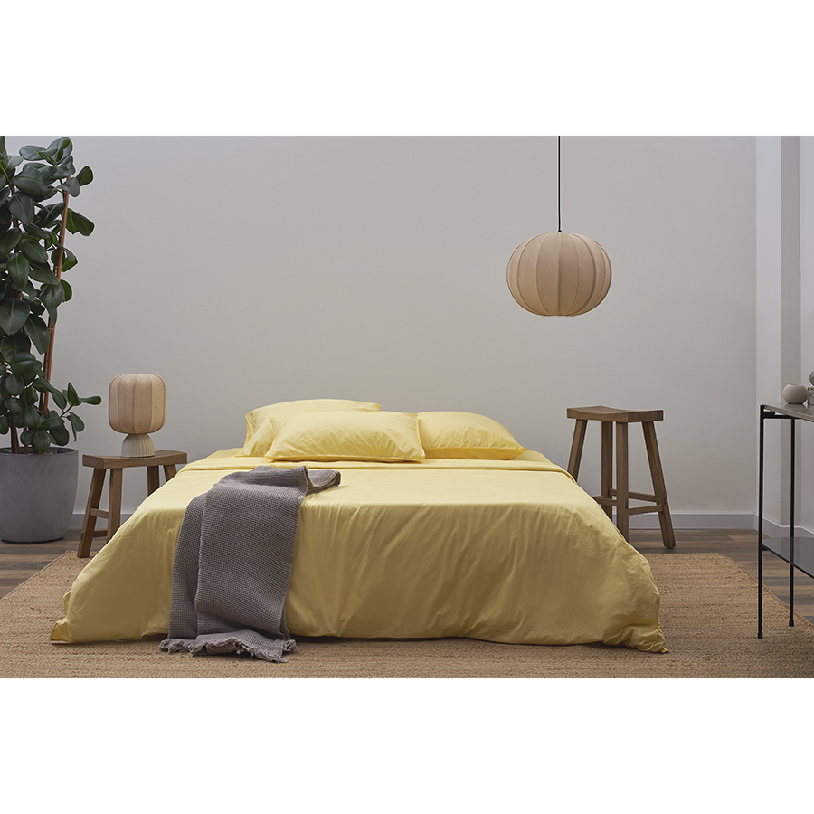 "Постельное белье из коллекции Essential позволяет погрузиться в мир гармонии и уюта. Простыня из стираного перкаля светло-желтого цвета дарит приятные тактильные ощущения, радуя своим премиальным качеством. Мягкая фактура, натуральный состав и дышащие свойства материала создают идеальные условия для комфортного отдыха и сна.