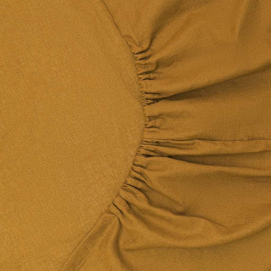 "Простыня на резинке изо льна и хлопка цвета карри из коллекции Essential – стильное постельное белье высочайшего качества, которое подарит ощущение комфорта во время сна и привнесет в интерьер спальни природную элегантность.