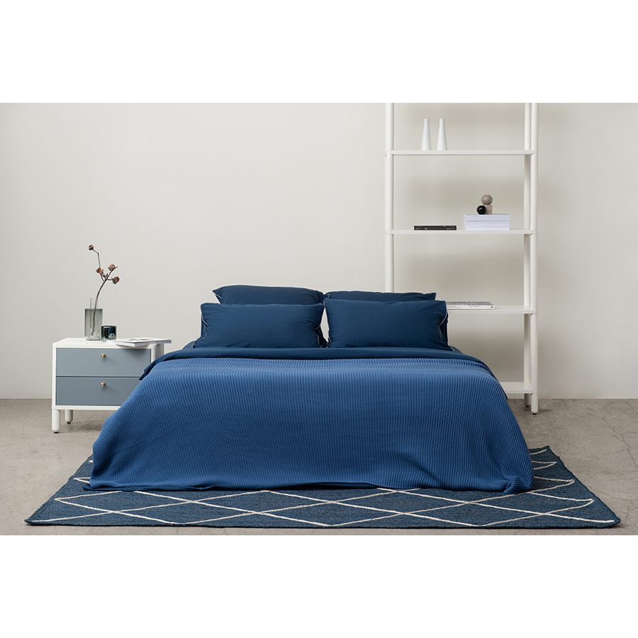 "Натяжная простыня темно-синего цвета из коллекции Essential – практичное базовое решение для спальни в любом интерьере. Изделие хорошо фиксируется на матрасе и не соскальзывает во время сна. В составе материала хлопок и тенсель (,эвкалиптовое волокно),. Хлопок придает изделию легкость и отличные гигроскопические свойства. Благодаря тенселю ткань обладает бактерицидными свойствами и повышенной прочностью, меньше мнется и очень приятна к телу, напоминая одновременно шерсть и лен, поскольку сохраняет тепло и дает ощущение прохлады. Тенсель относится к экологически чистым волокнам, его производство не загрязняет окружающую среду.