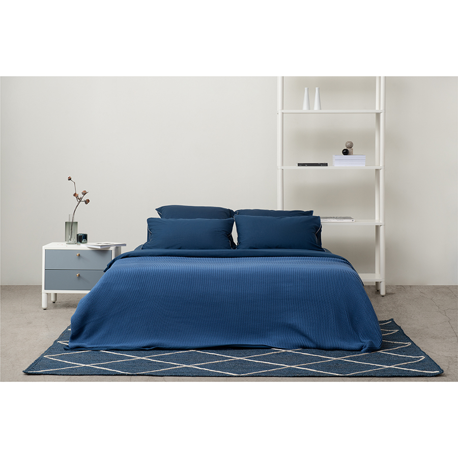 "Простыня темно-синего цвета с контрастным кантом из коллекции Essential – отличный вариант для тех, кто любит однотонное качественное постельное белье. В составе материала хлопок и тенсель (,эвкалиптовое волокно),. Хлопок придает изделию легкость и отличные гигроскопические свойства. Благодаря тенселю ткань обладает бактерицидными свойствами и повышенной прочностью, меньше мнется и очень приятна к телу, напоминая одновременно шерсть и лен, поскольку сохраняет тепло и дает ощущение прохлады. Тенсель относится к экологически чистым волокнам, его производство не загрязняет окружающую среду.
