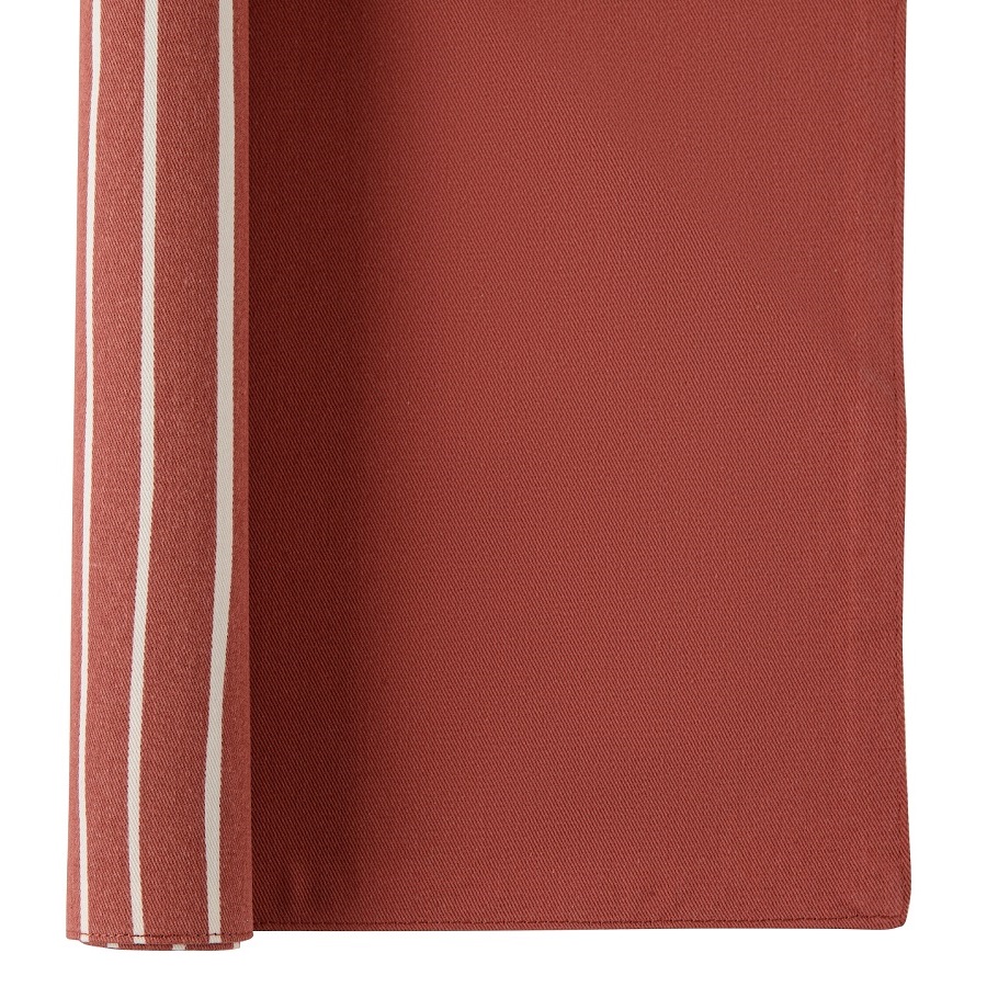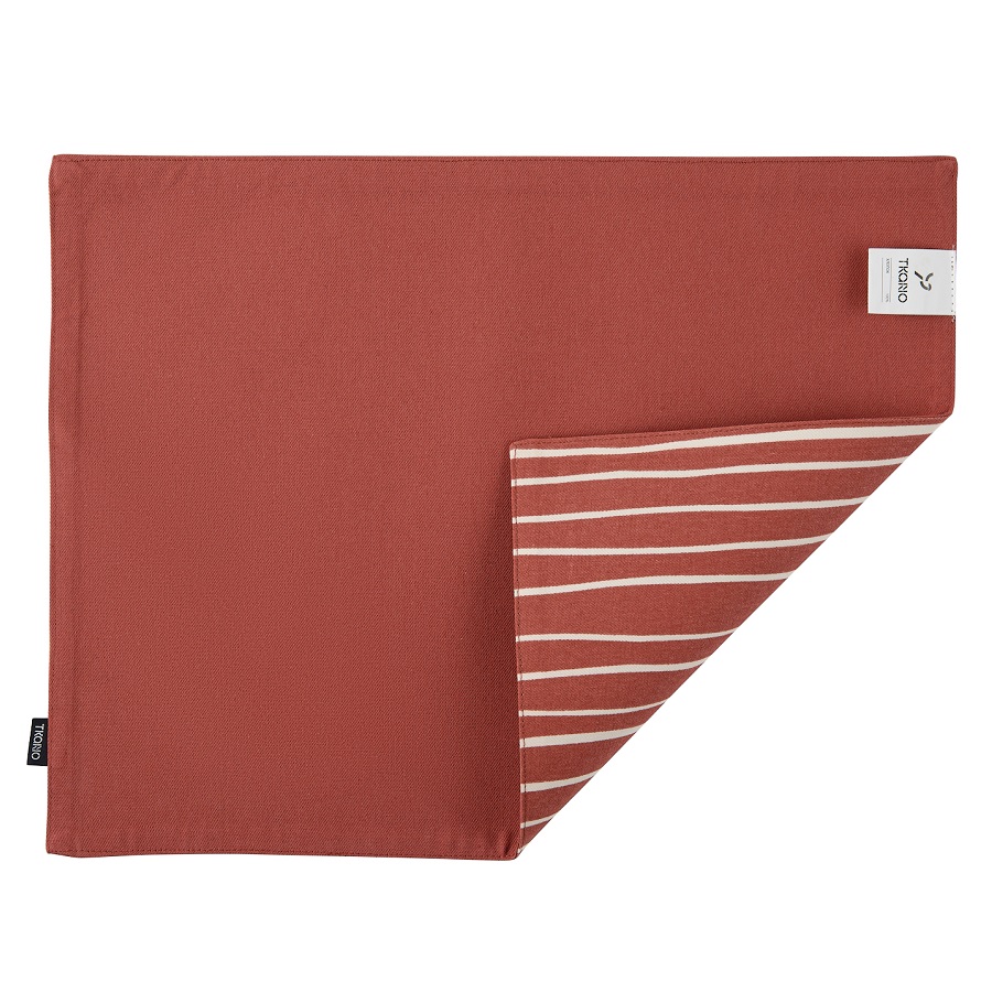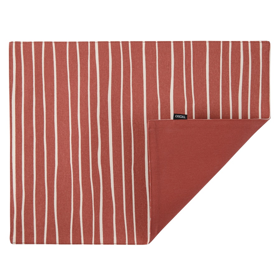 "Двухсторонняя салфетка под приборы терракотового цвета с принтом Полоски из коллекции Prairie станет украшением праздничного и повседневного стола. Одна сторона украшена светлой полоской, а другая однотонная — террактового оттенка. Такой цвет легко сочетать с другим кухонным текстилем.