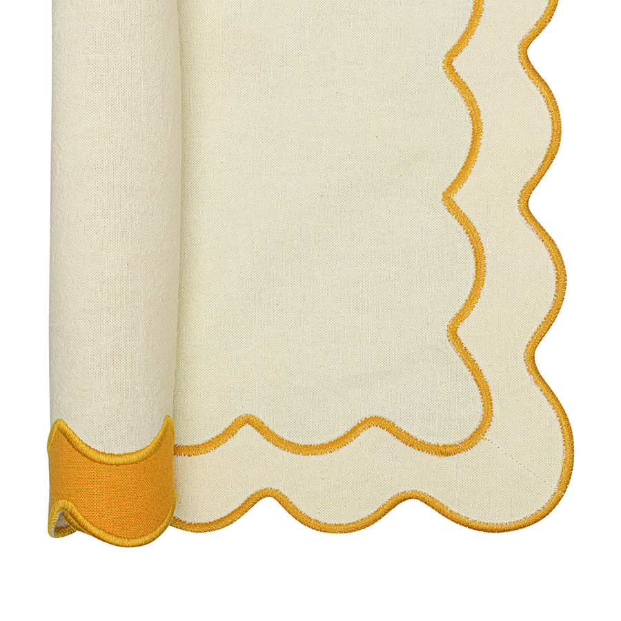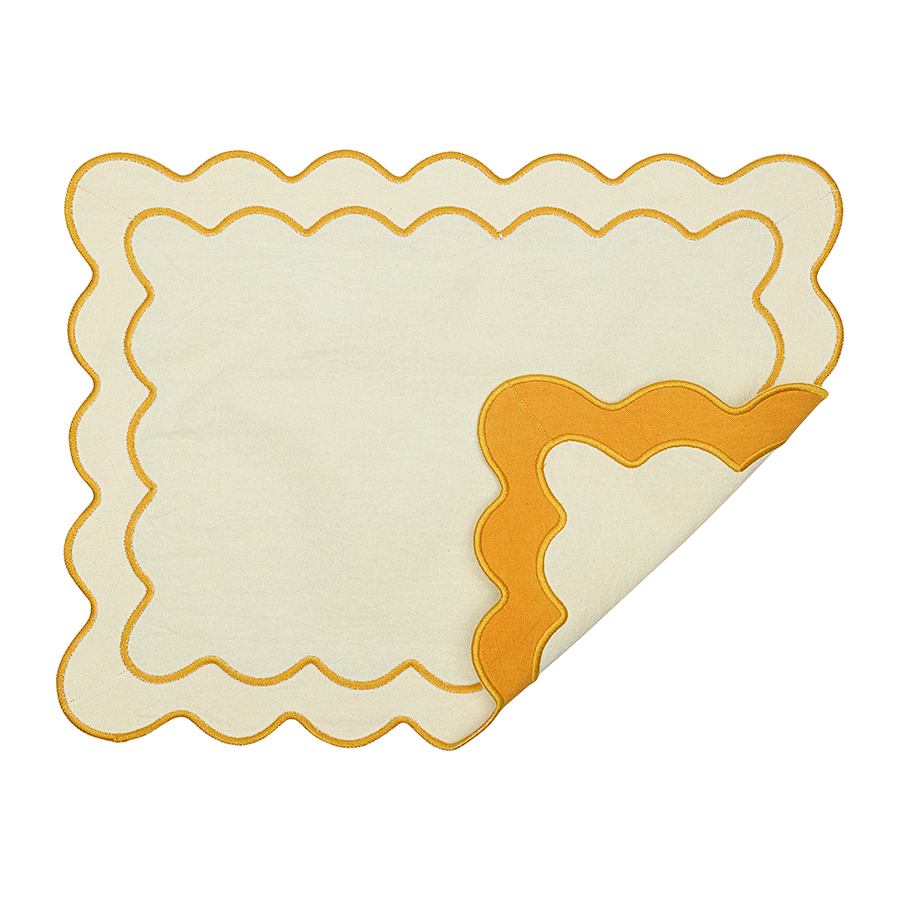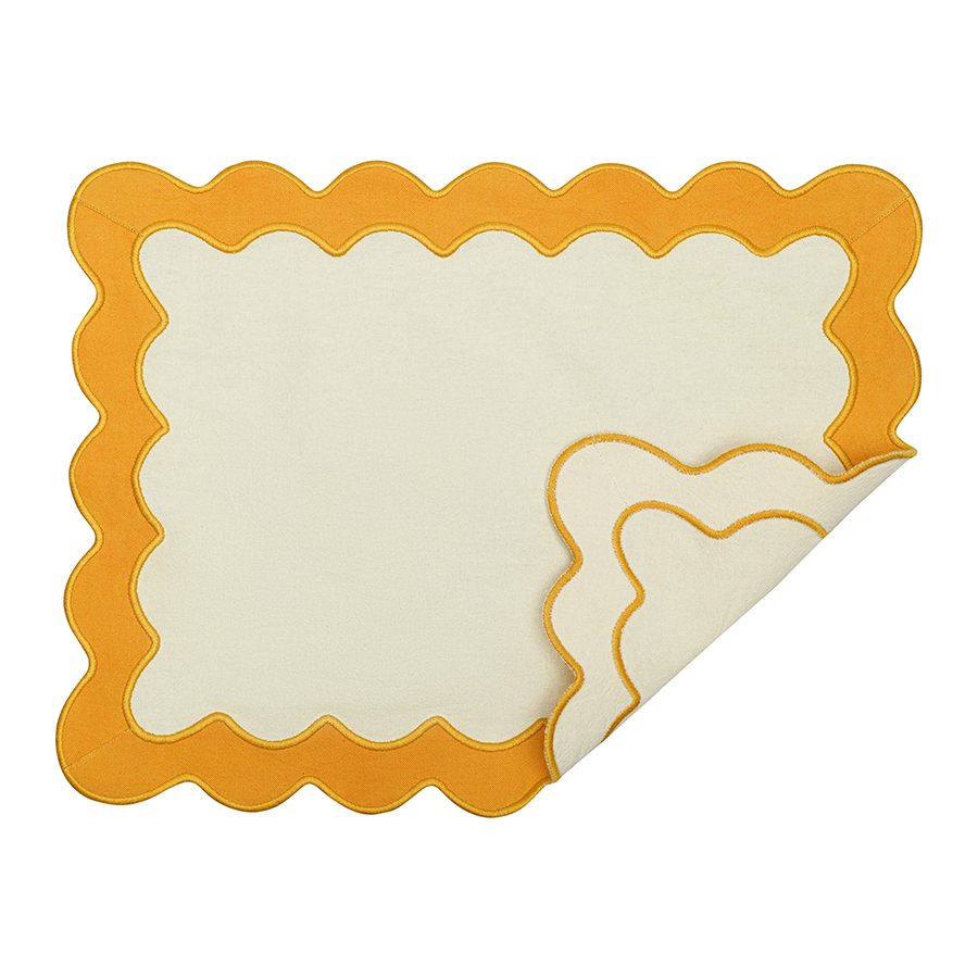 "Салфетка под приборы с контрастным кантом горчичного цвета из коллекции Trendy Ruffles сделает любую сервировку стильной, позволив экспериментировать с текстурами и формами. Текстиль с волнистой отделкой, напоминающей изящные раковины морских гребешков, стал ярким элементом стиля Ар Деко – и сейчас возвращается в моду, появляясь в самых актуальных интерьерных решениях.