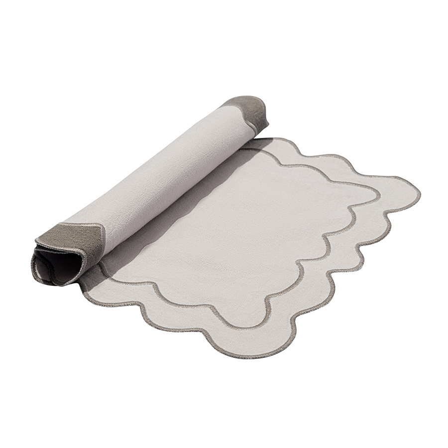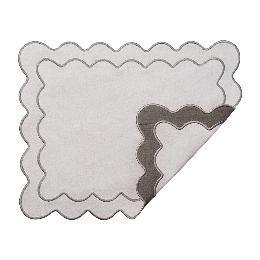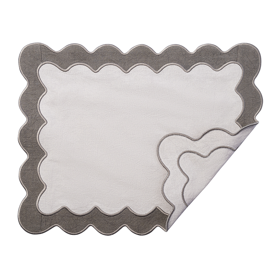 "Салфетка под приборы с контрастным кантом серого цвета из коллекции Trendy Ruffles сделает любую сервировку стильной, позволив экспериментировать с текстурами и формами. Текстиль с волнистой отделкой, напоминающей изящные раковины морских гребешков, стал ярким элементом стиля Ар Деко – и сейчас возвращается в моду, появляясь в самых актуальных интерьерных решениях.