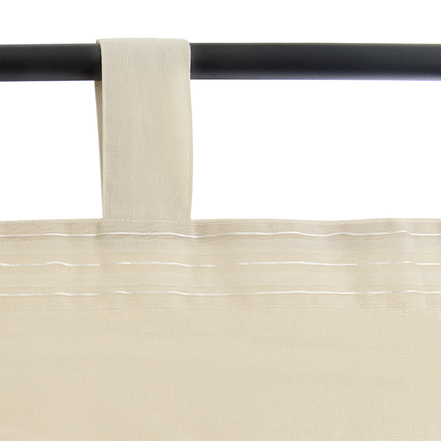 - По верхнему краю шторы предусмотрена лента с петельками для крепления на крючки и текстильные петли, которые позволяют легко разместить ее на карнизе без использования дополнительного крепежа.