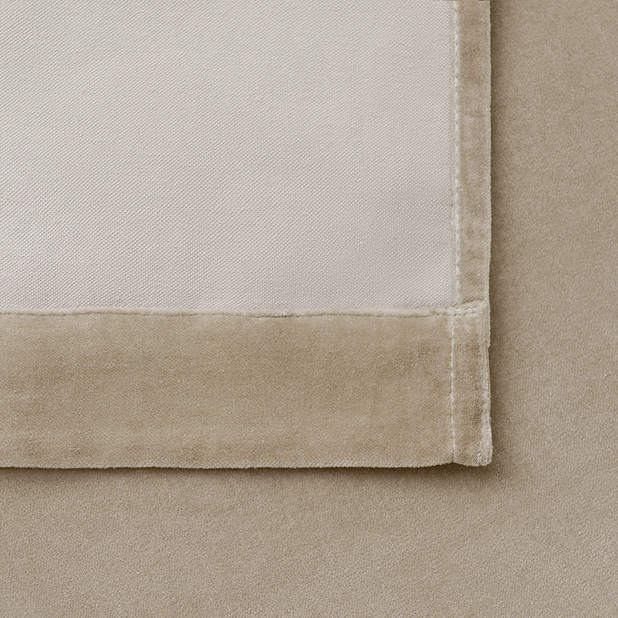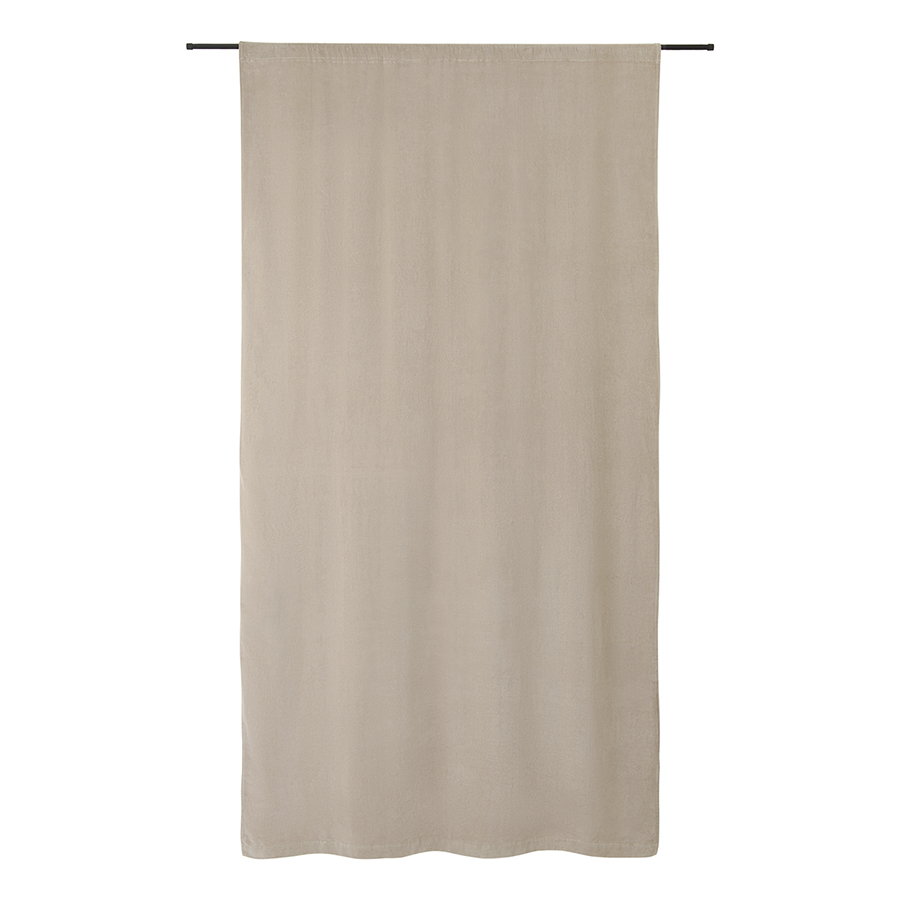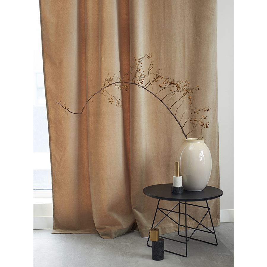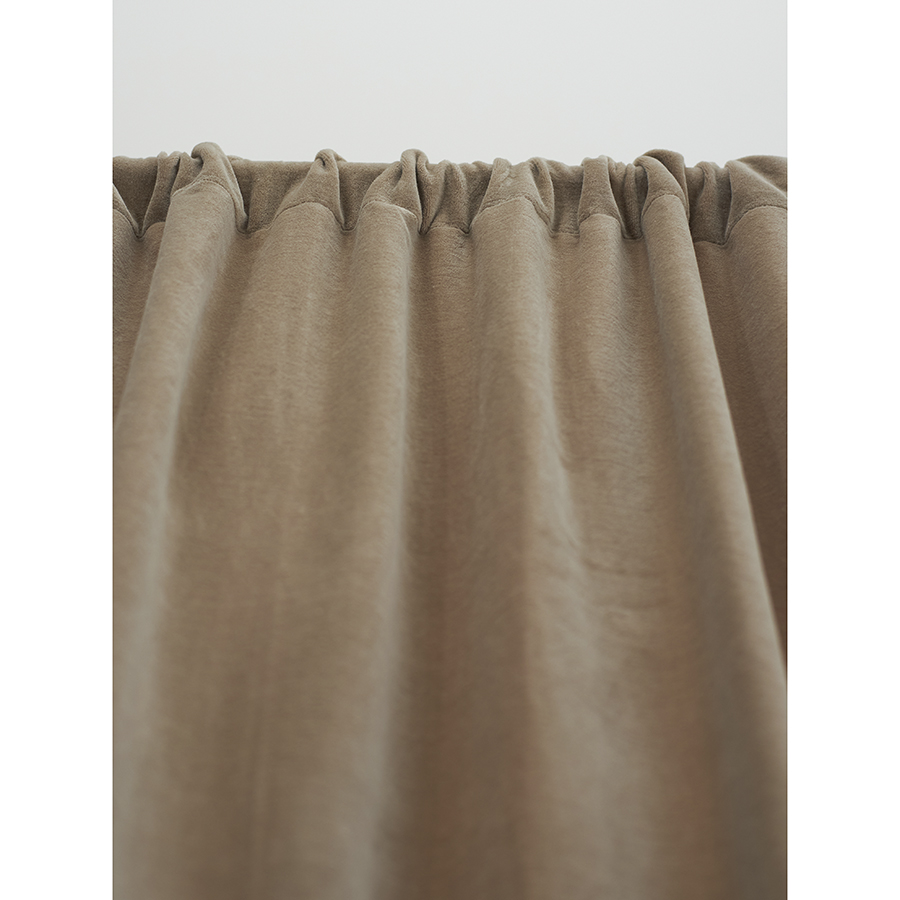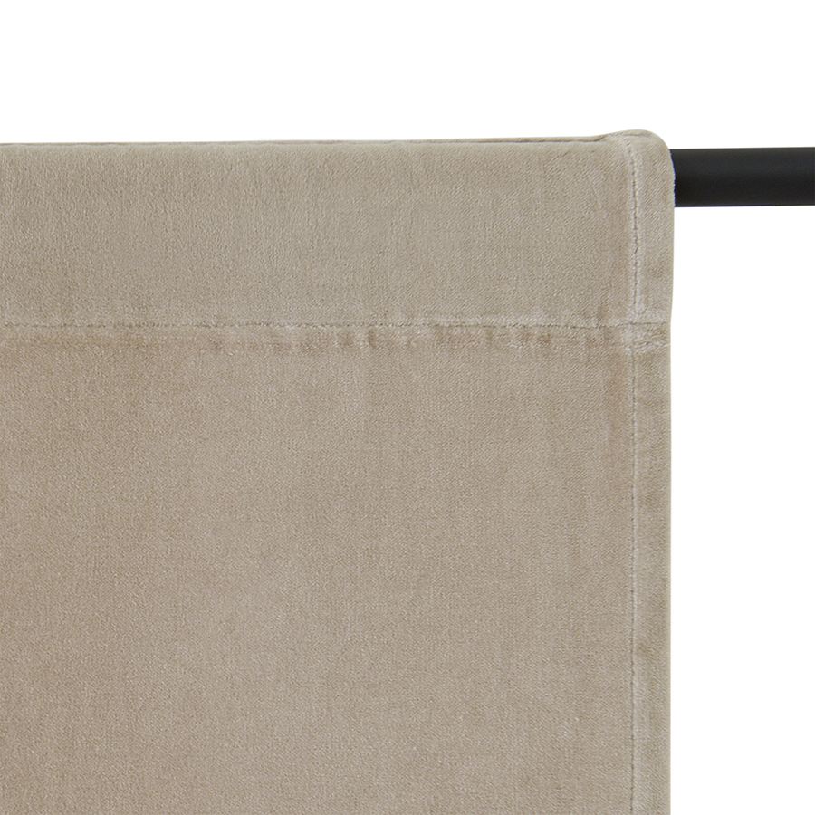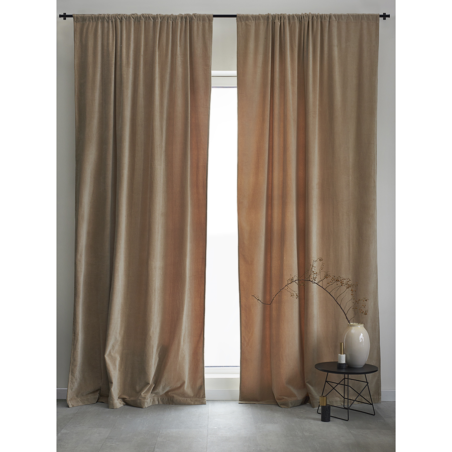 "Штора из хлопкового бархата бежевого цвета из коллекции Essential – простой способ привнести в интерьер нотки роскоши и элегантности. Материал эффектно переливается на солнце и красиво драпируется, позволяя создавать интересные визуальные акценты. Текстиль отлично сочетается как с классическим, так и современным дизайном, в том числе с грубой отделкой в виде кирпичной кладки и штукатурки.