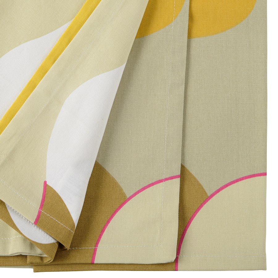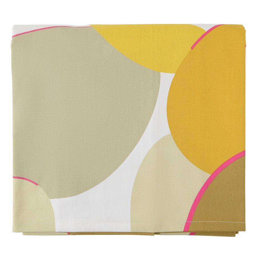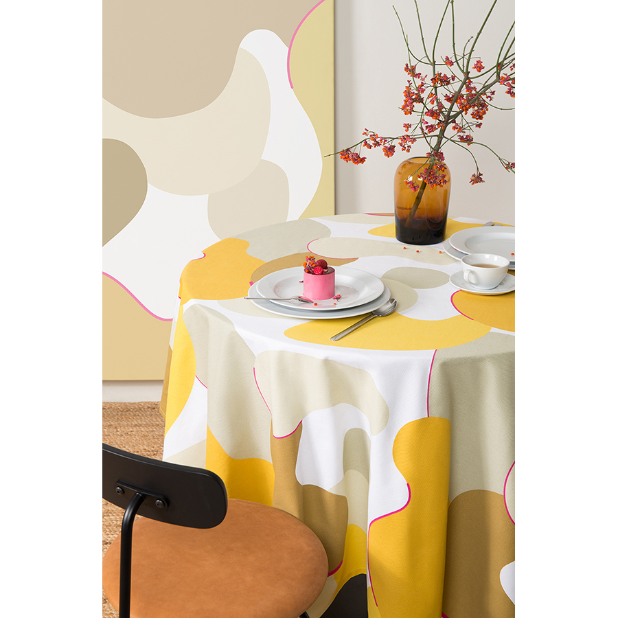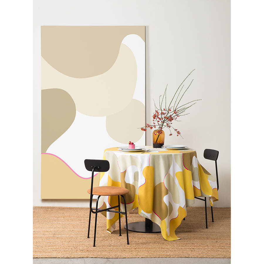 "Скатерть из хлопка горчичного цвета с авторским принтом из коллекции Freak Fruit станет центральным элементом сервировки стола. Абстрактный принт не имеет повторяющегося раппорта и представляет собой единую законченную картину.