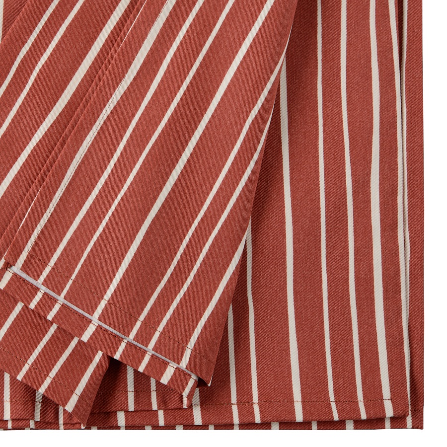 "Скатерть из хлопка терракотового цвета с принтом Полоски из коллекции Prairie станет центральным элементом сервировки стола. Терракотовый цвет легко сочетать с другим кухонным текстилем, а светлая полоска разбавит однотонные изделия. Модель выполнена из прочного, экологически чистого хлопка. Износостойкий материал хорошо впитывает влагу и не деформируется даже после множества стирок. Тип плетения: твил. Плотность ткани - 215GSM.