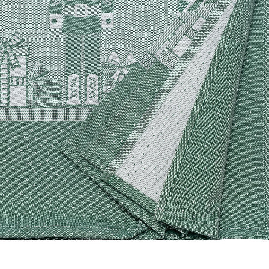 "Скатерть из хлопка зеленого цвета с жаккардовым , ,рисунком Щелкунчик из коллекции New Year Essential украсит праздничный новогодний стол и внесет разнообразие в повседневную зимнюю сервировку. Новогодняя сказка, любимая всеми с детства, стилизованная в оригинальном дизайне скатерти, органично впишется в любой современный интерьер. Модель выполнена из плотного хлопка - прочного материала, который хорошо впитывает влагу и не деформируется после множества стирок.